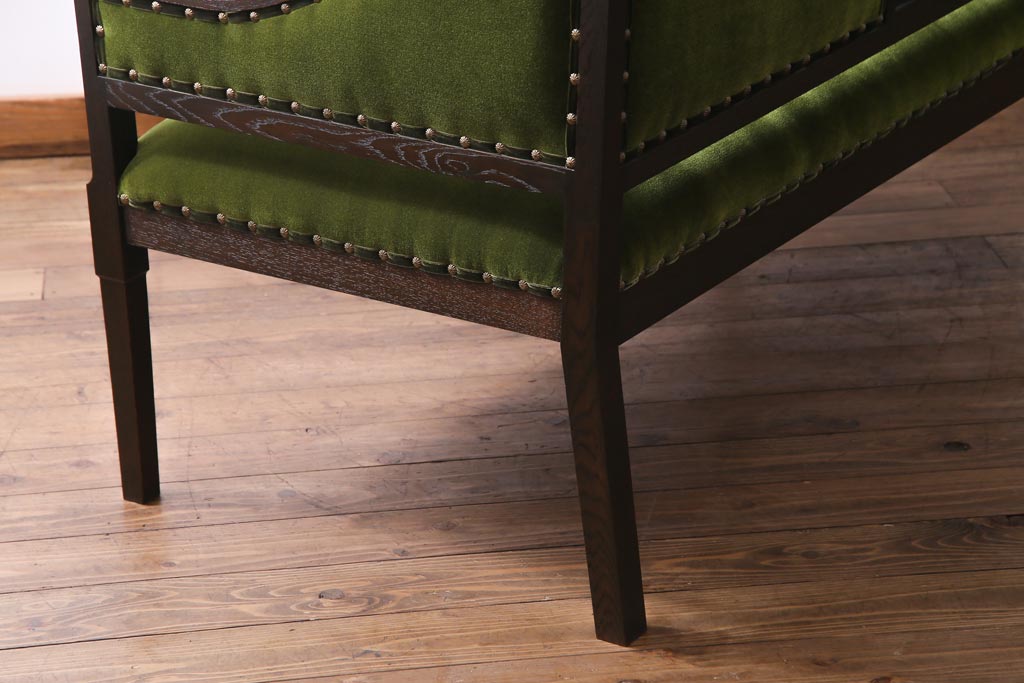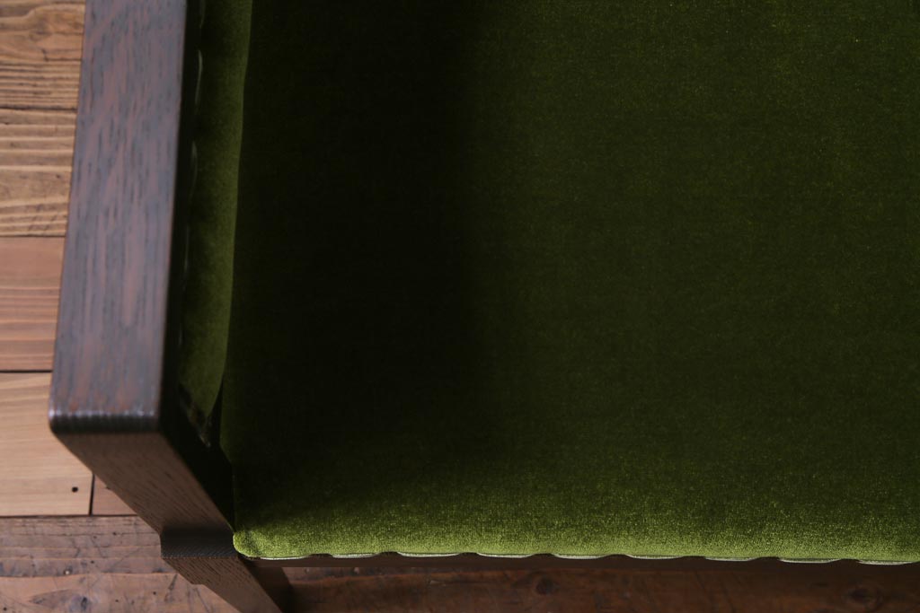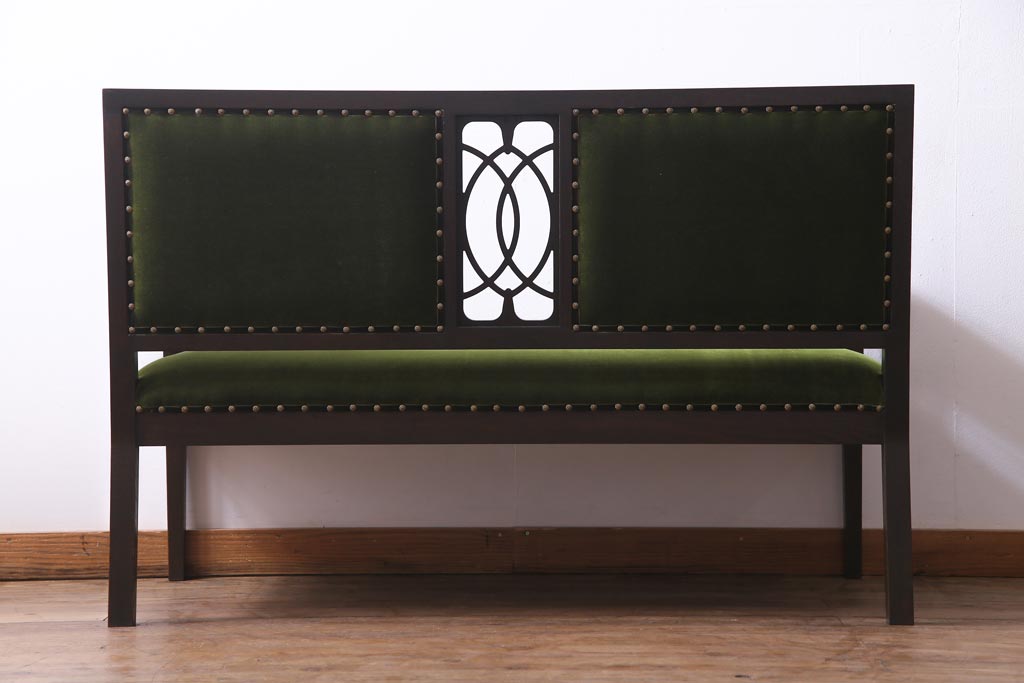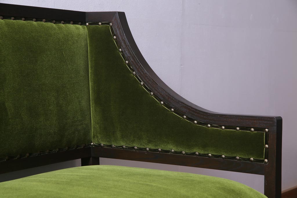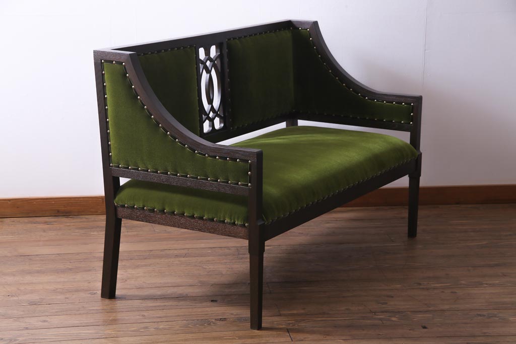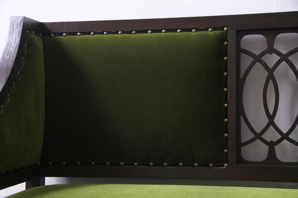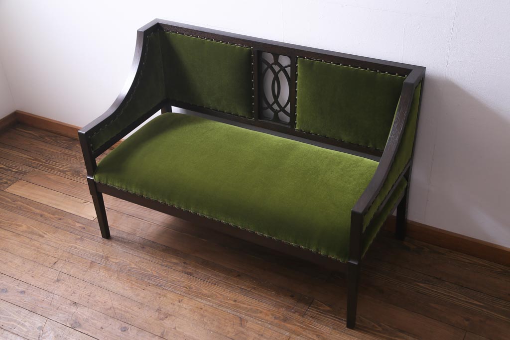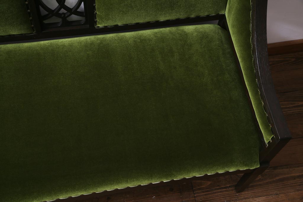ソファ> 2人掛けソファ > 大正ロマンな2人掛けソファを新規製作!背もたれに透かし彫りを製作し取付け。座面と背もたれに深いグリーンのベルベット生地を使用。(2Pソファ)