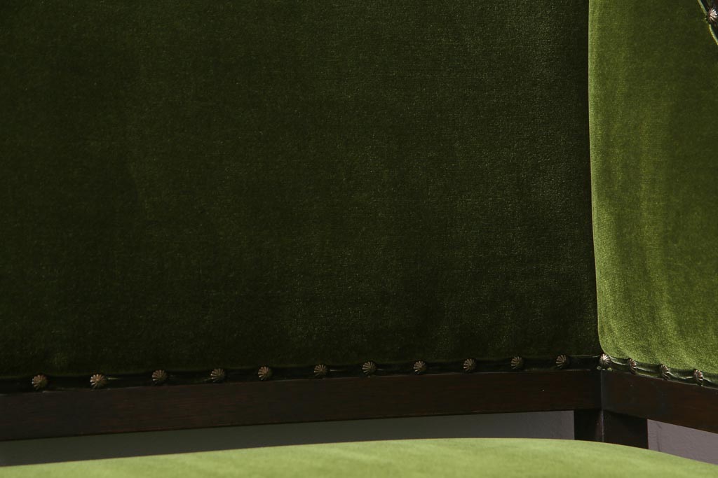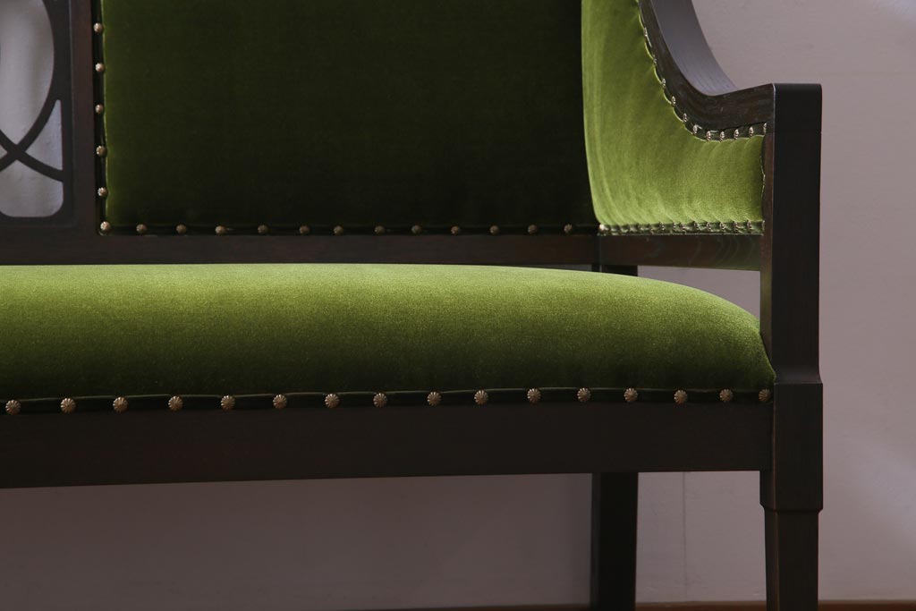フルオーダー家具実績 > 大正ロマンな2人掛けソファを新規製作!背もたれに透かし彫りを製作し取付け。座面と背もたれに深いグリーンのベルベット生地を使用。(2Pソファ)
