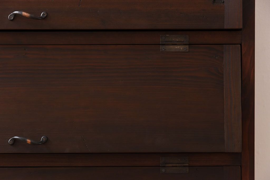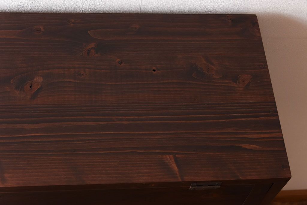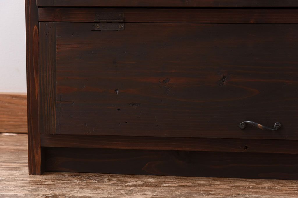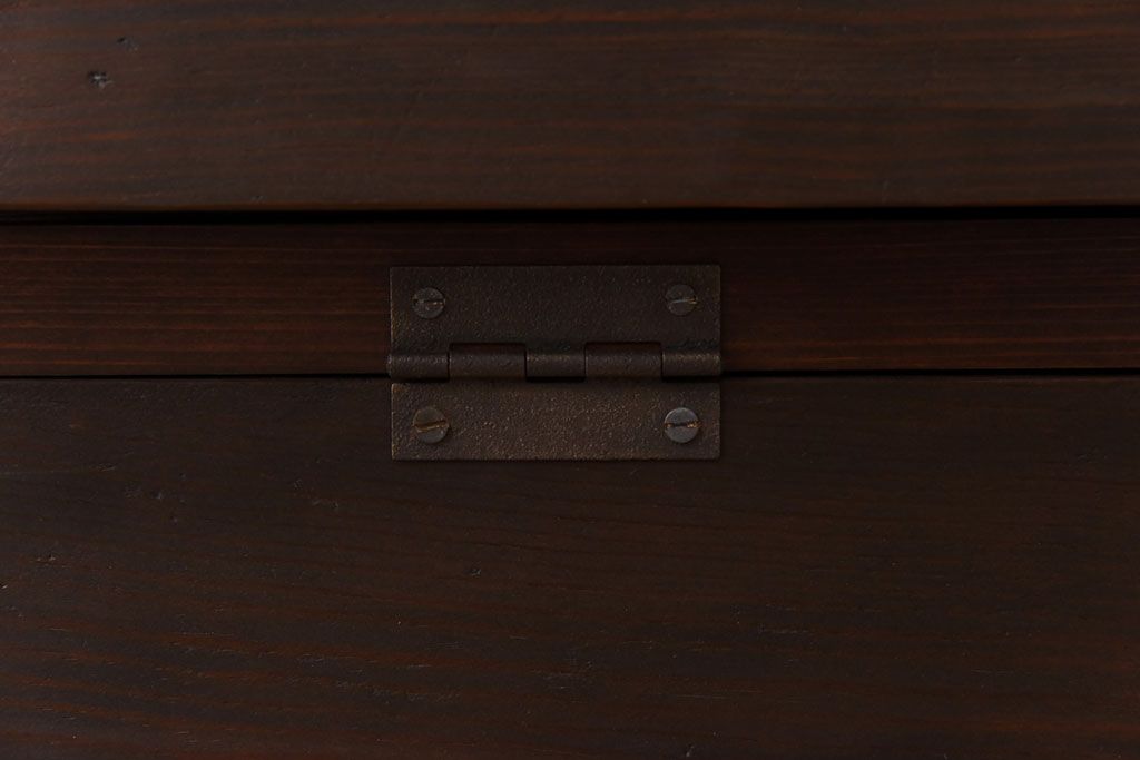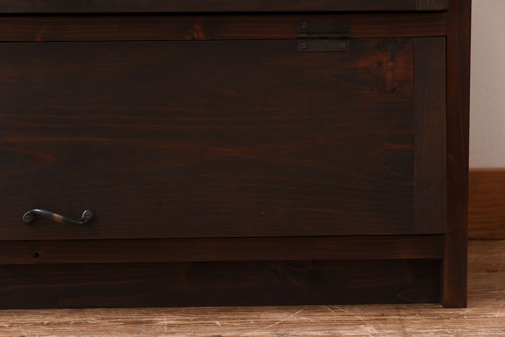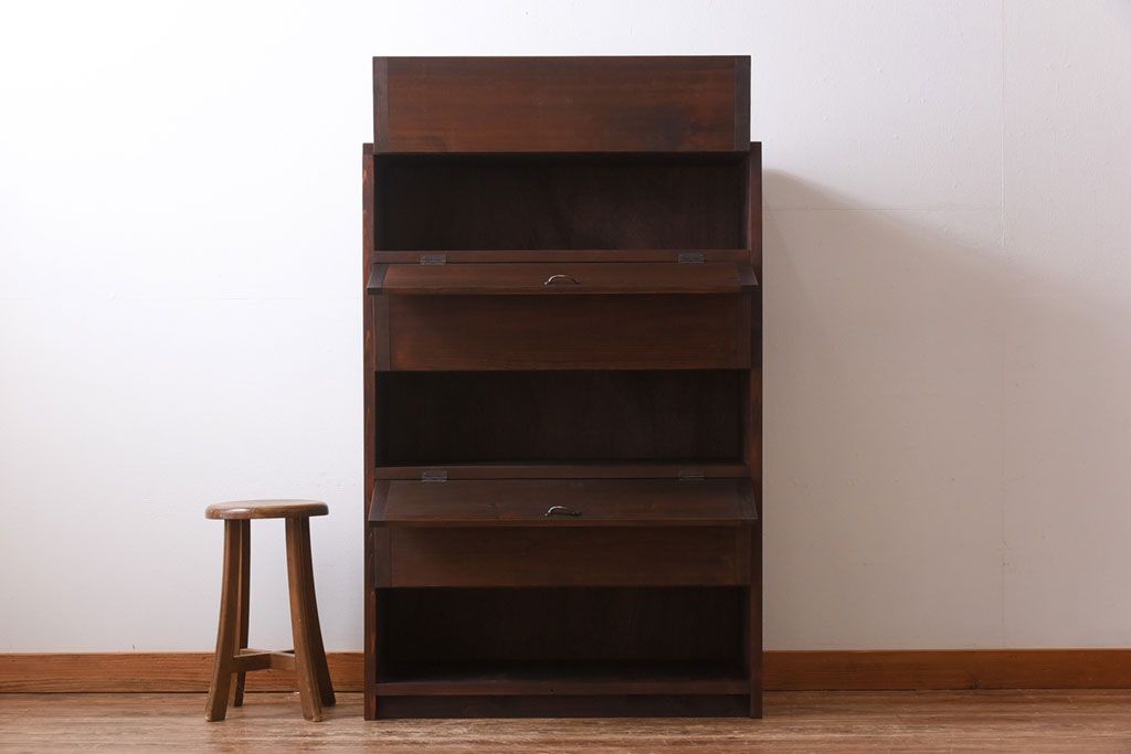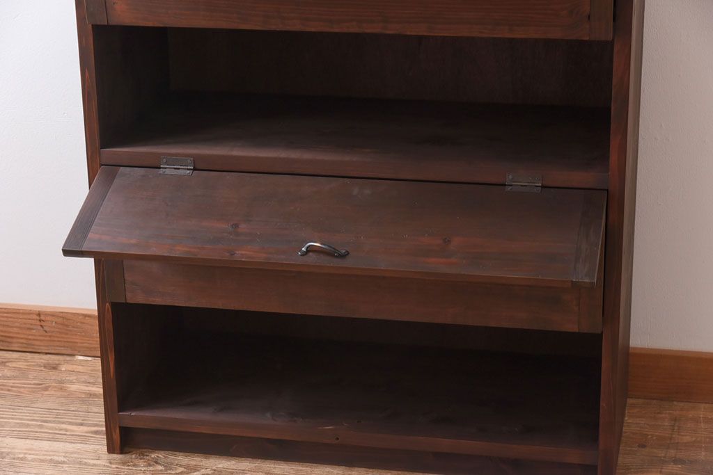 ワードローブ・ロッカー> ロッカー > パタパタ扉の収納棚を新規製作!本体は新材、扉は古材を使用。引手を取り付け。濃い茶色で着色し仕上げ。(下駄箱、ロッカー、キャビネット)