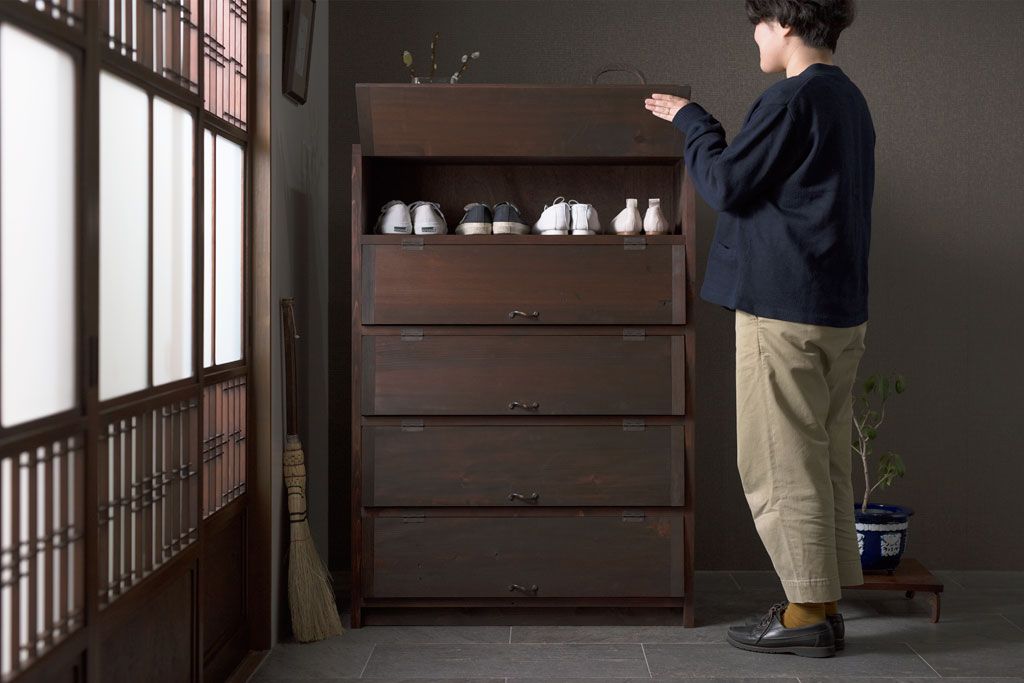 ワードローブ・ロッカー > パタパタ扉の収納棚を新規製作!本体は新材、扉は古材を使用。引手を取り付け。濃い茶色で着色し仕上げ。(下駄箱、ロッカー、キャビネット)