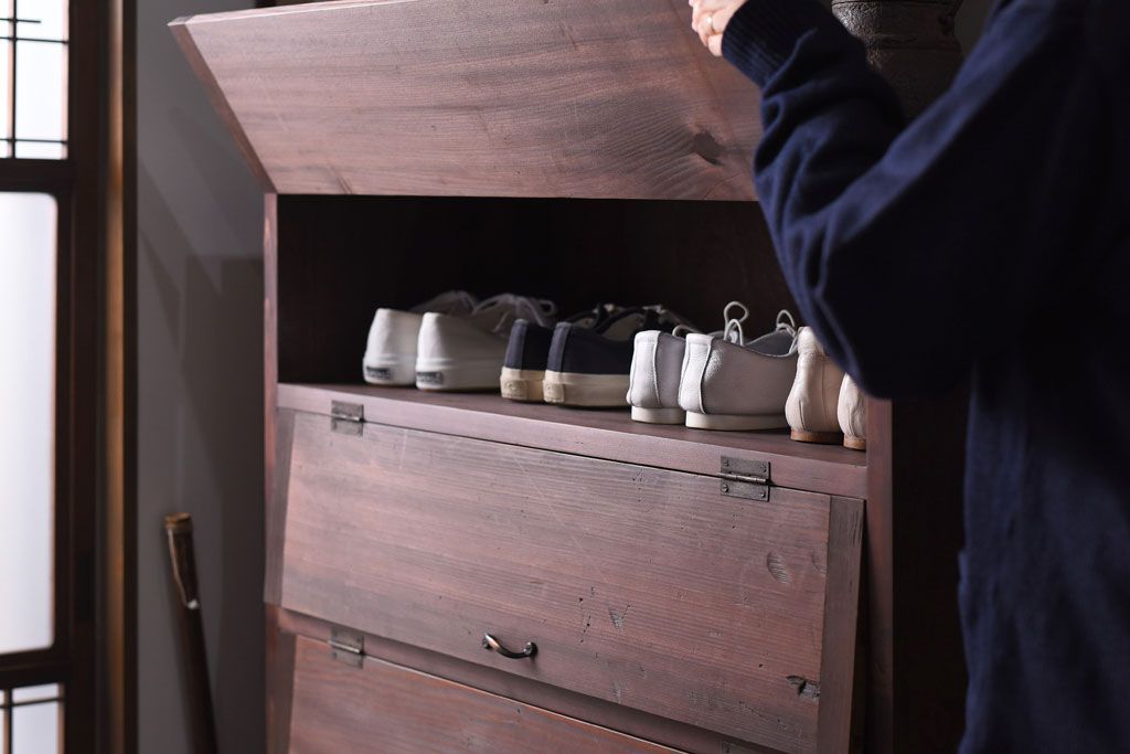 フルオーダー家具実績 > パタパタ扉の収納棚を新規製作!本体は新材、扉は古材を使用。引手を取り付け。濃い茶色で着色し仕上げ。(下駄箱、ロッカー、キャビネット)