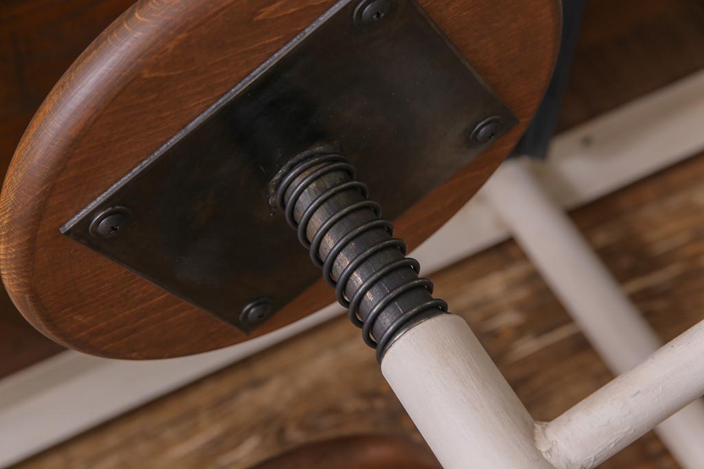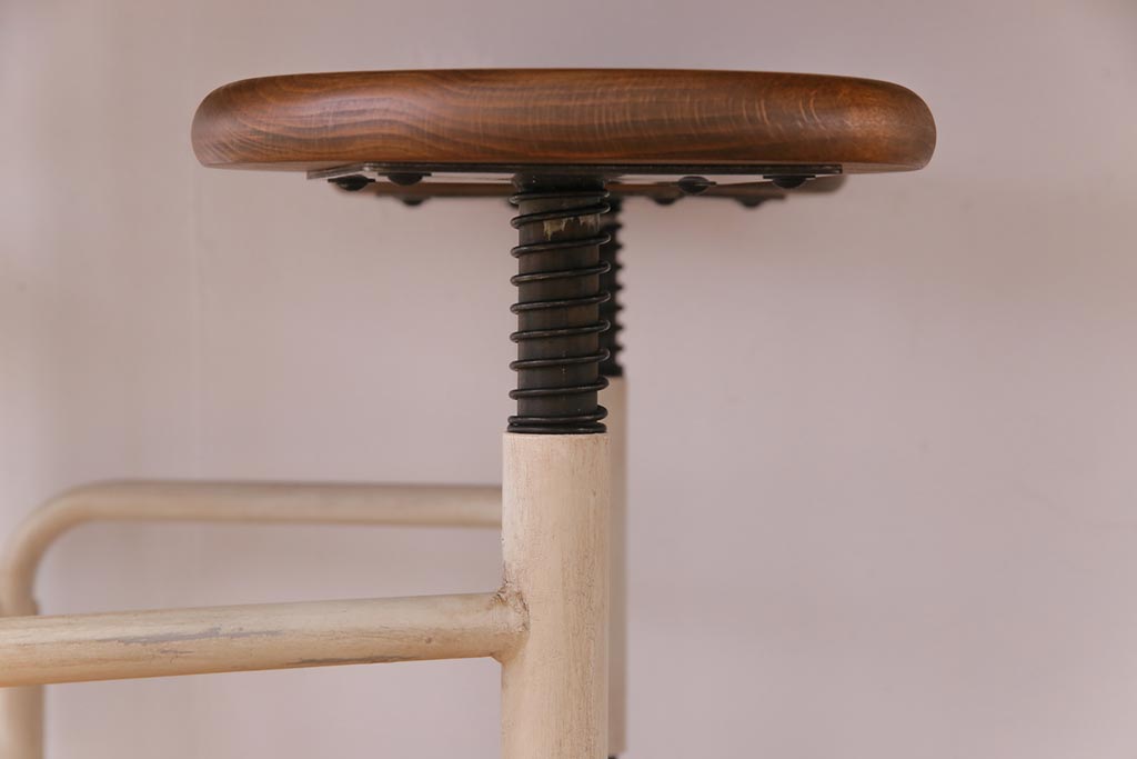スツールは引き出してから座ると人の重みで沈む仕様(手を放すとゆっくりと天板下に戻る)