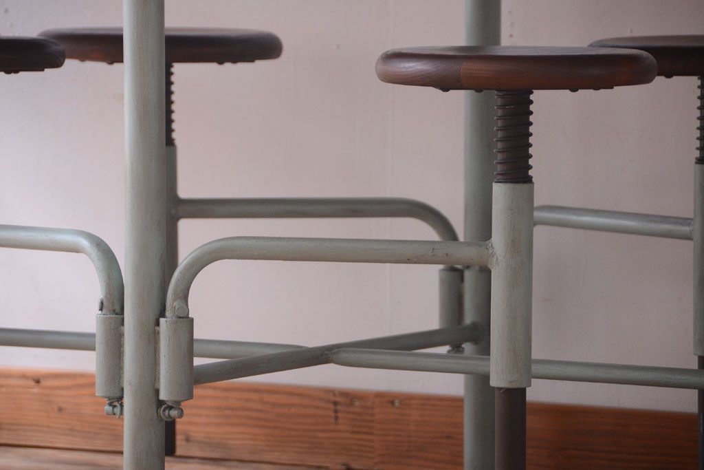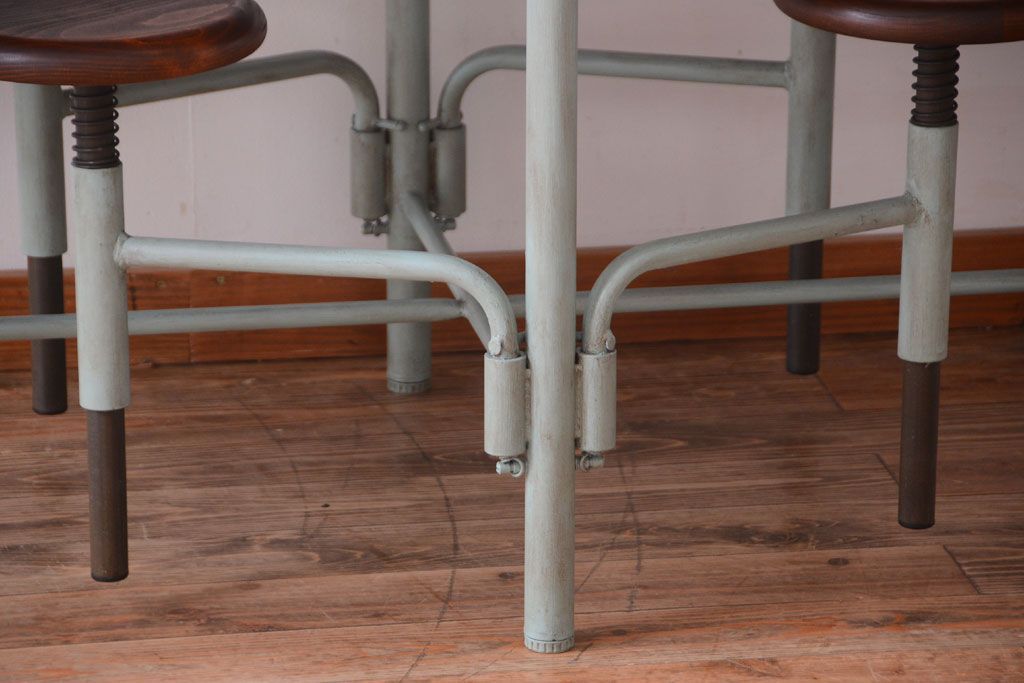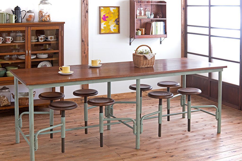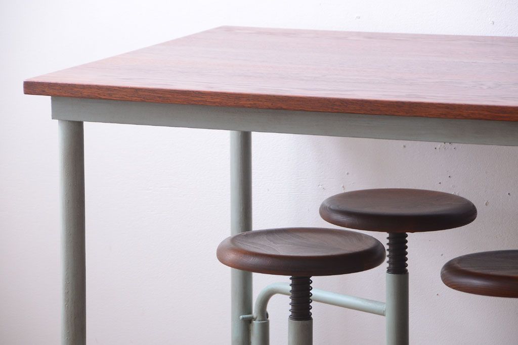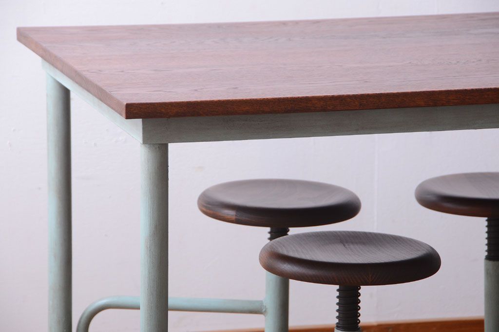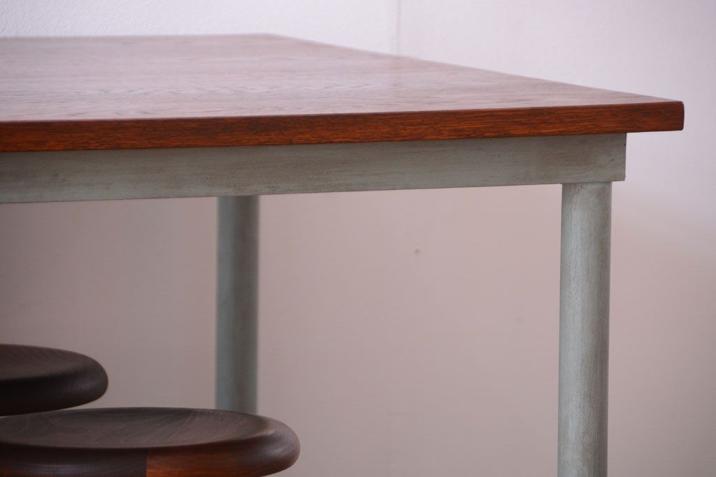 格納スツール8脚付きテーブルを新規製作!当店商品を参考にデザイン。ホワイトオーク材の天板を取り付け。淡い青緑でペイント仕上げ。(ダイニングテーブル、作業台、椅子)