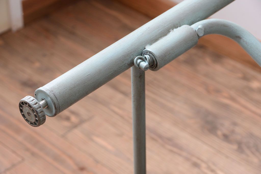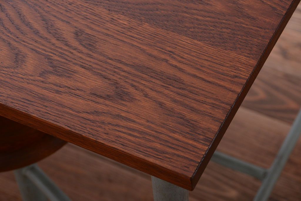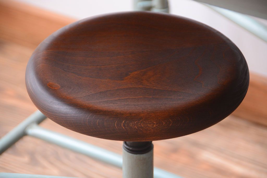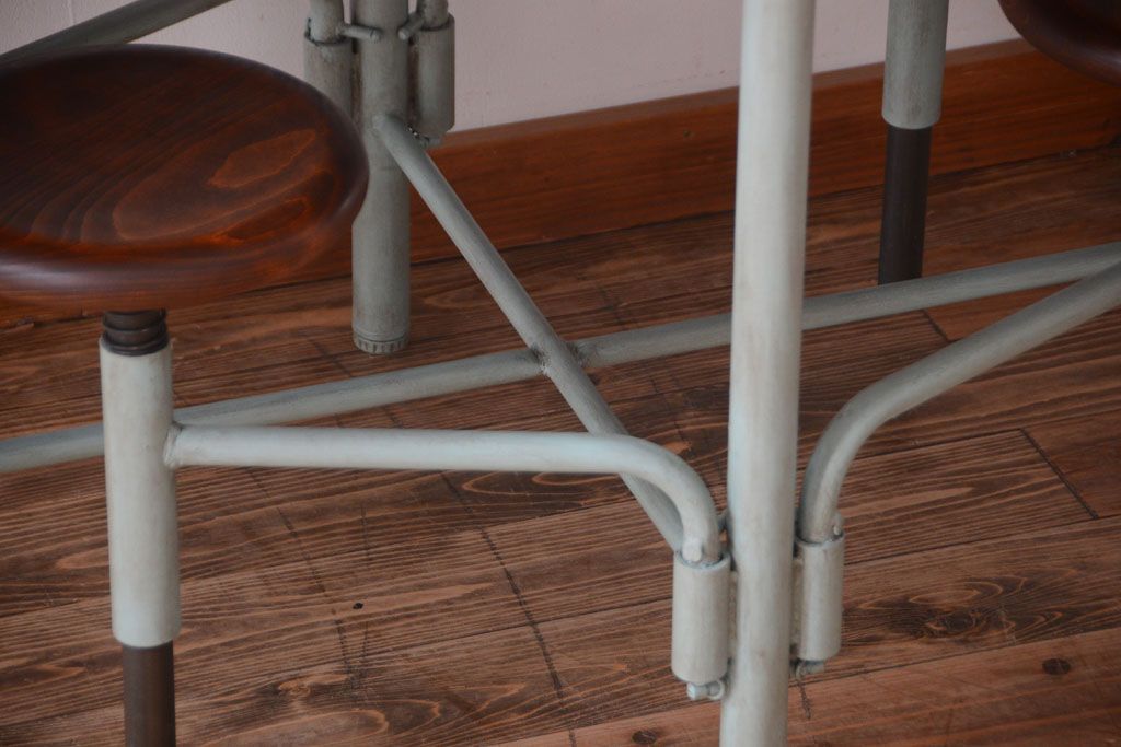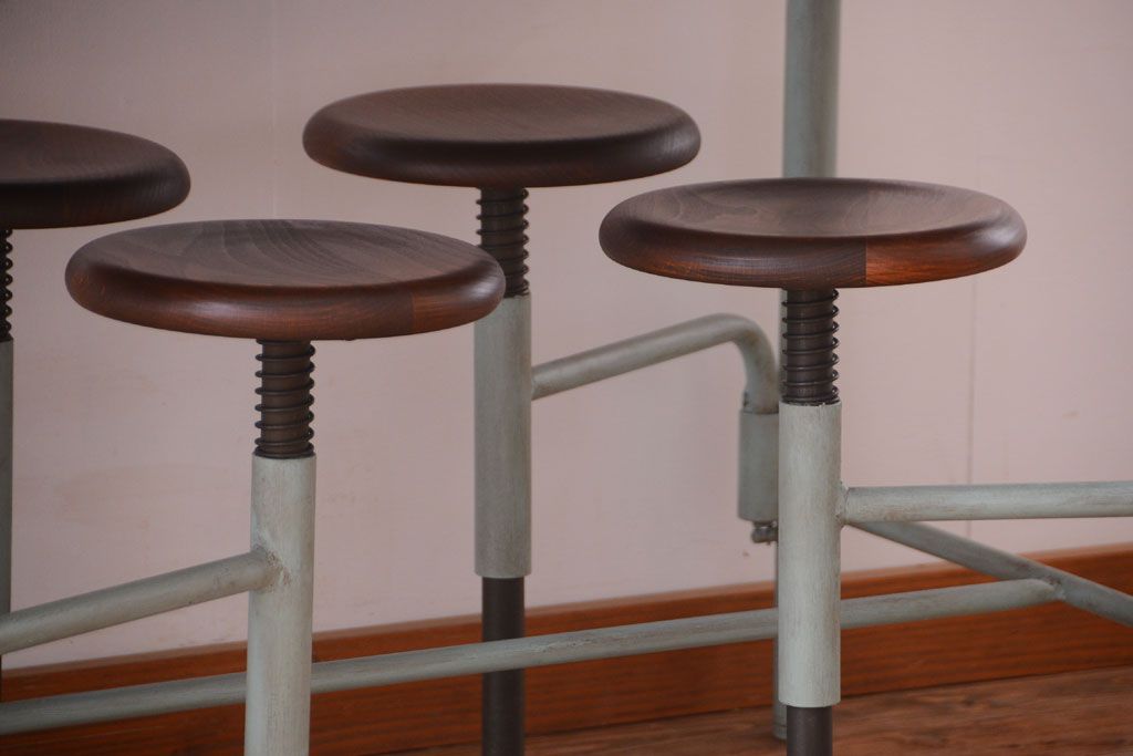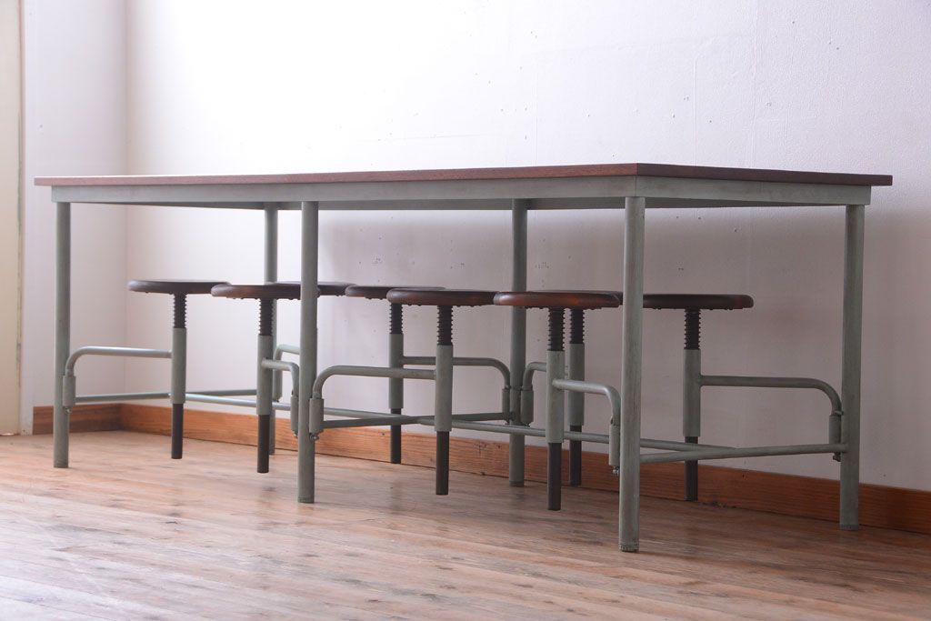 格納スツール8脚付きテーブルを新規製作!当店商品を参考にデザイン。ホワイトオーク材の天板を取り付け。淡い青緑でペイント仕上げ。(ダイニングテーブル、作業台、椅子)