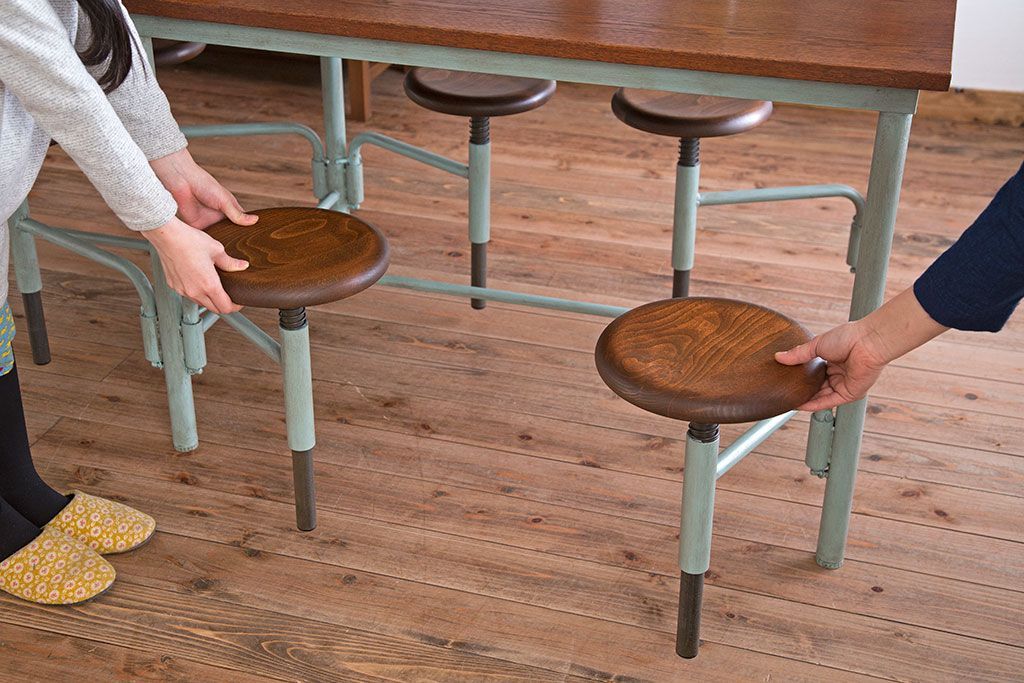 フルオーダー家具実績 > 格納スツール8脚付きテーブルを新規製作!当店商品を参考にデザイン。ホワイトオーク材の天板を取り付け。淡い青緑でペイント仕上げ。(ダイニングテーブル、作業台、椅子)