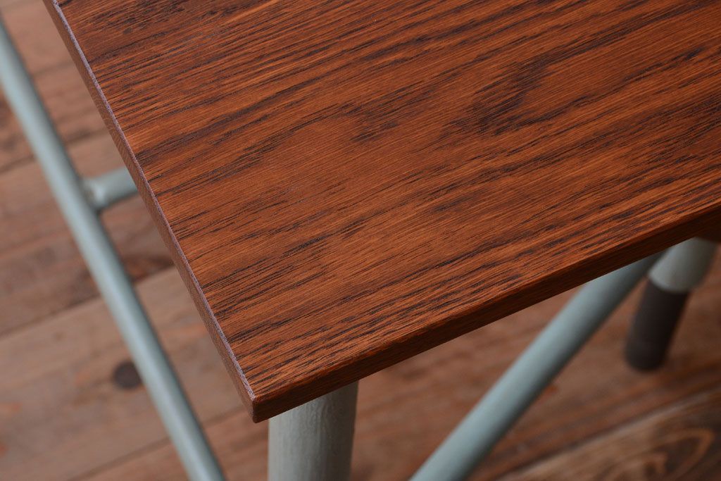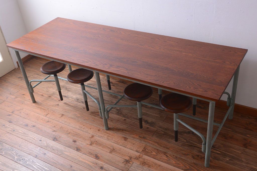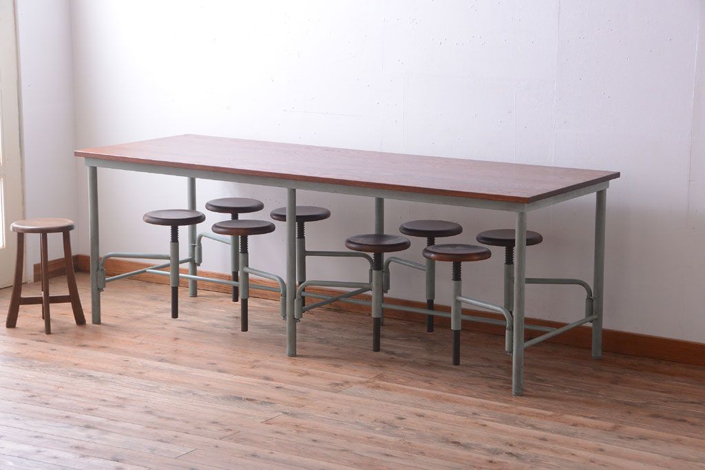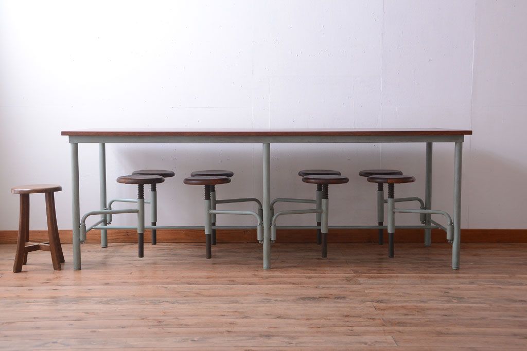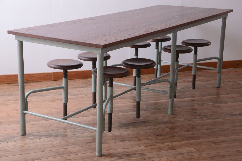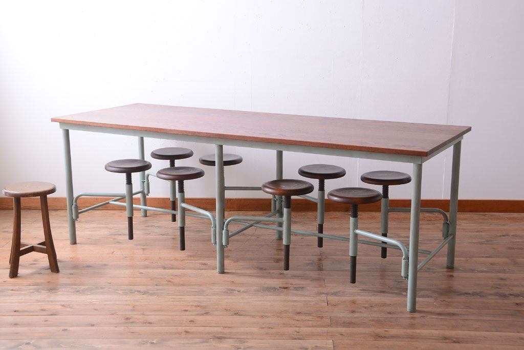 テーブル> 作業台 > 格納スツール8脚付きテーブルを新規製作!当店商品を参考にデザイン。ホワイトオーク材の天板を取り付け。淡い青緑でペイント仕上げ。(ダイニングテーブル、作業台、椅子)