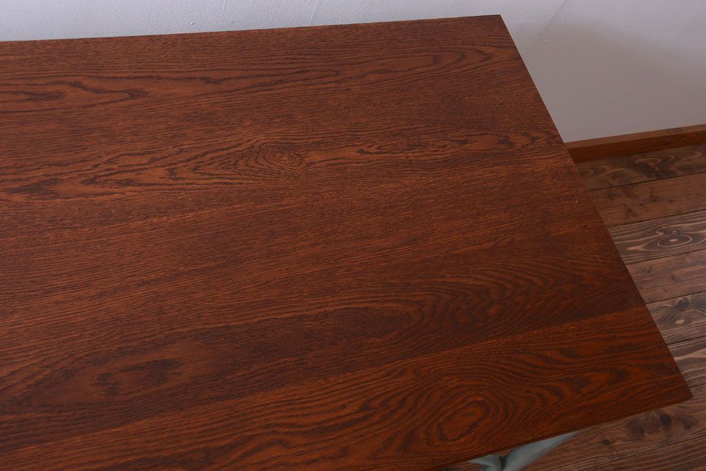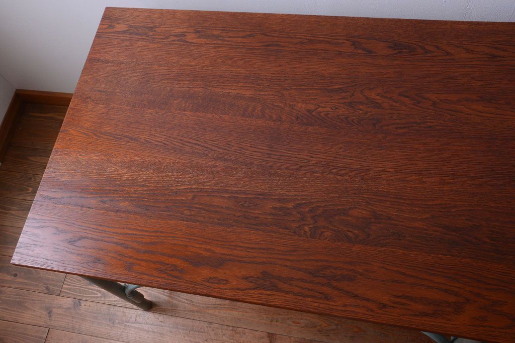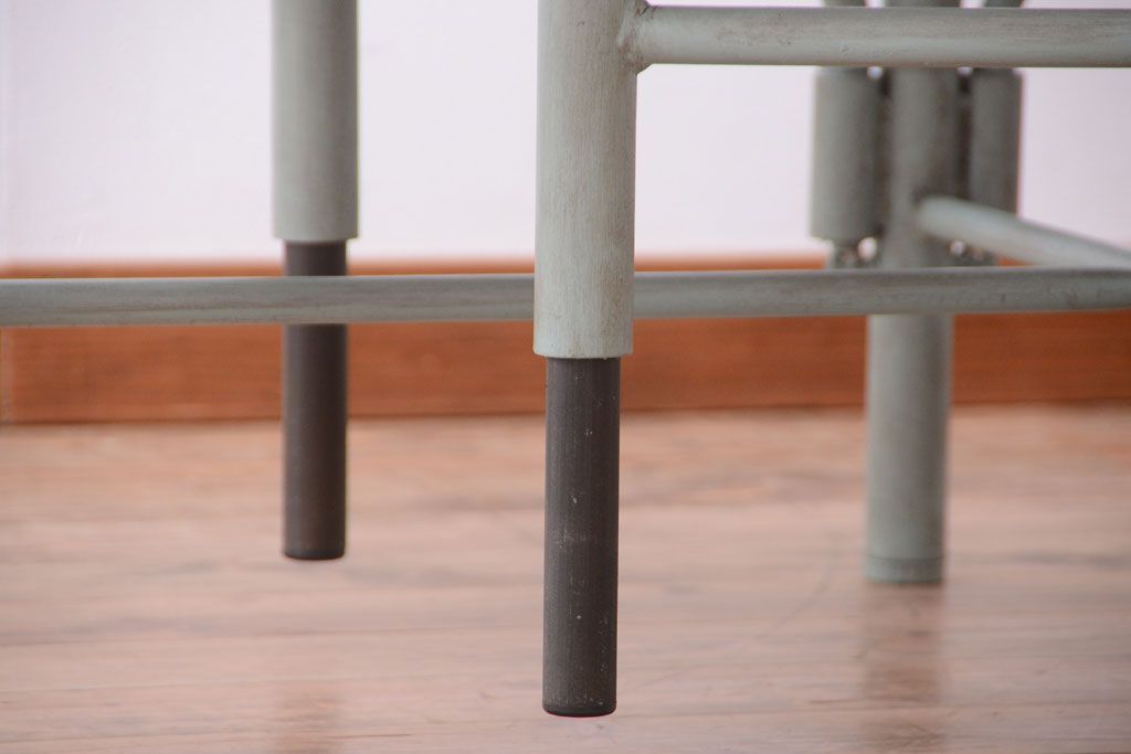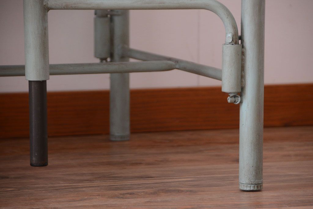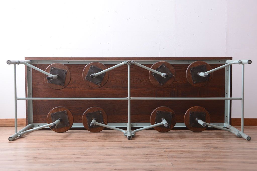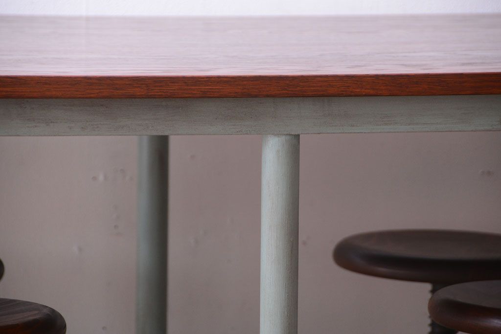 テーブル> 6人用ダイニングテーブル > 格納スツール8脚付きテーブルを新規製作!当店商品を参考にデザイン。ホワイトオーク材の天板を取り付け。淡い青緑でペイント仕上げ。(ダイニングテーブル、作業台、椅子)