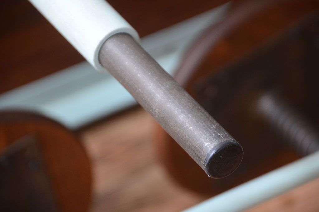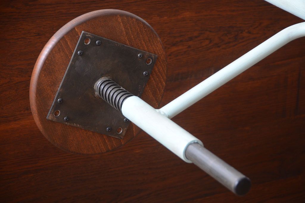 スツールは引き出してから座ると人の重みで沈む仕様(手を放すとゆっくりと天板下に戻る)