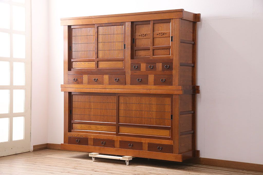 中古 民芸家具 総ニレ無垢材 凛とした佇まいが魅力的な水屋箪笥(重ね箪笥、収納棚、戸棚)(R-048815)