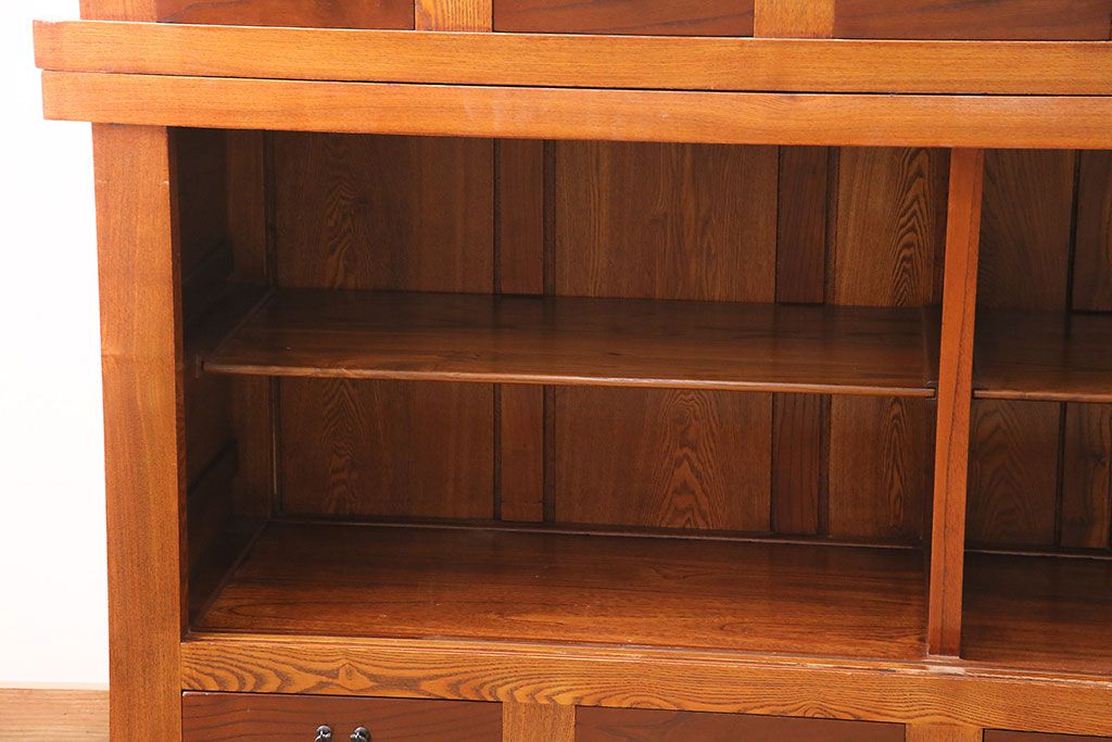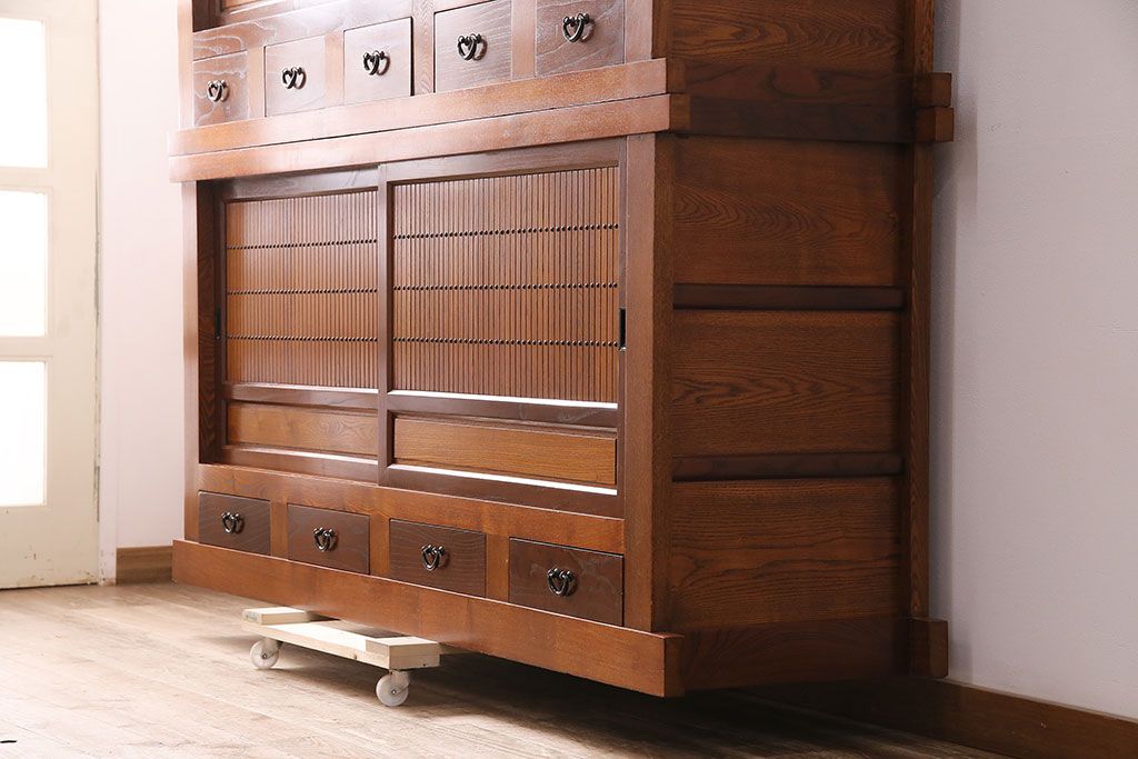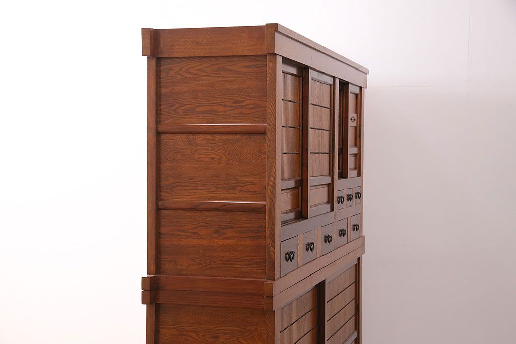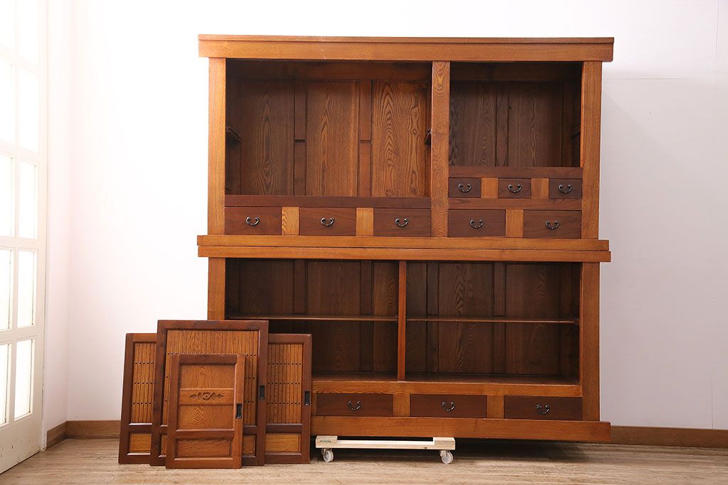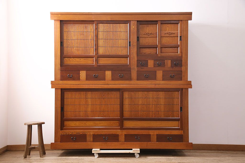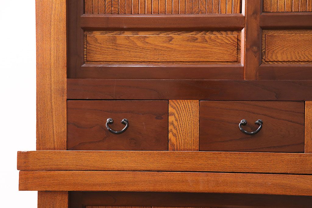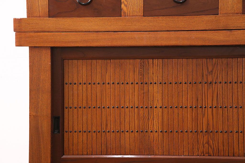 ラフジュ工房> 民芸家具 > 中古 民芸家具 総ニレ無垢材 凛とした佇まいが魅力的な水屋箪笥(重ね箪笥、収納棚、戸棚)(R-048815)