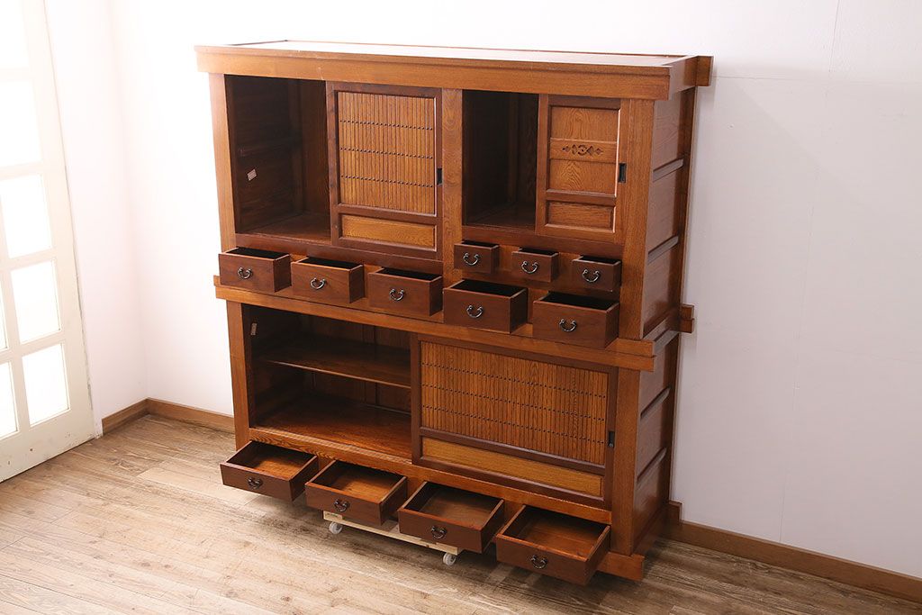 ラフジュ工房> 和箪笥 > 中古 民芸家具 総ニレ無垢材 凛とした佇まいが魅力的な水屋箪笥(重ね箪笥、収納棚、戸棚)(R-048815)