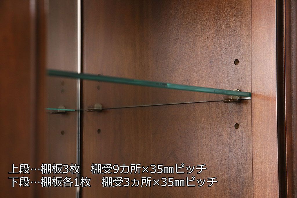棚板は取り外しできます。上段棚板は3枚あります。棚受けは9ヶ所、35mmピッチで調整できます。下段棚板は各1枚あります。棚受けは3ヶ所、35mmピッチで調整できます。棚幅サイズのものが1枚の作りです。