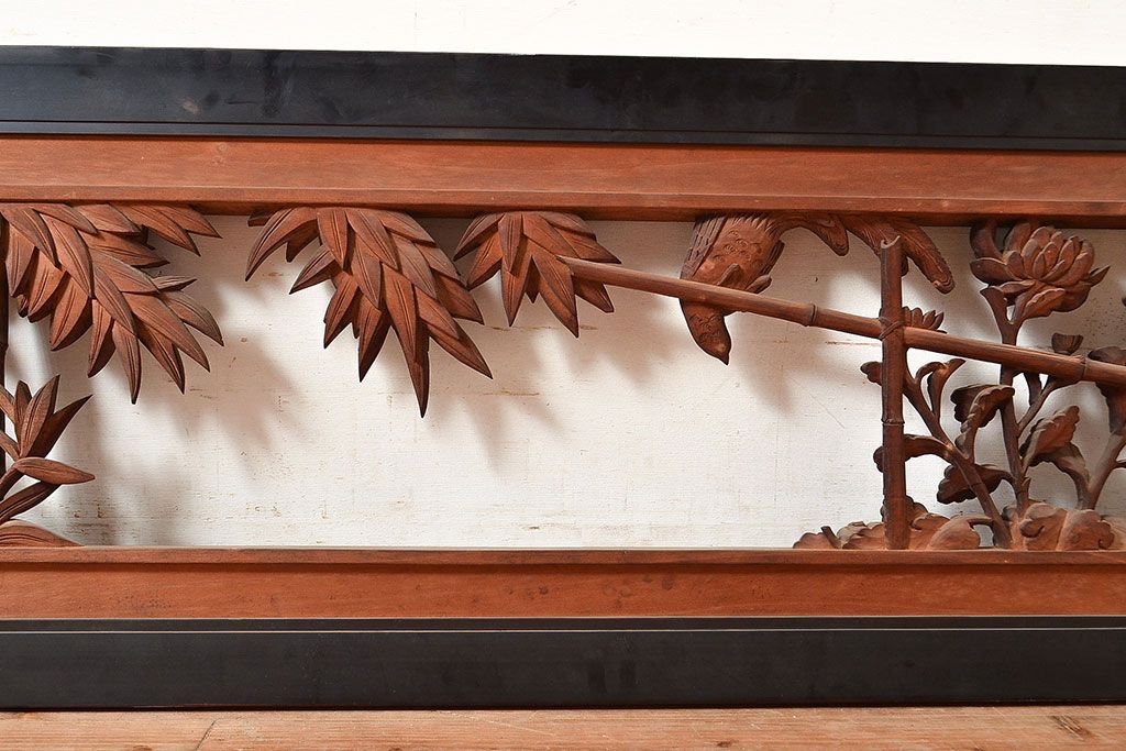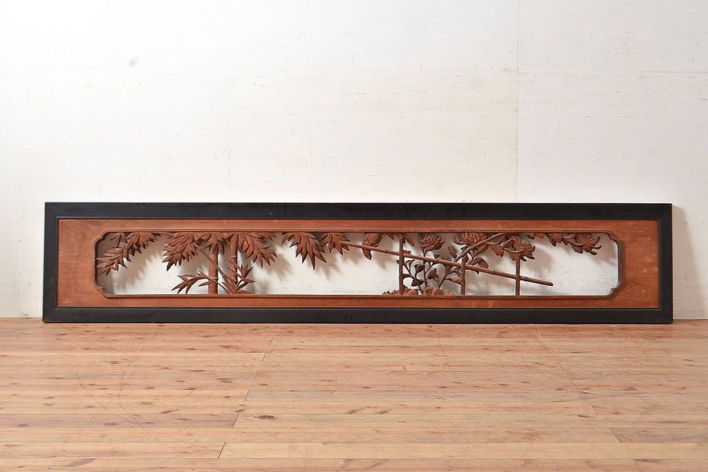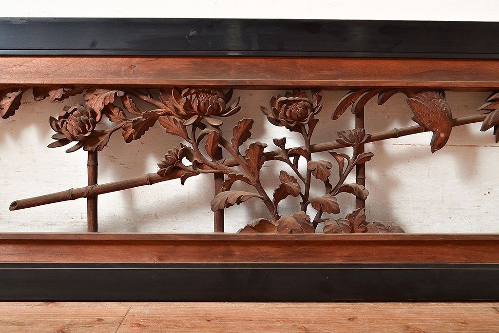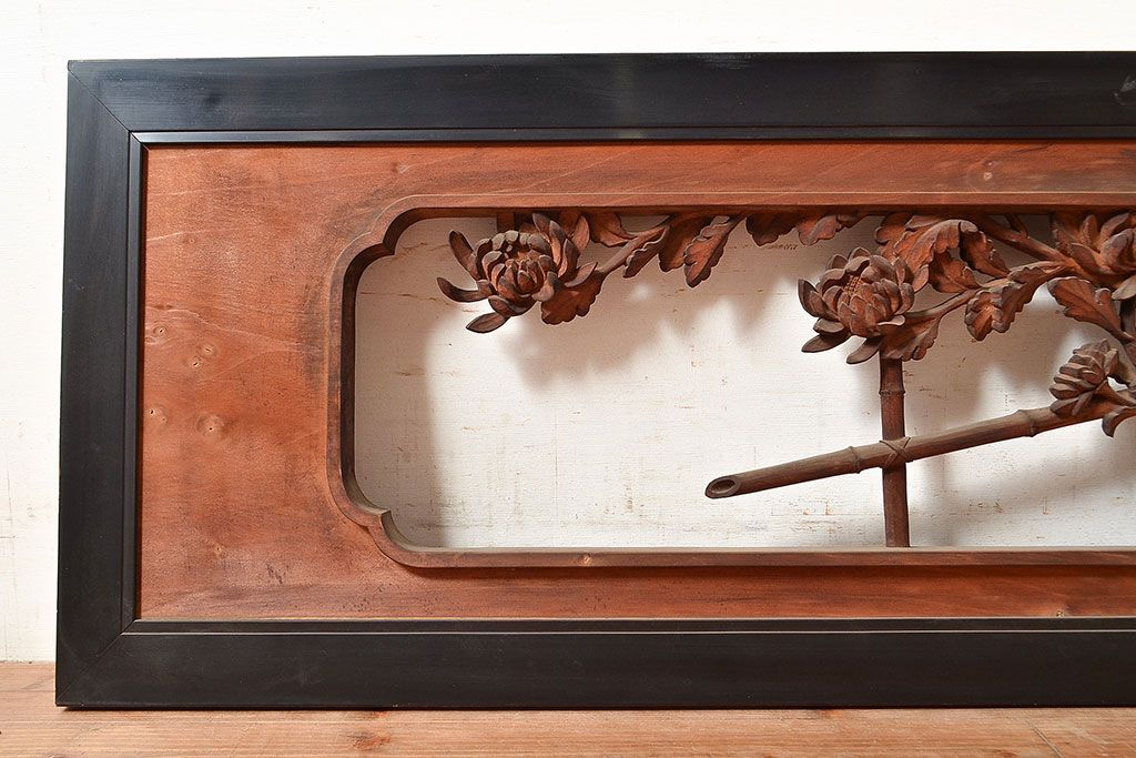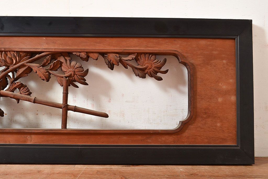 アンティーク建具 菊の花・竹 繊細に表現された彫刻が風流な彫刻欄間(明り取り、建具)(R-048482)