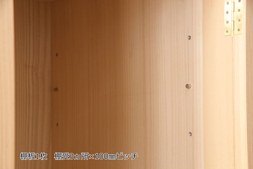 棚板は取り外しできます。棚板は1枚あります。棚受けは3ヶ所、100mmピッチで調整できます。棚幅サイズのものが1枚の作りです。