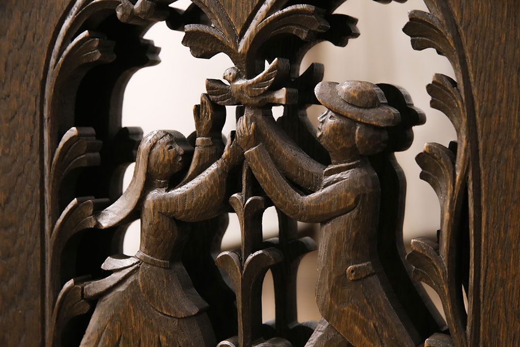 扉には鳥とたわむれる男女が緻密に彫られ、