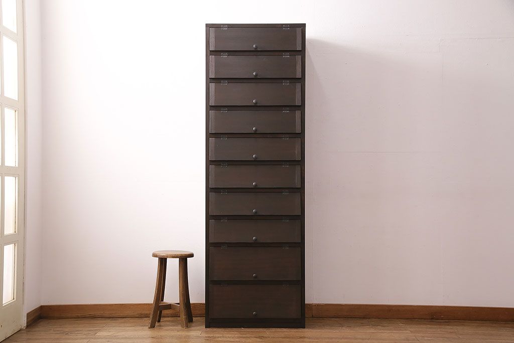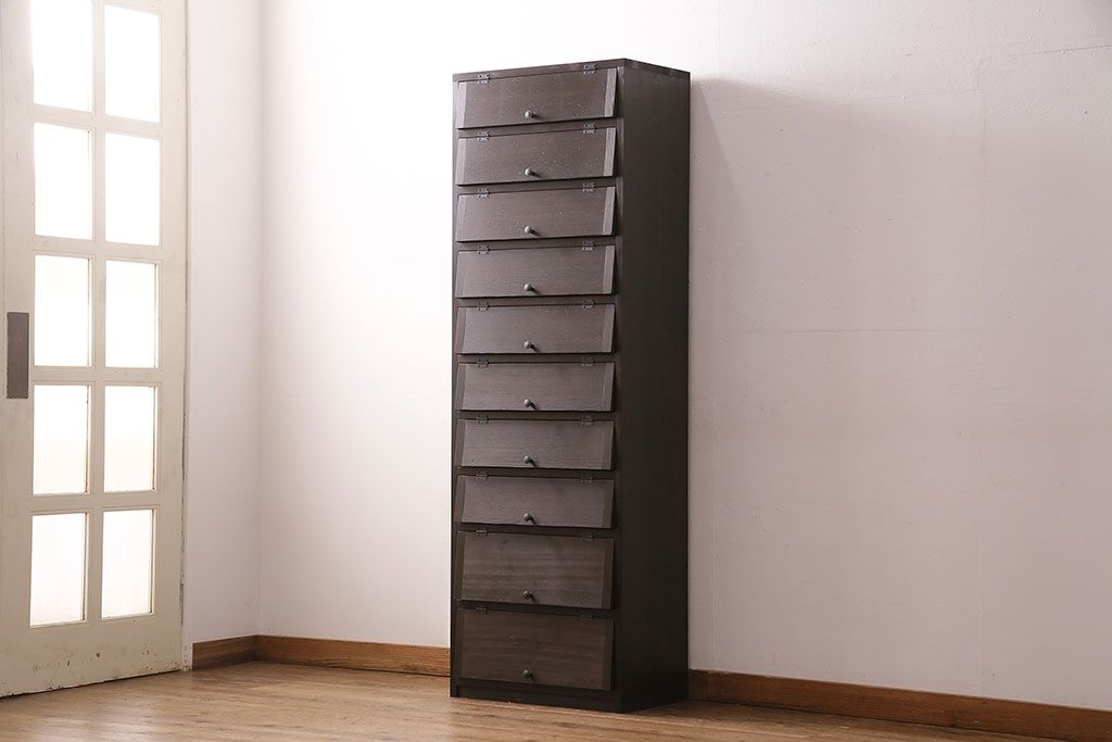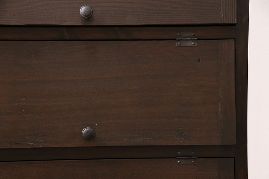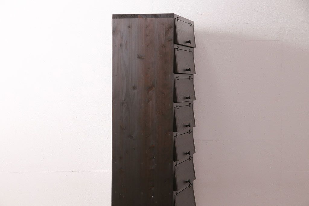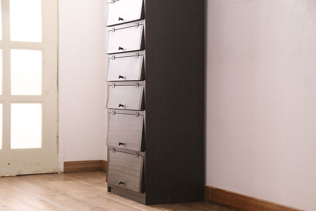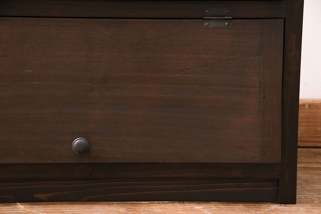 ワードローブ・ロッカー> ロッカー > パタパタ扉の下駄箱を新規製作!本体はヒノキ無垢材、前板は古材を使用。取っ手を取り付け。濃い茶色で着色し仕上げ。(収納棚、戸棚、ロッカー)