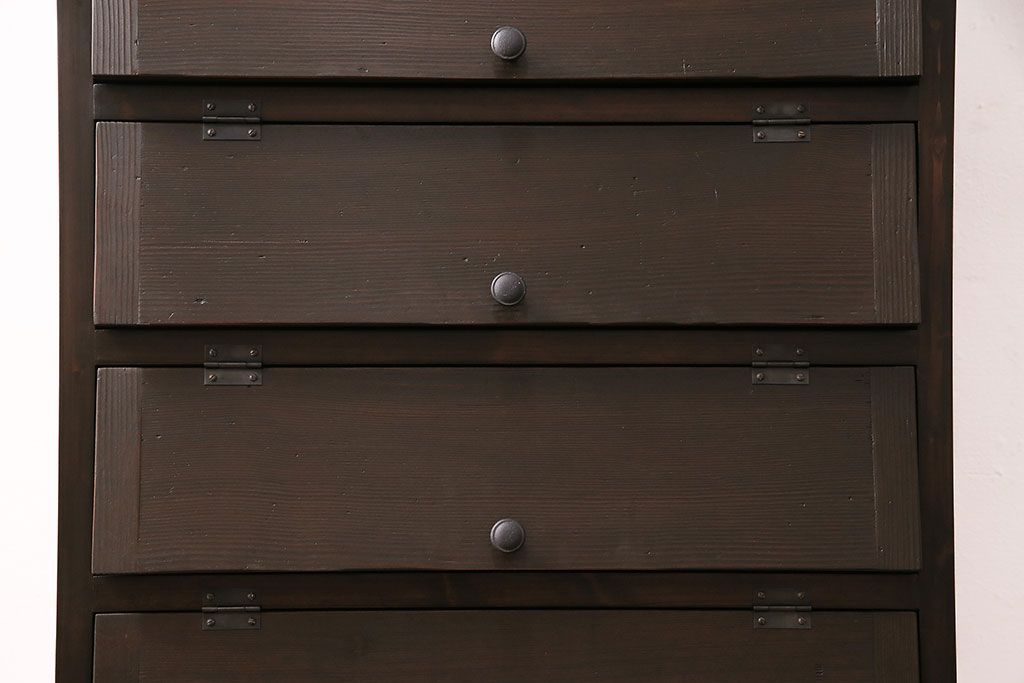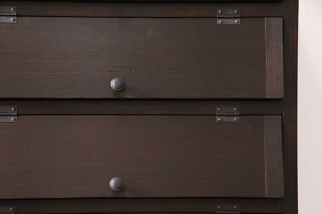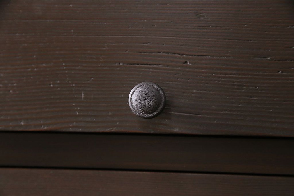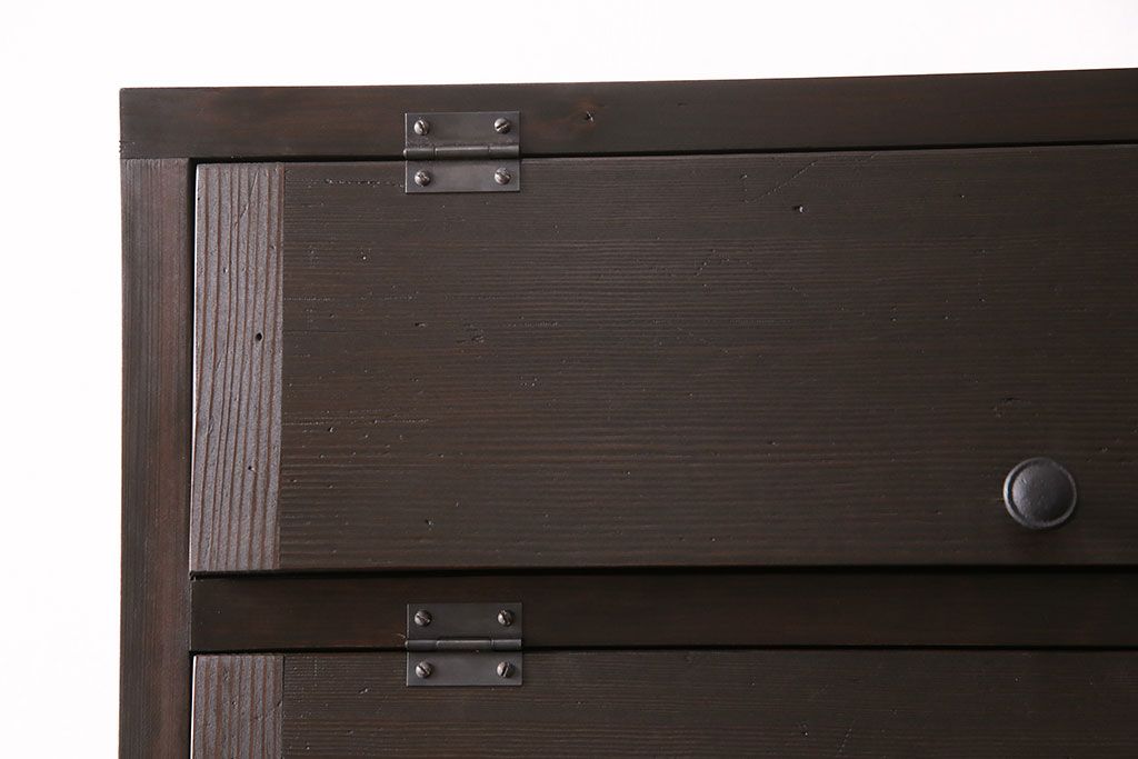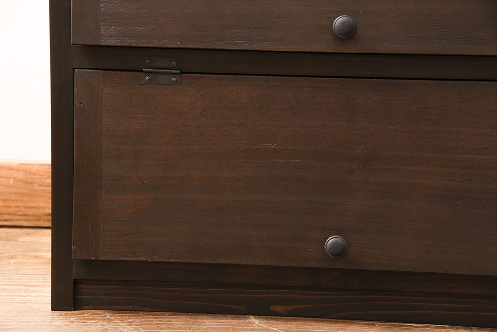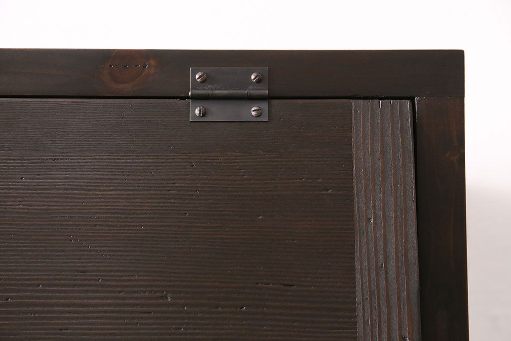 フルオーダー家具実績 > パタパタ扉の下駄箱を新規製作!本体はヒノキ無垢材、前板は古材を使用。取っ手を取り付け。濃い茶色で着色し仕上げ。(収納棚、戸棚、ロッカー)