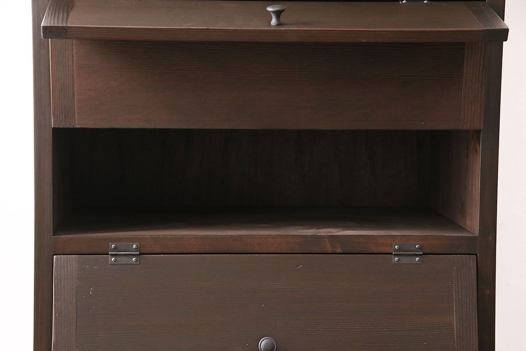 ワードローブ・ロッカー > パタパタ扉の下駄箱を新規製作!本体はヒノキ無垢材、前板は古材を使用。取っ手を取り付け。濃い茶色で着色し仕上げ。(収納棚、戸棚、ロッカー)