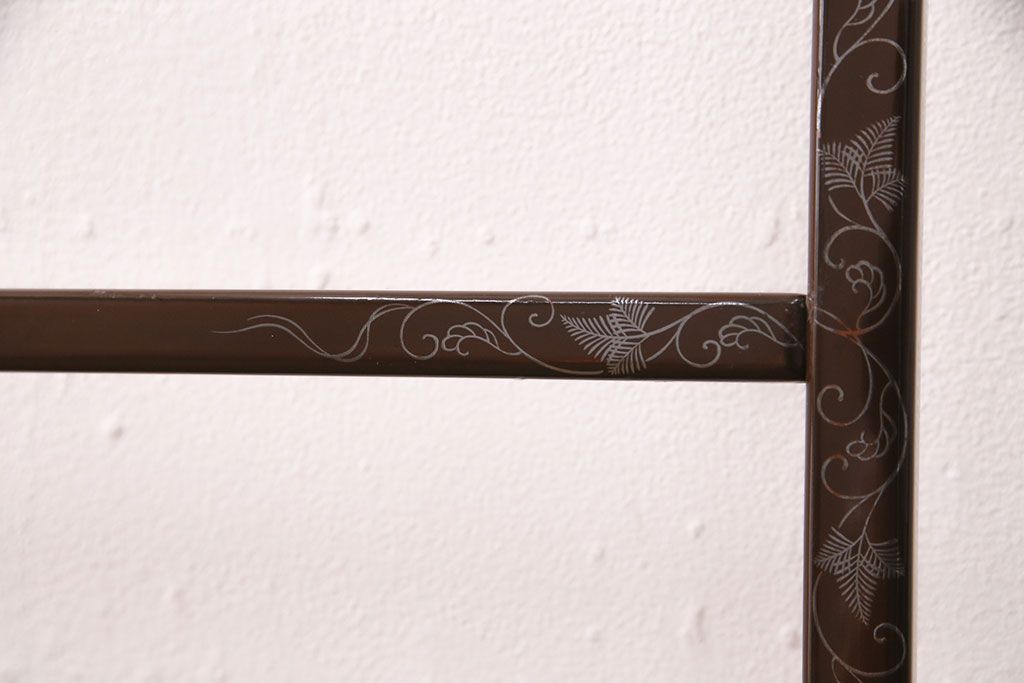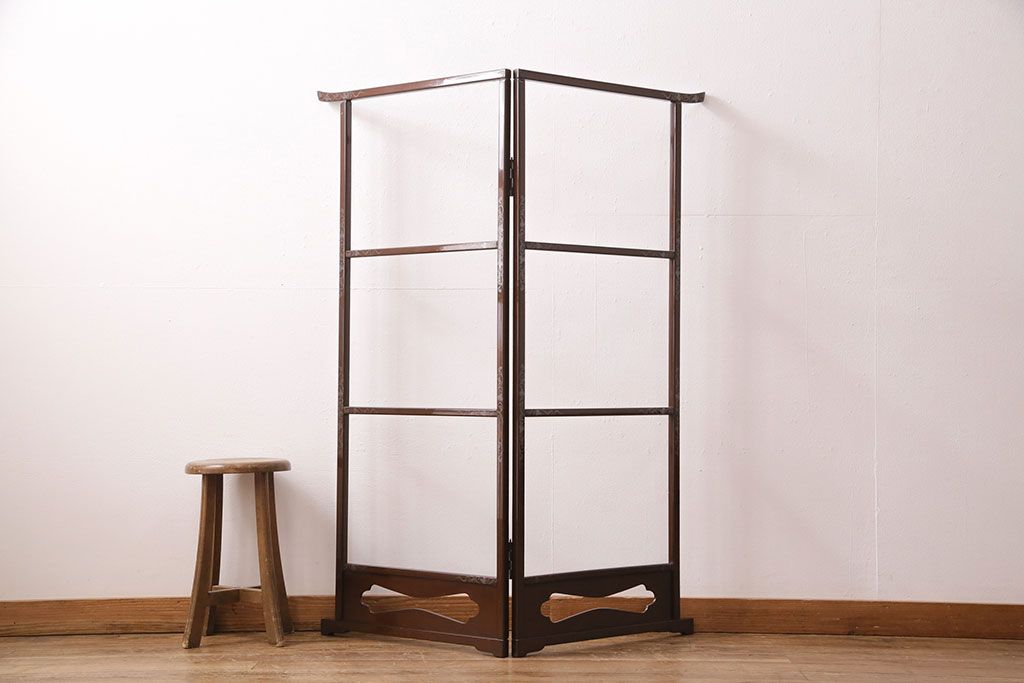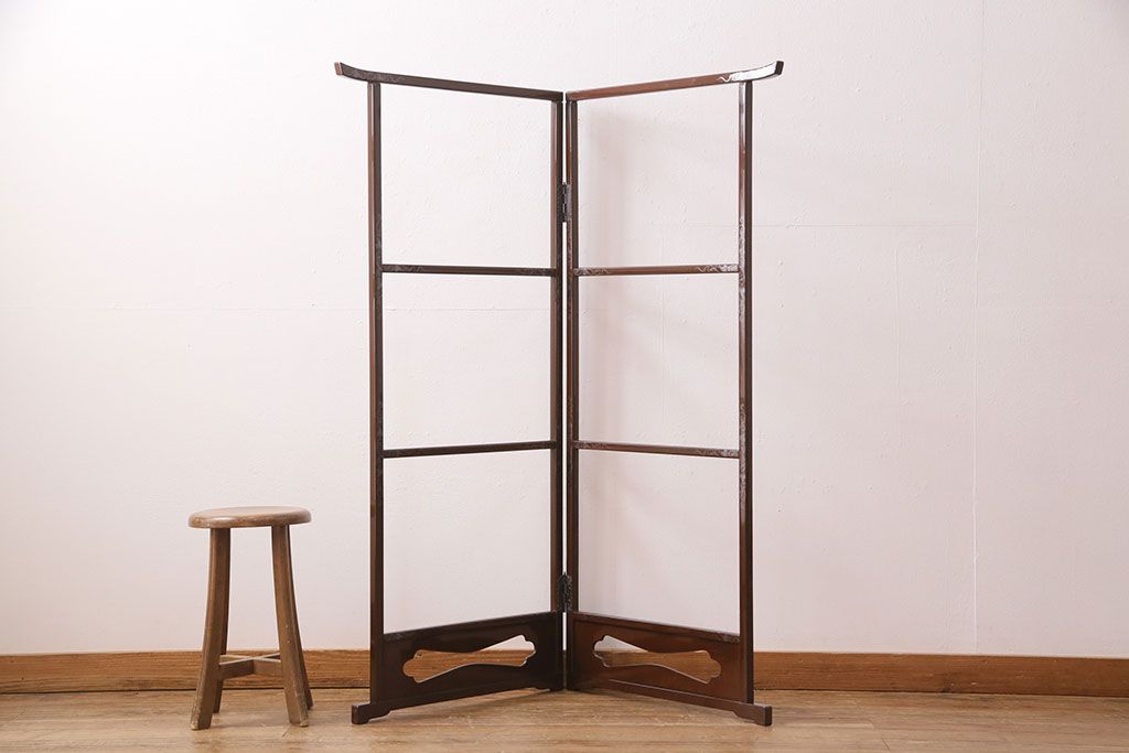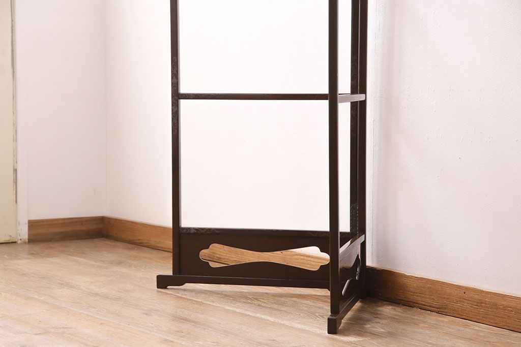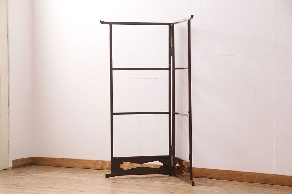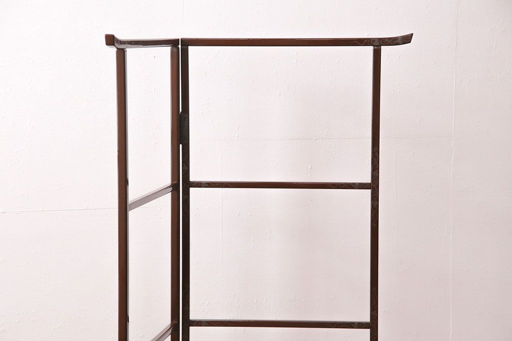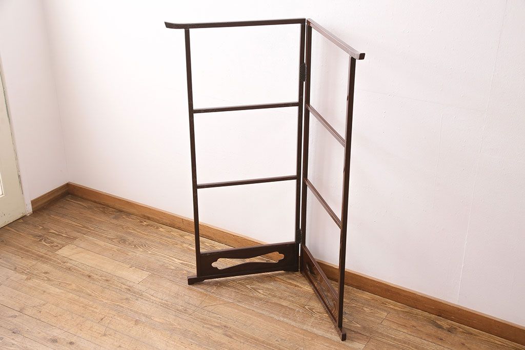 アンティーク雑貨 透かし彫りの意匠が上品な二つ折衣桁(ハンガーラック、着物掛け、衣装掛け、コートハンガー)(R-049354)