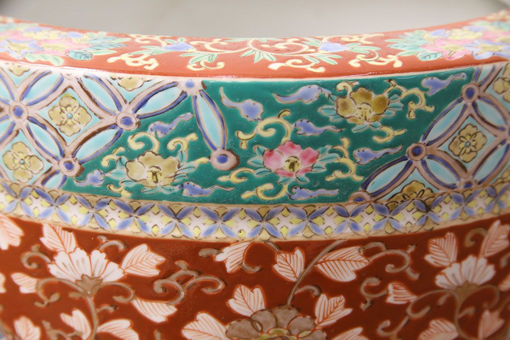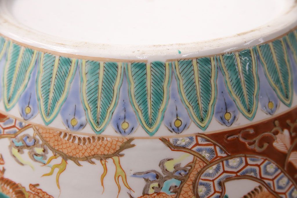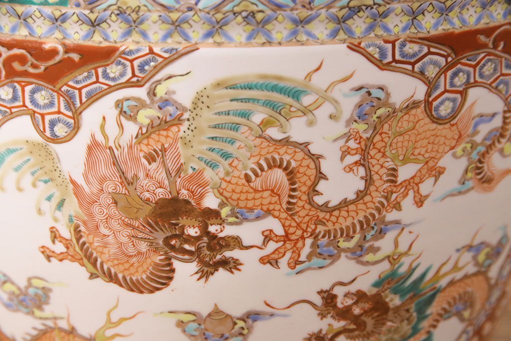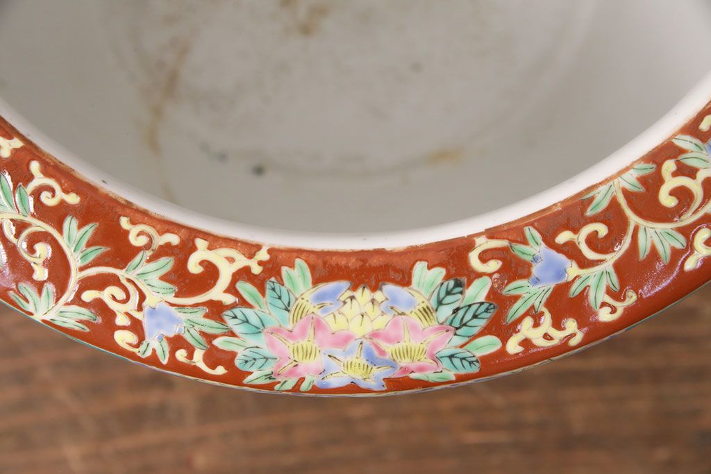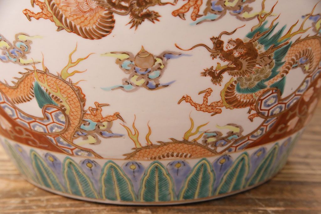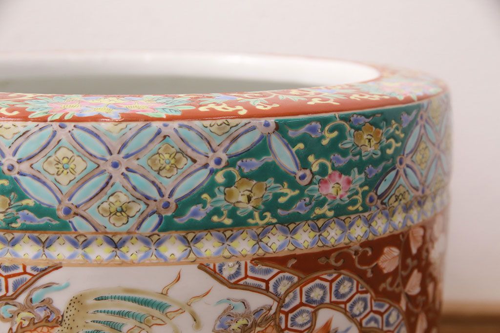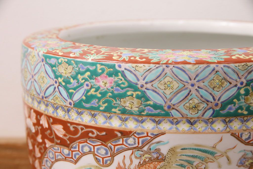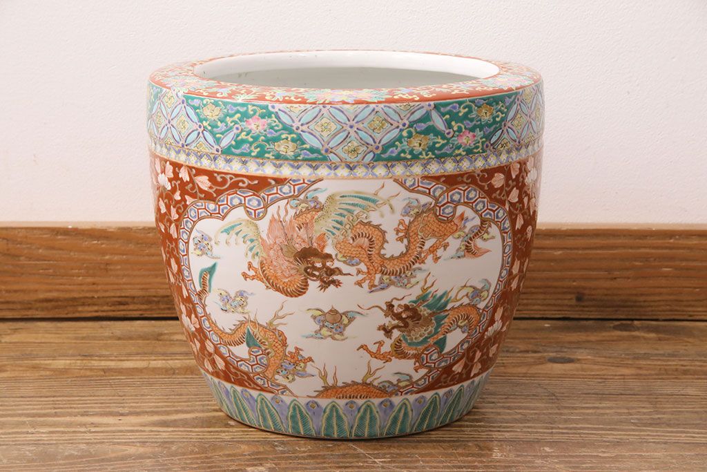 火鉢> 瀬戸火鉢 > アンティーク雑貨 昭和中期 異国情緒あふれる龍の窓絵が魅力的な十錦手火鉢(瀬戸火鉢、鉢カバー)(R-049359)