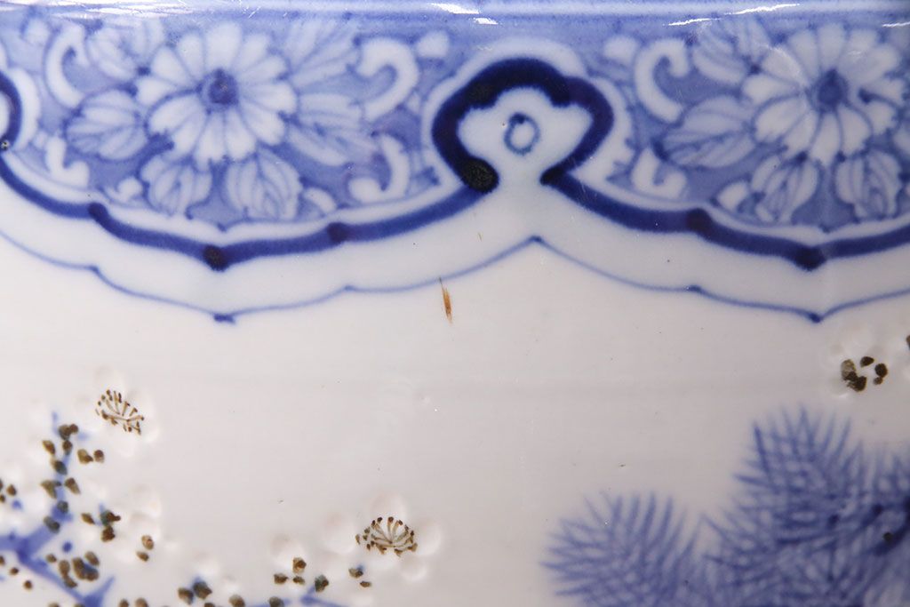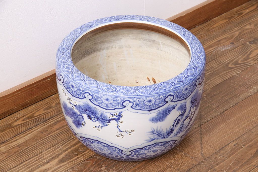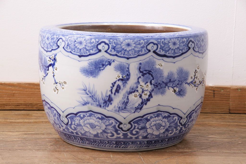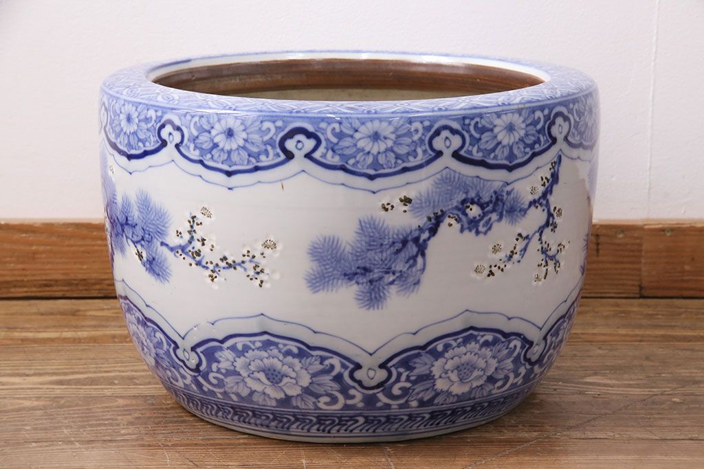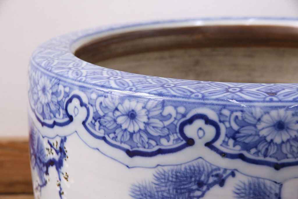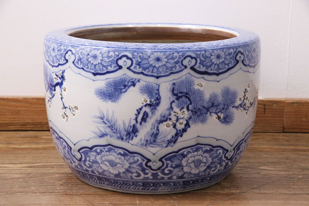 アンティーク雑貨 松竹梅の図 縁起の良い図柄が魅力!和の風情を感じる瀬戸火鉢(鉢カバー)(R-049362)