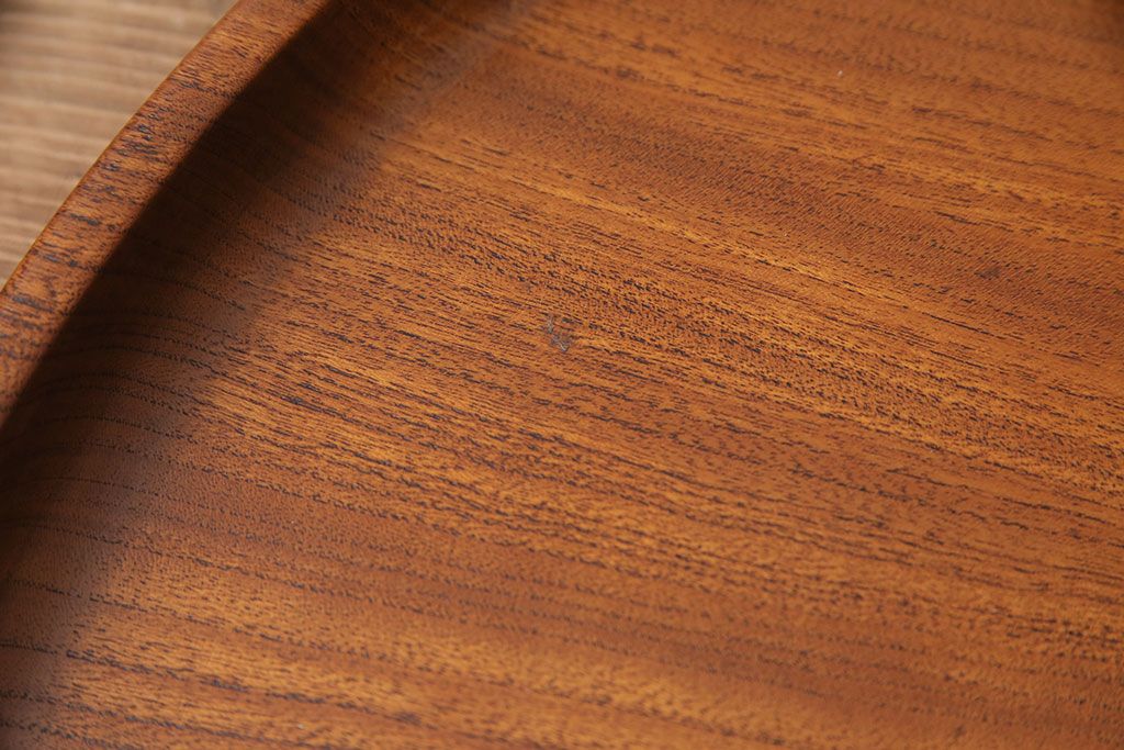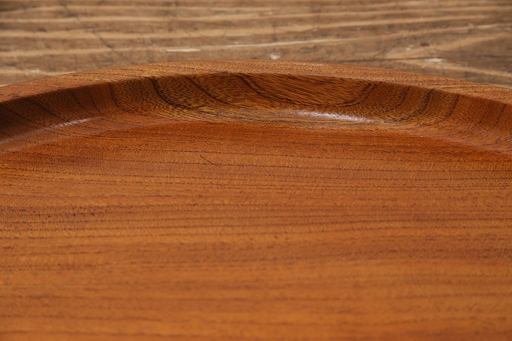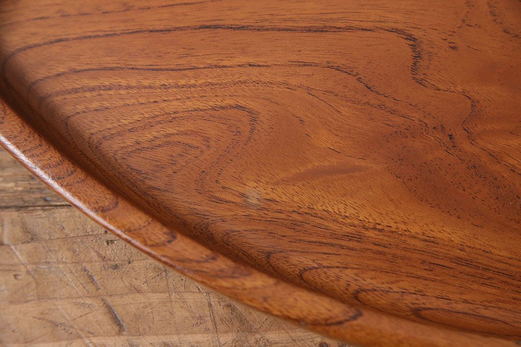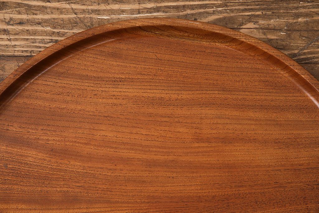 ヴィンテージ雑貨 昭和後期 総ケヤキ材 明るい木色と優しい杢目が味わい深い丸盆(トレー、お盆、ビンテージ)(R-049373)