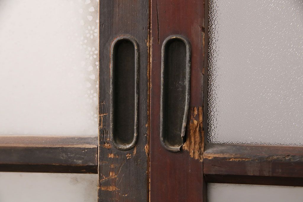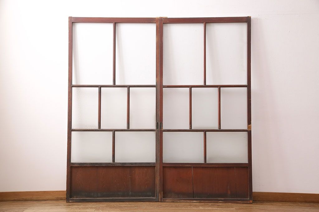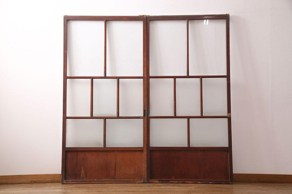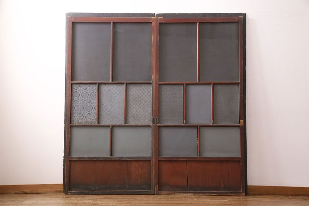 昭和レトロ すりガラス・ダイヤガラス・クリアガラス 花柄のガラスがレトロな雰囲気を高めるガラス戸2枚セット(引き戸、建具)(R-049225)