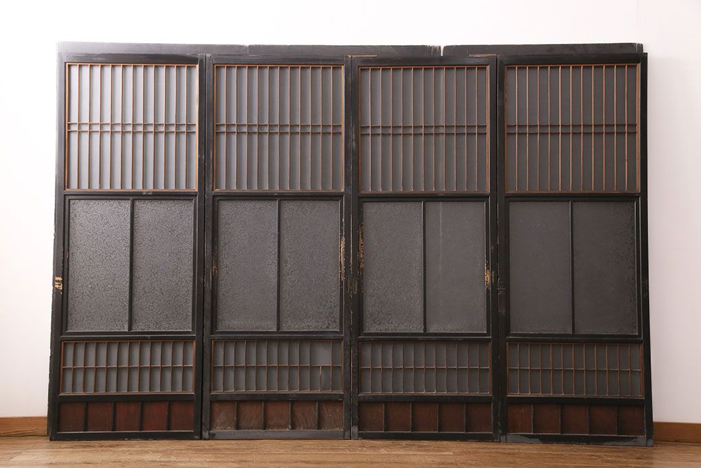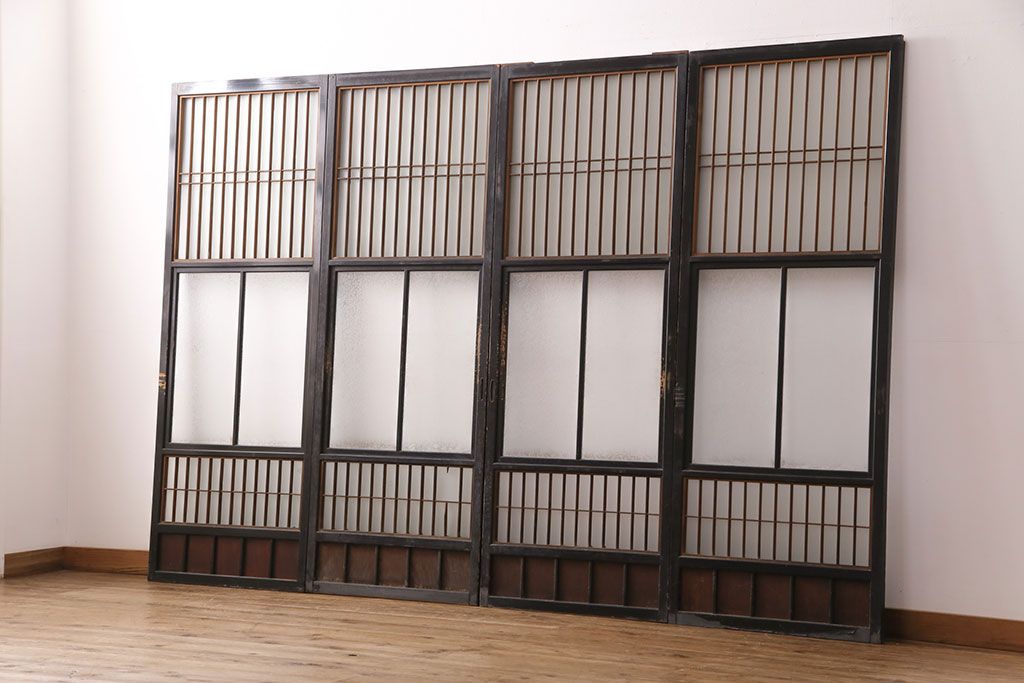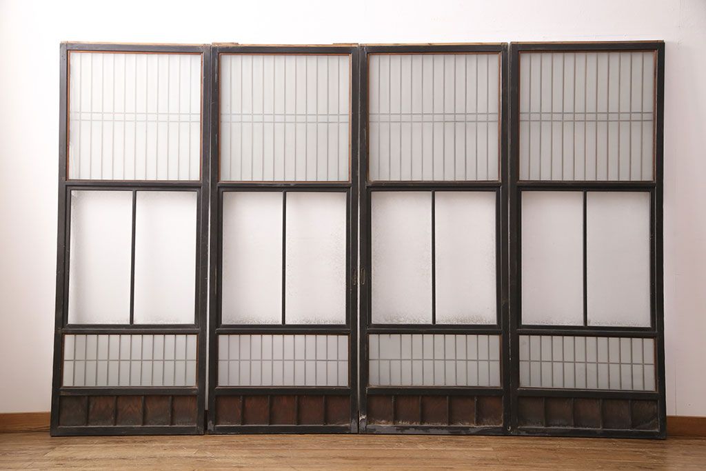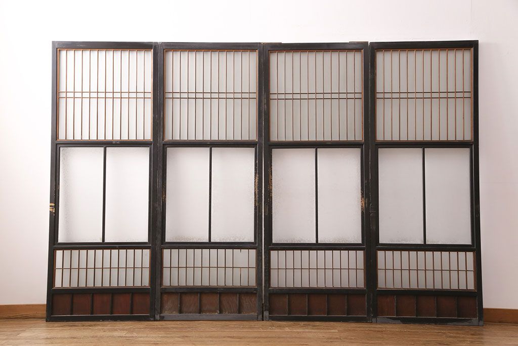 ドア・建具> 4枚〜セット > 和製アンティーク 昭和初期 結霜ガラス・すりガラス 黒い框がレトロな雰囲気を高めるスリムなガラス戸4枚セット(引き戸、建具)(R-049228)
