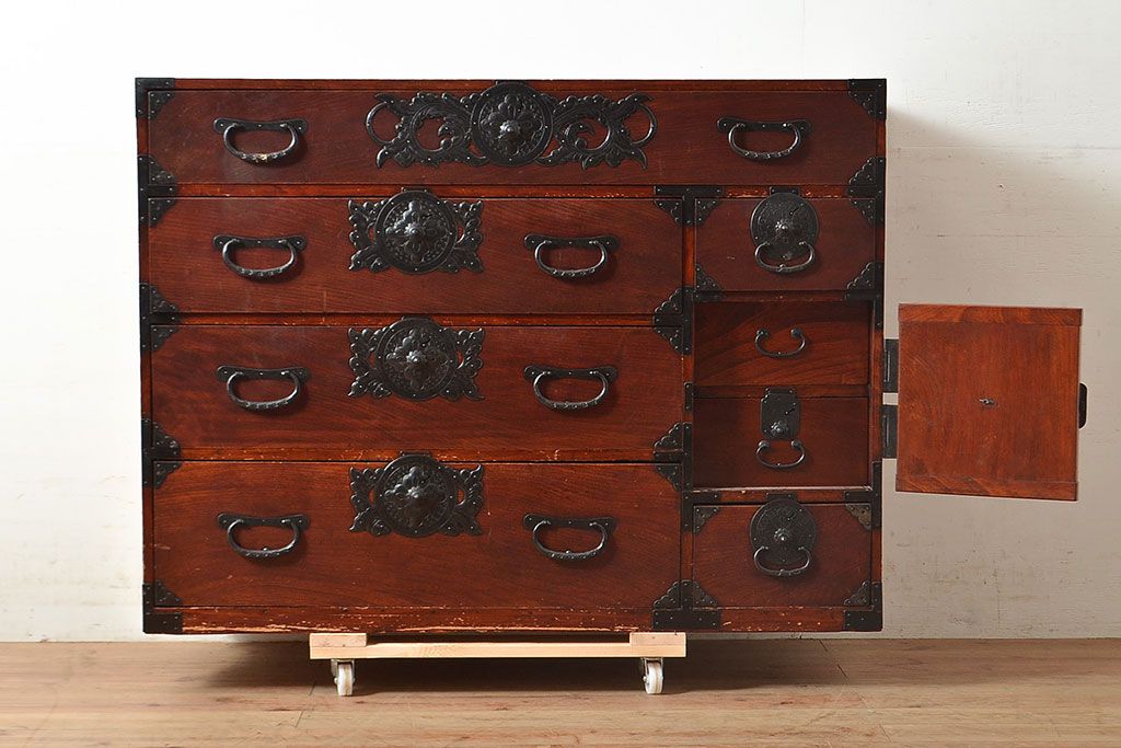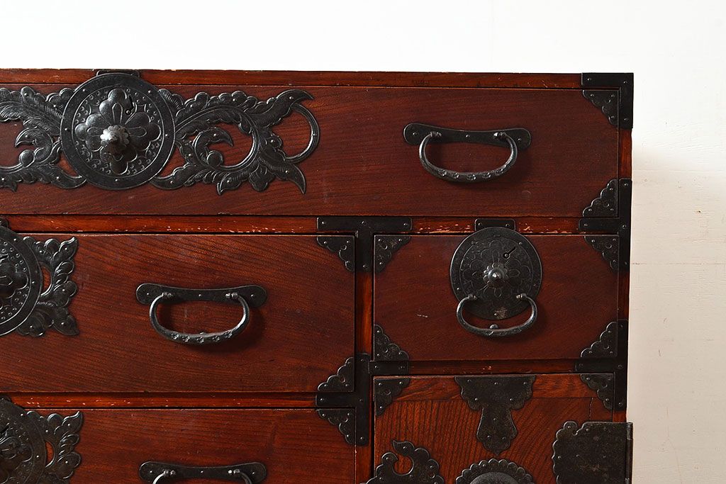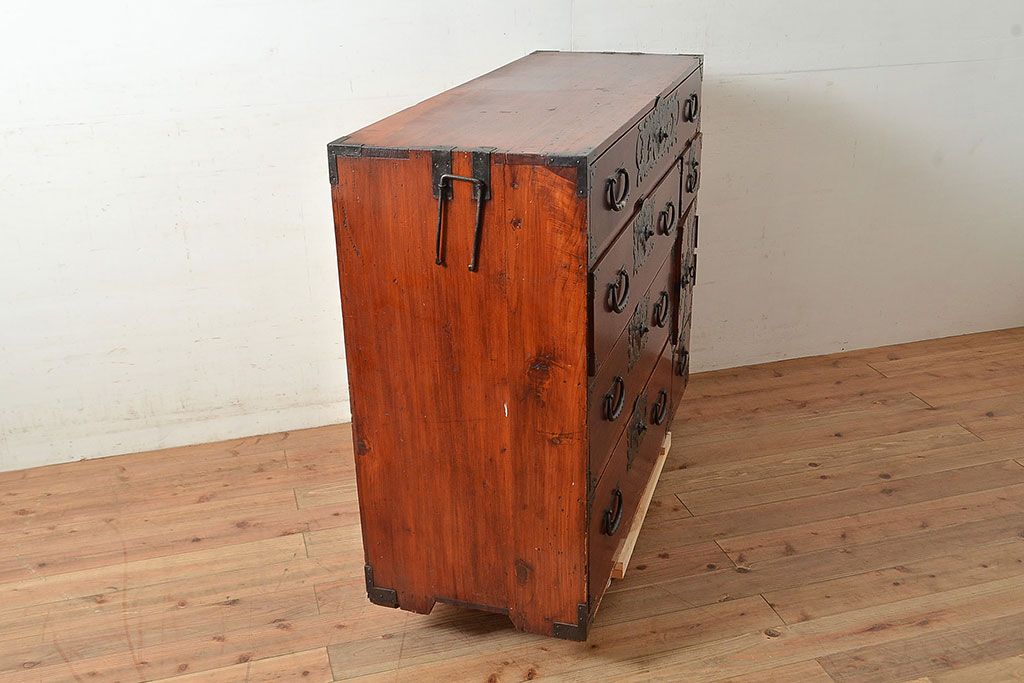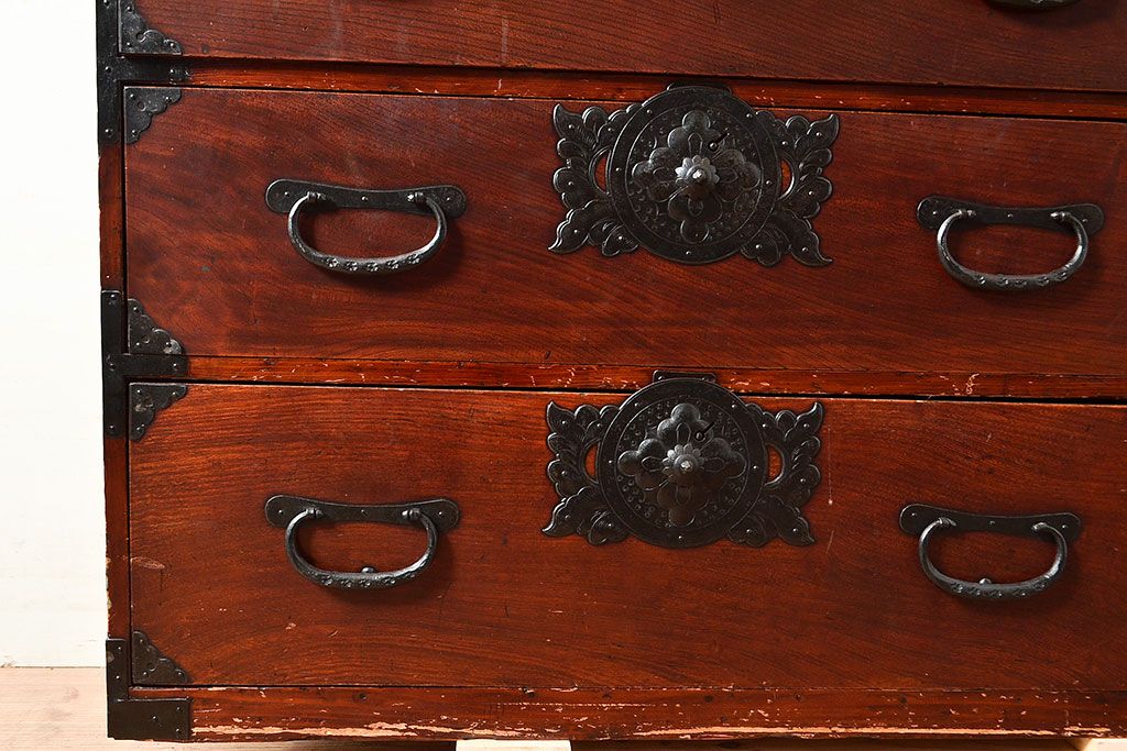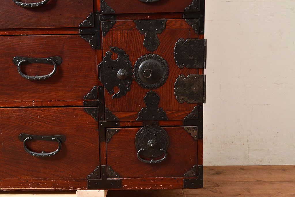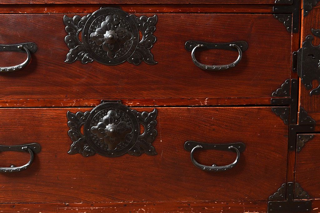 和箪笥> 衣装箪笥 > 和製アンティーク 前面ケヤキ材 漆塗り 風格漂う和の空間作りにぴったりの仙台箪笥(衣装箪笥、引き出し)(R-048186)