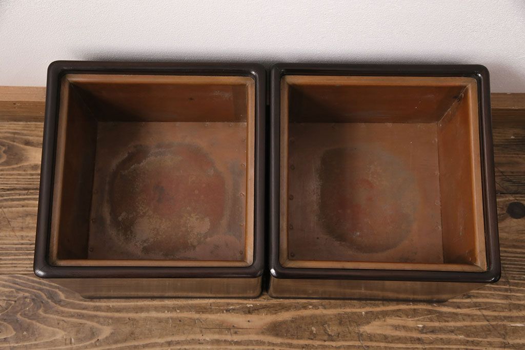 火鉢> 木製火鉢 > 和製アンティーク 指物工芸品 美品 外箱付き!紫檀(シタン)材の深みを帯びた色合いが美しい角火鉢2個セット(木製火鉢)(R-049385)