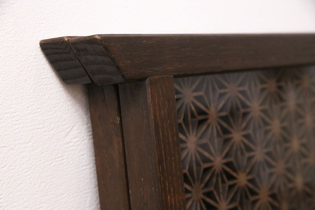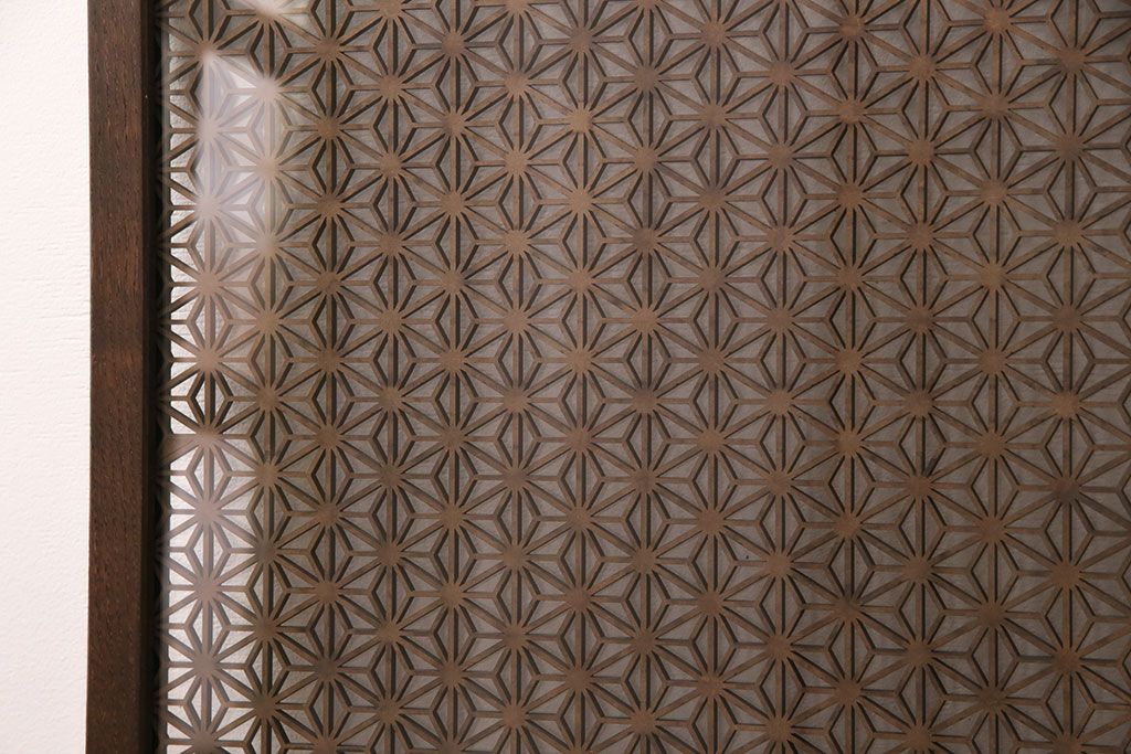 麻の葉模様のレーザー組子入り衝立を新規製作!両面にクリアガラスを組み入れ。濃い茶色で着色し仕上げ。(パーテーション、つい立て)