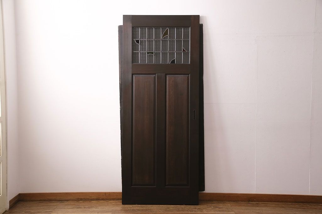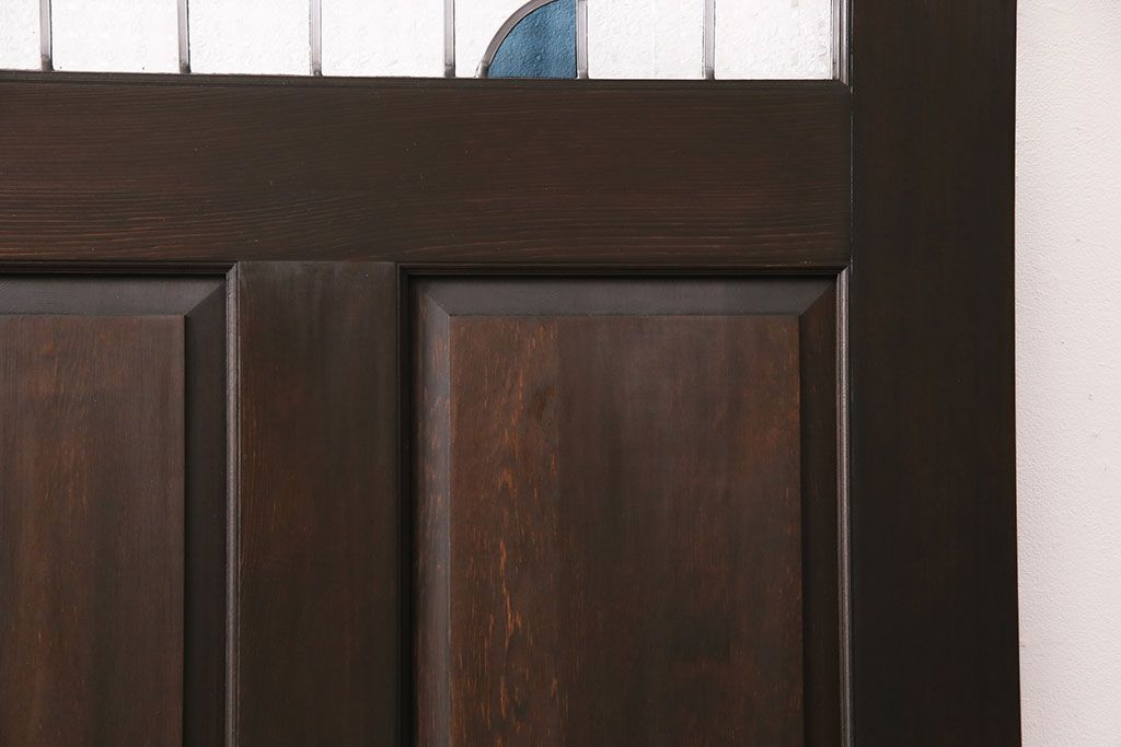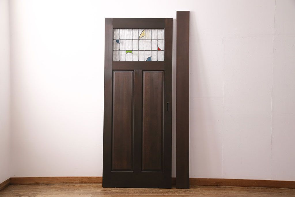 ドア・建具> 引き戸 > ステンドグラス入りの引き戸を新規製作!オリジナルデザインのステンドグラスを組み入れ。引き手を取り付け。木枠を新たに製作。濃い茶色で着色し仕上げ。(建具)
