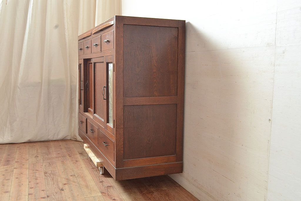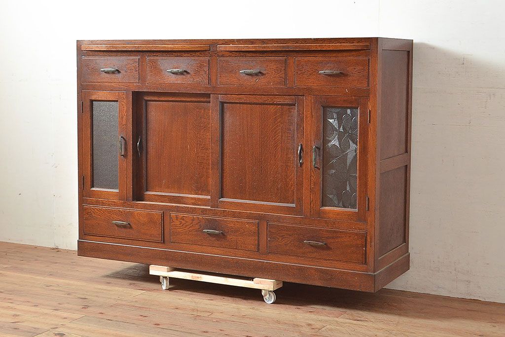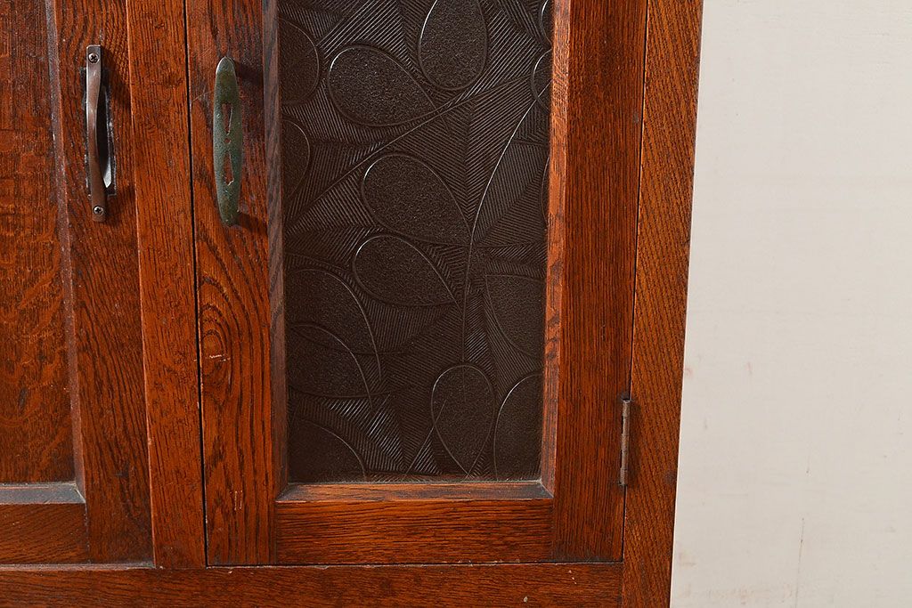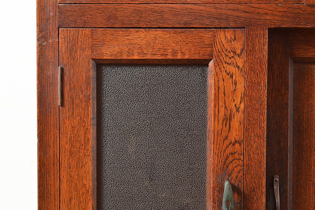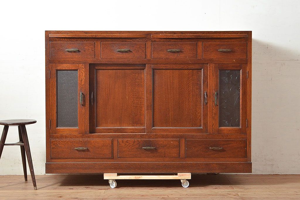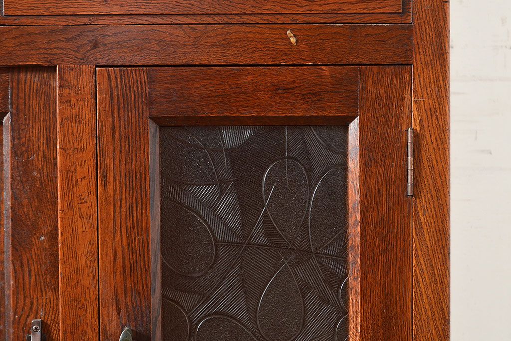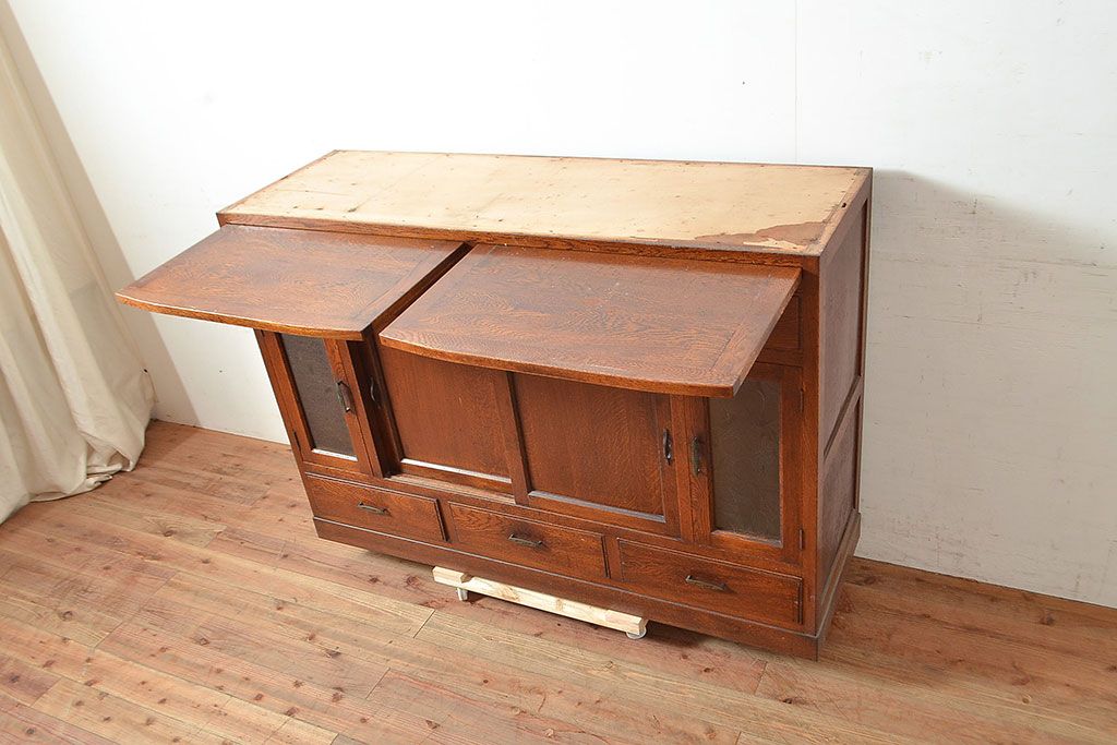 和製アンティーク ナラ材 模様ガラスがポイント!便利な作業台が付いたレトロな食器棚(収納棚、サイドボード、キャビネット)(R-048954)