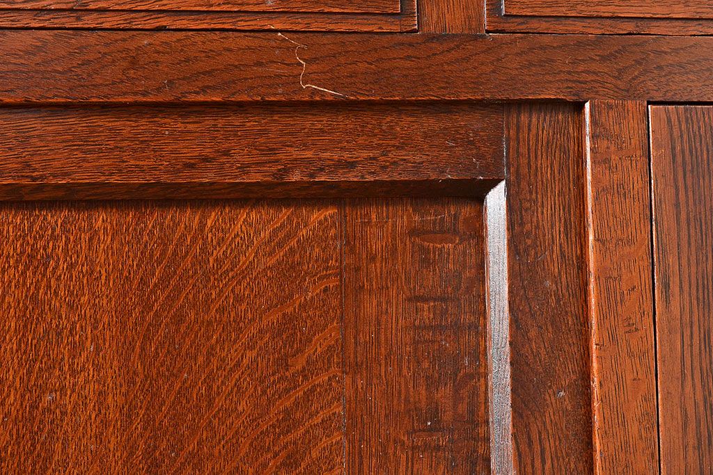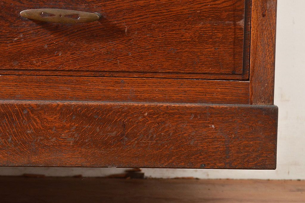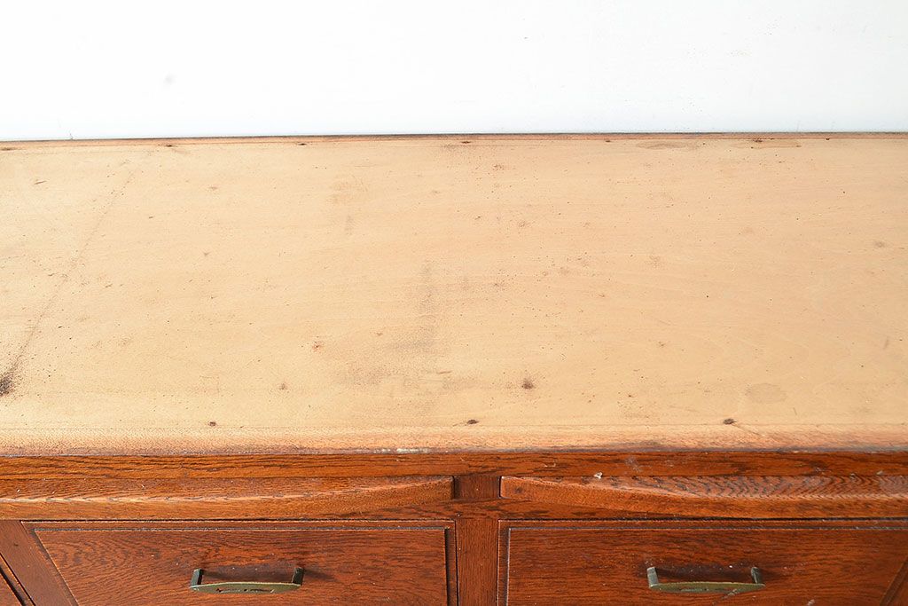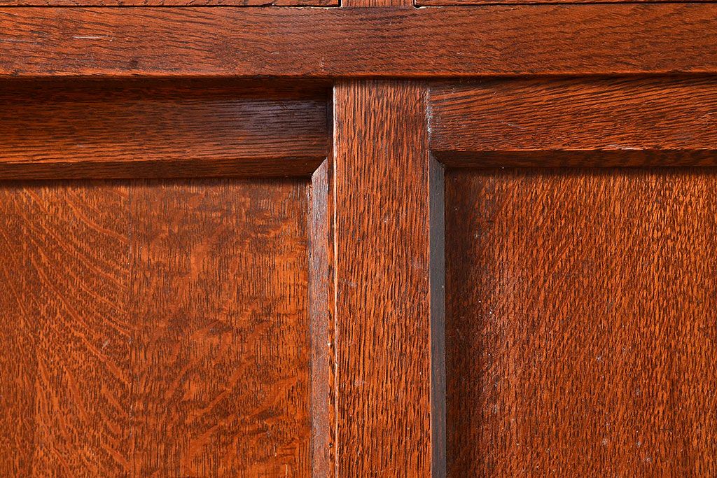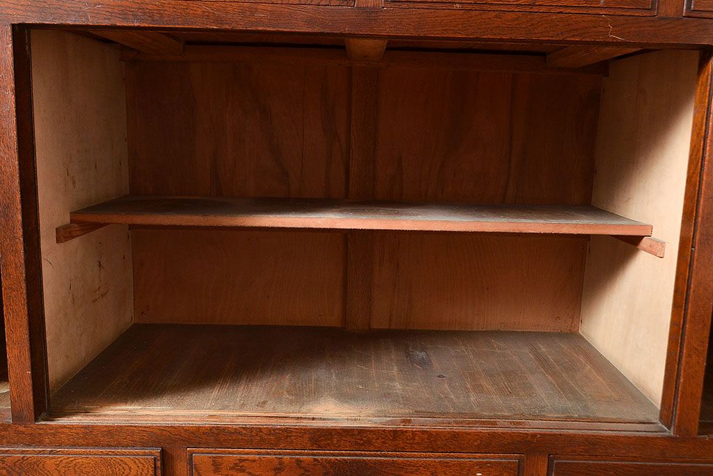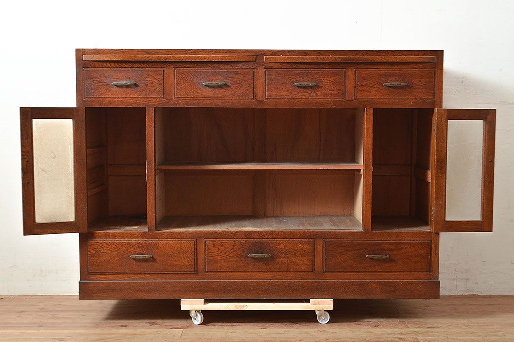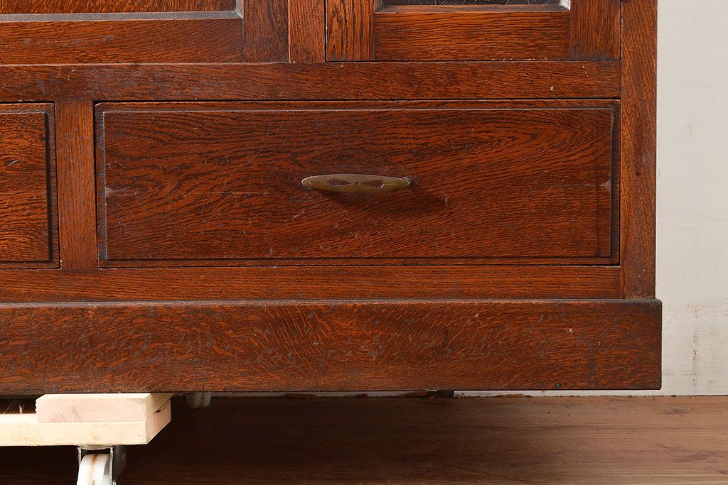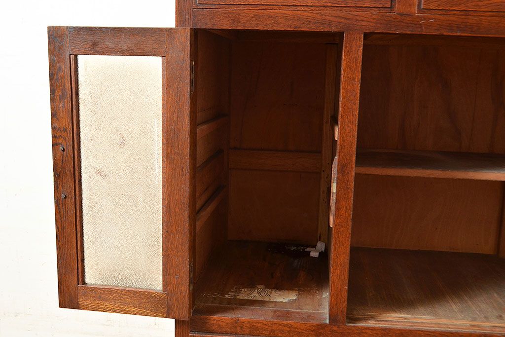 和製アンティーク ナラ材 模様ガラスがポイント!便利な作業台が付いたレトロな食器棚(収納棚、サイドボード、キャビネット)(R-048954)