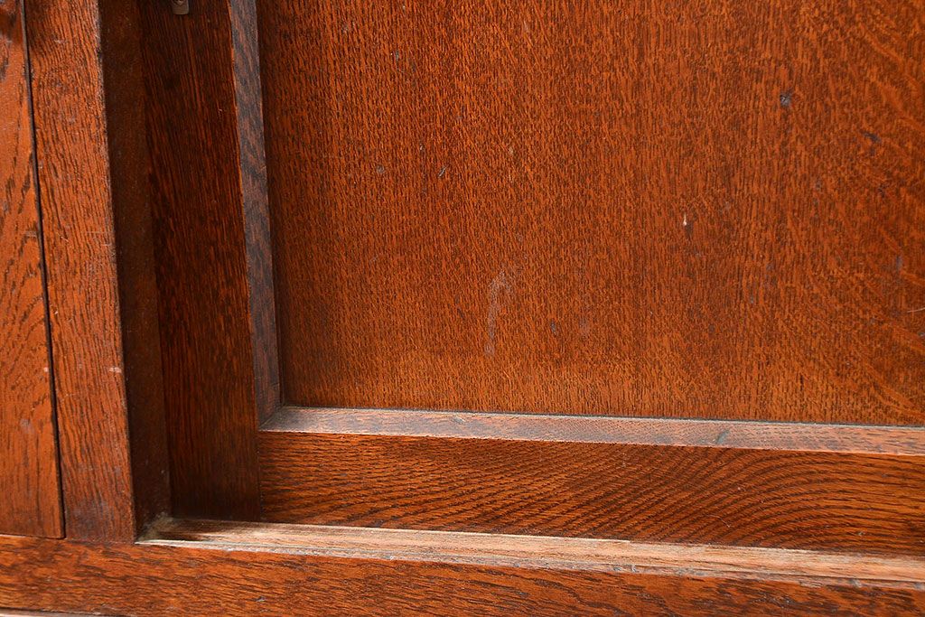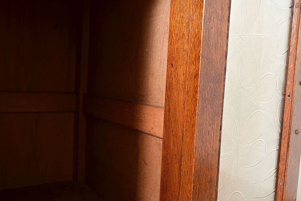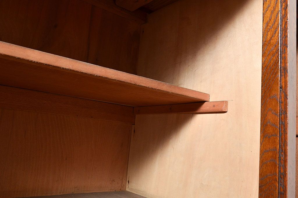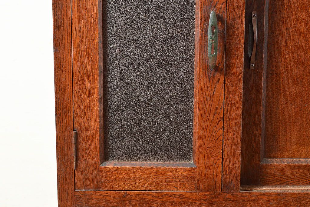 ラフジュ工房> キャビネット・戸棚 > 和製アンティーク ナラ材 模様ガラスがポイント!便利な作業台が付いたレトロな食器棚(収納棚、サイドボード、キャビネット)(R-048954)