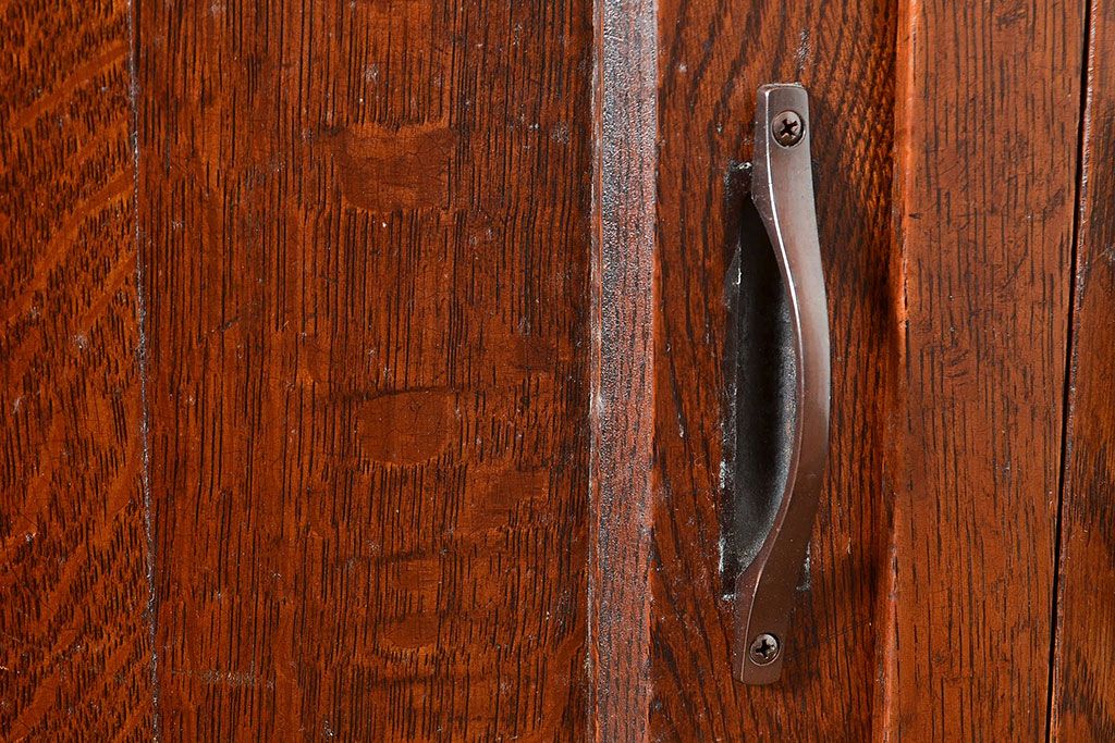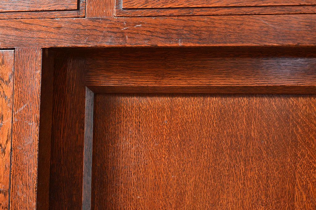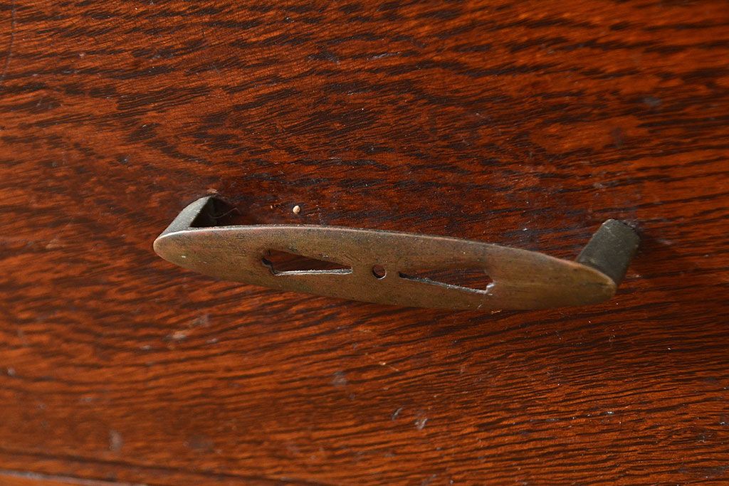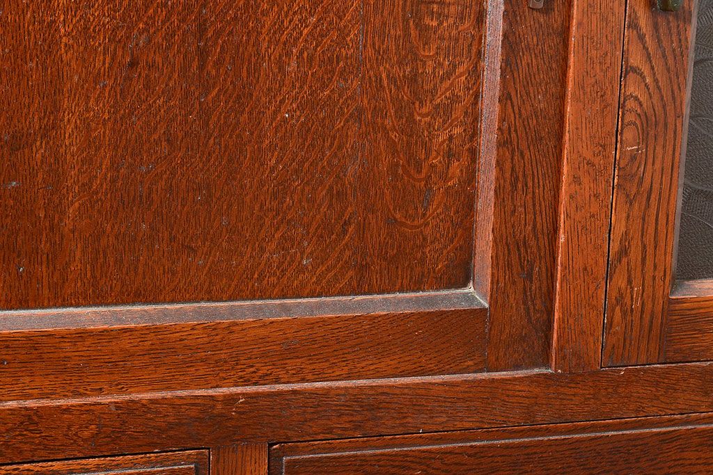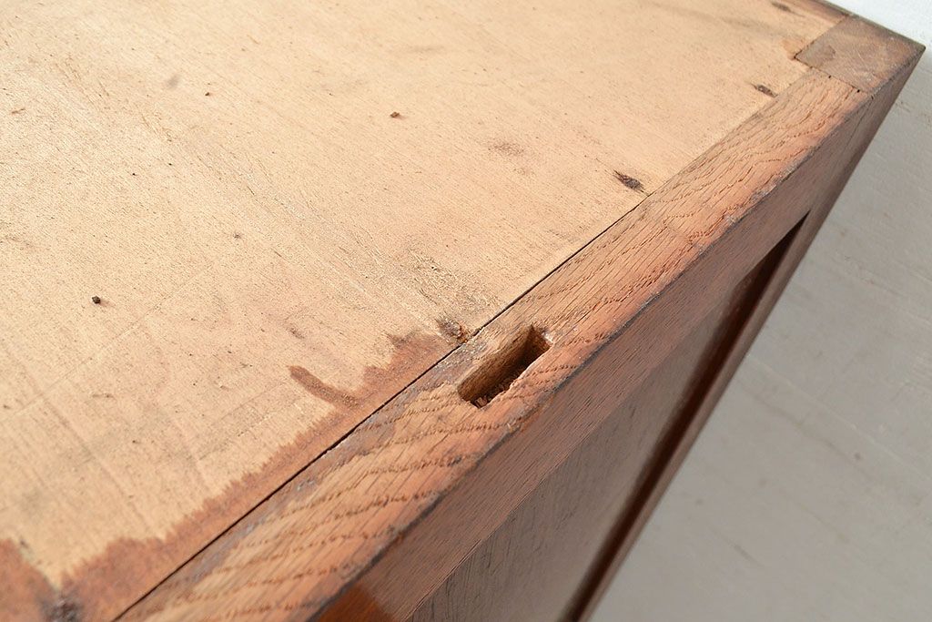 ラフジュ工房> キャビネット・戸棚 > 和製アンティーク ナラ材 模様ガラスがポイント!便利な作業台が付いたレトロな食器棚(収納棚、サイドボード、キャビネット)(R-048954)