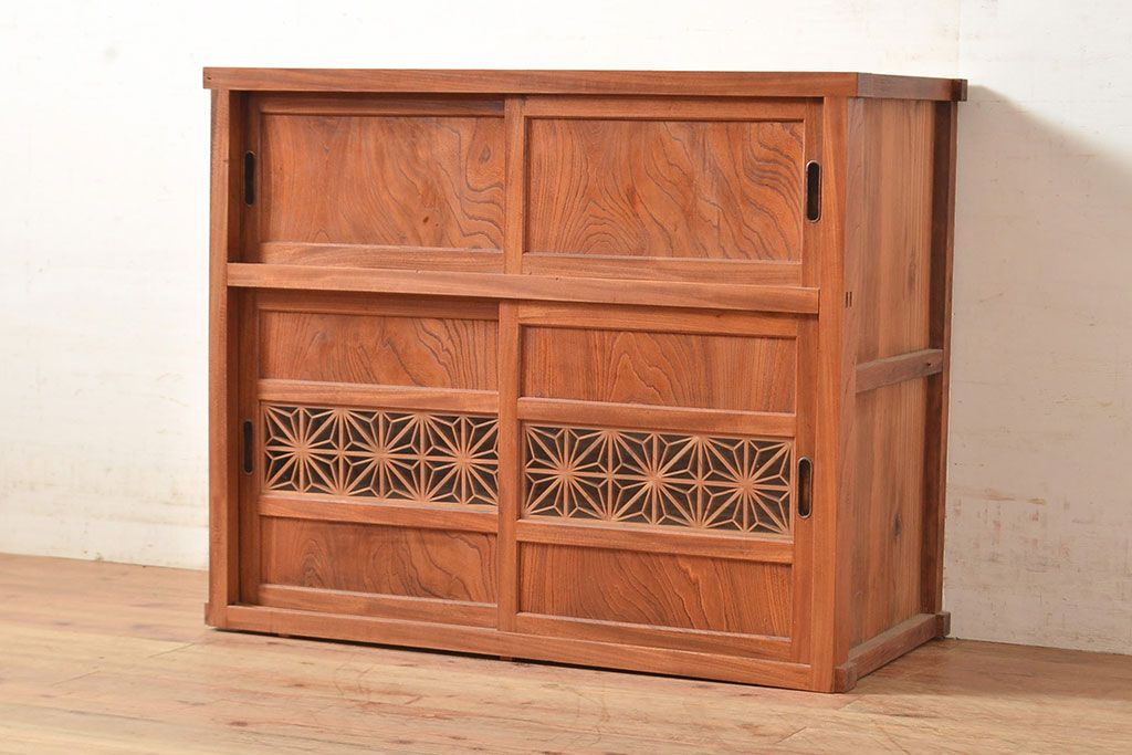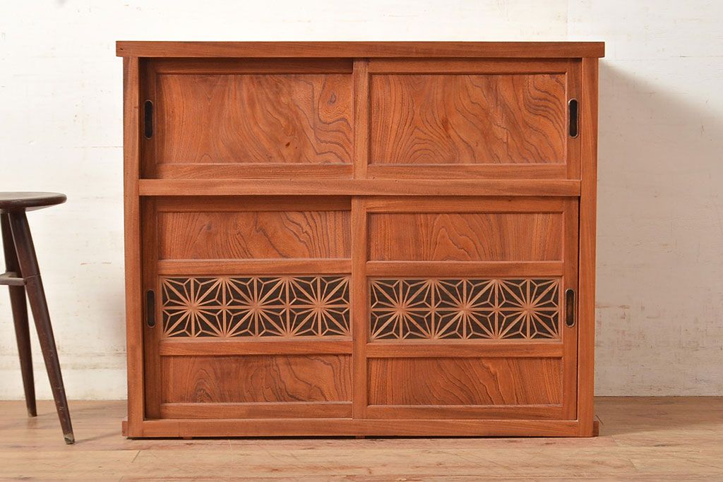 和製アンティーク 前面ケヤキ材 麻の葉の組子がアクセントになった、和の趣きを感じさせる箪笥サイドボード(関東水屋箪笥、キャビネット、収納棚)(R-049151)です。