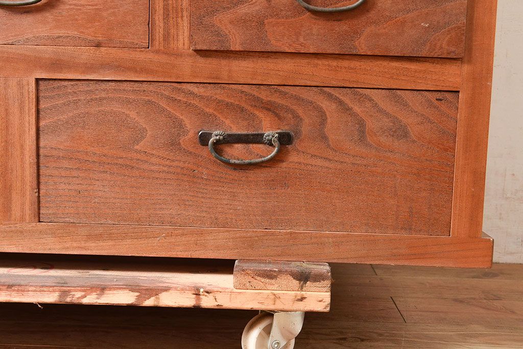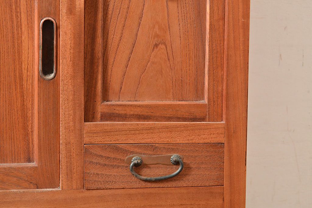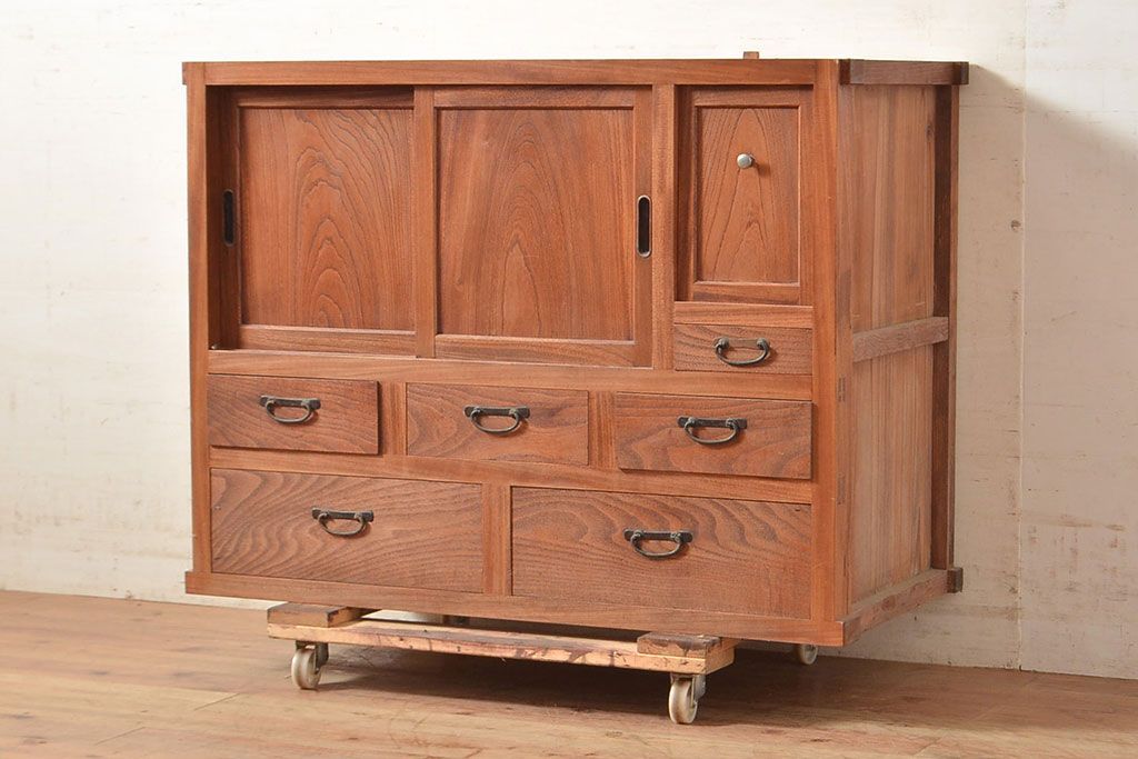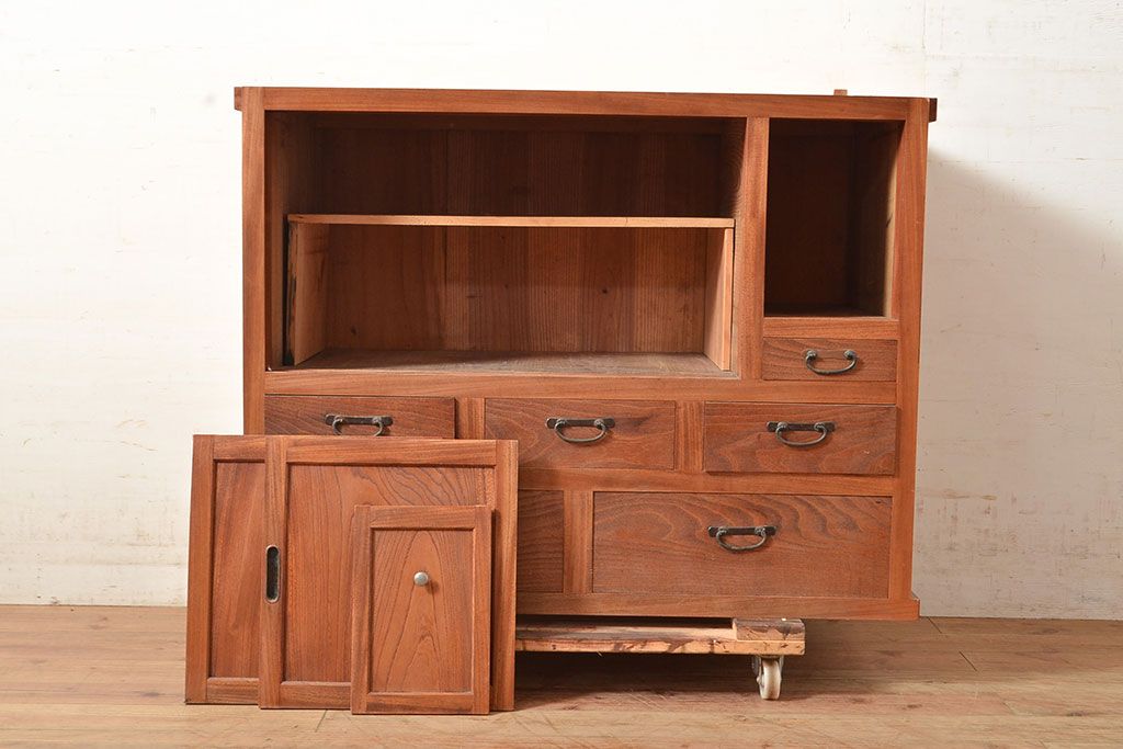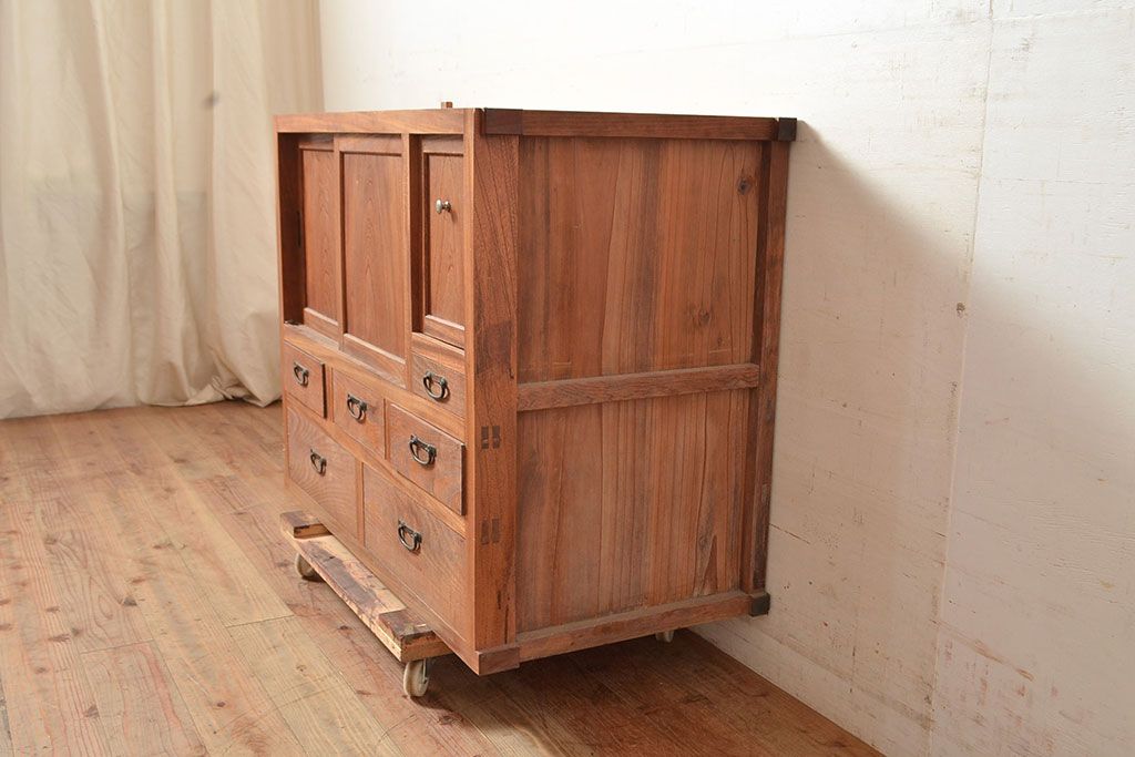 和製アンティーク 前面ケヤキ材 和の趣きを感じさせる、赤味がかった色合いが魅力の箪笥サイドボード(関東水屋箪笥、キャビネット、収納棚)(R-049152)