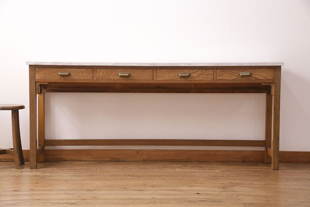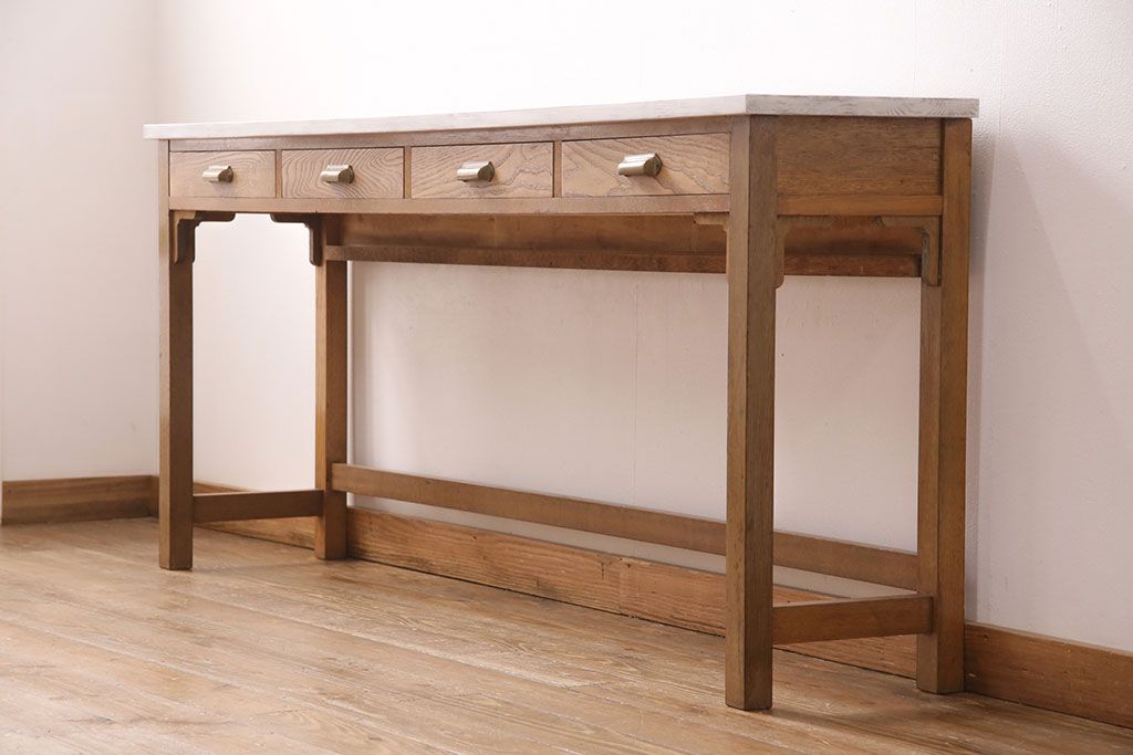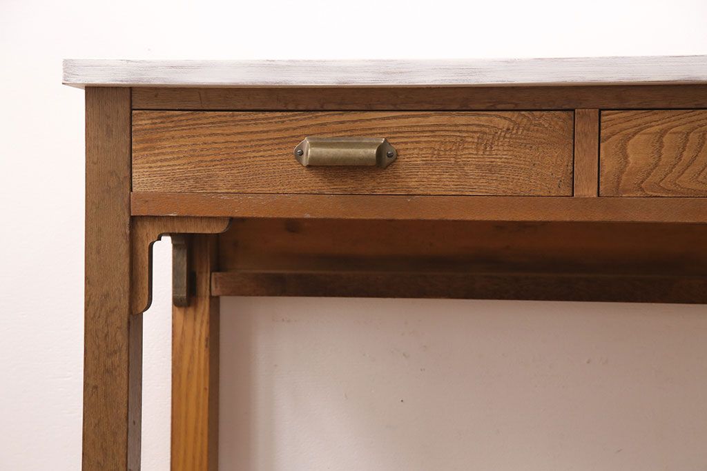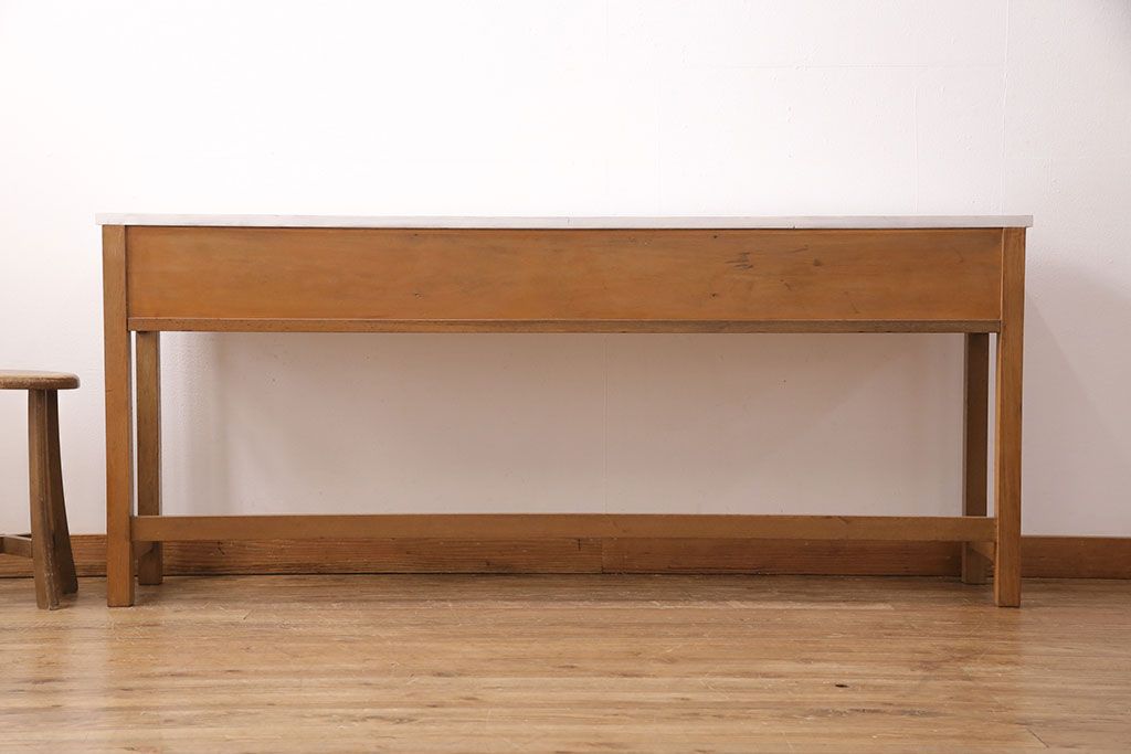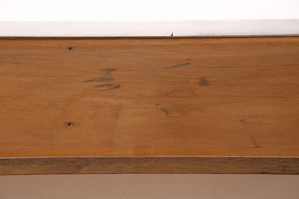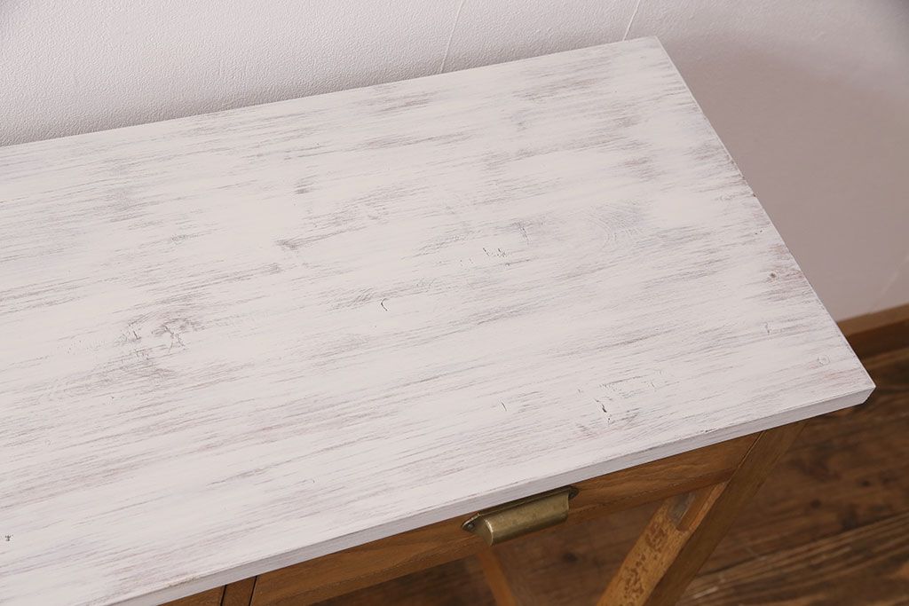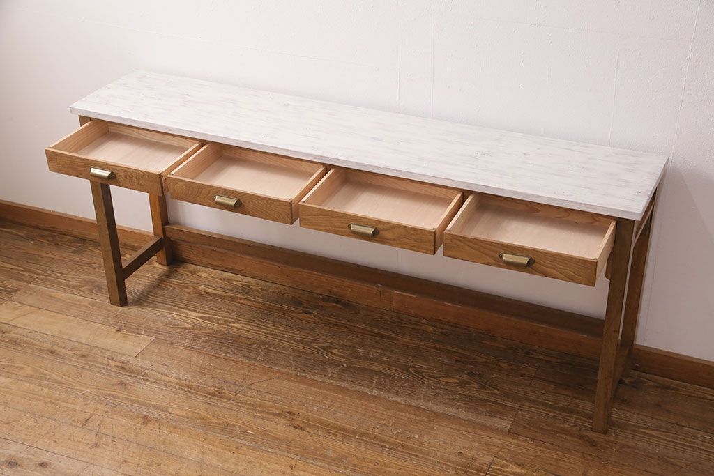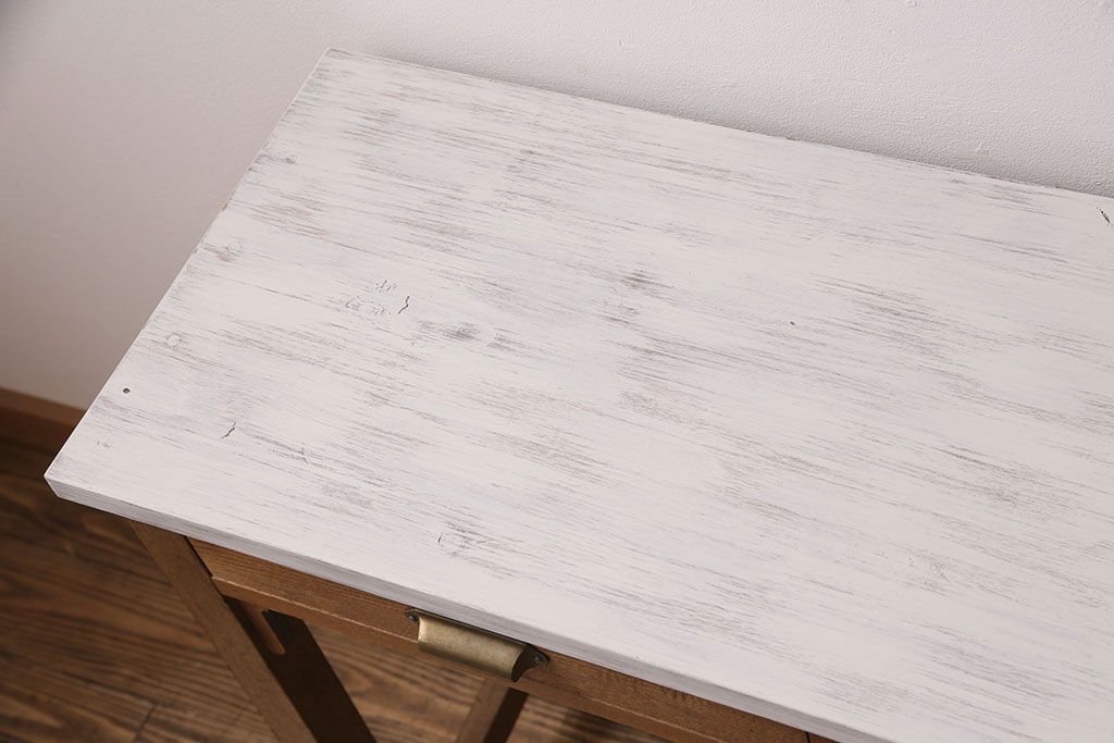 テーブル> コンソールテーブル > 和製アンティーク 天板ペイント・ヒノキ無垢材 ナチュラルで優しい雰囲気がお洒落!使い勝手よくリメイクした作業台(コンソールテーブル、カウンター)(R-049421)