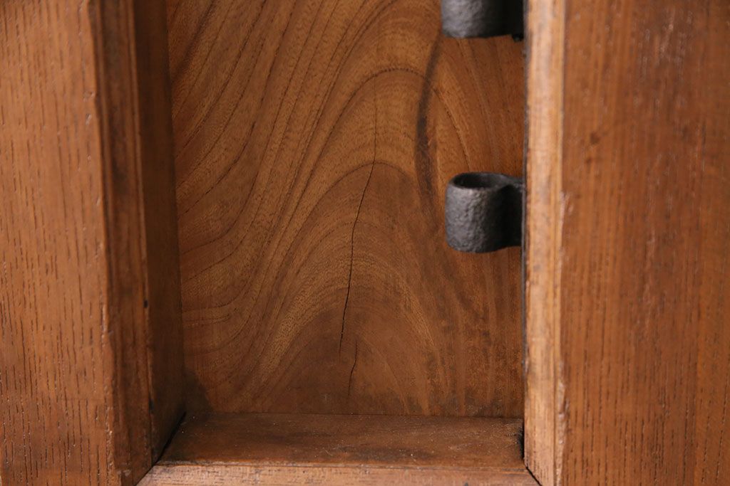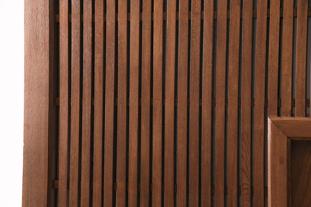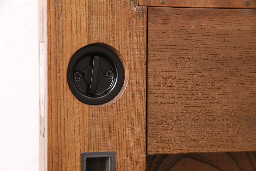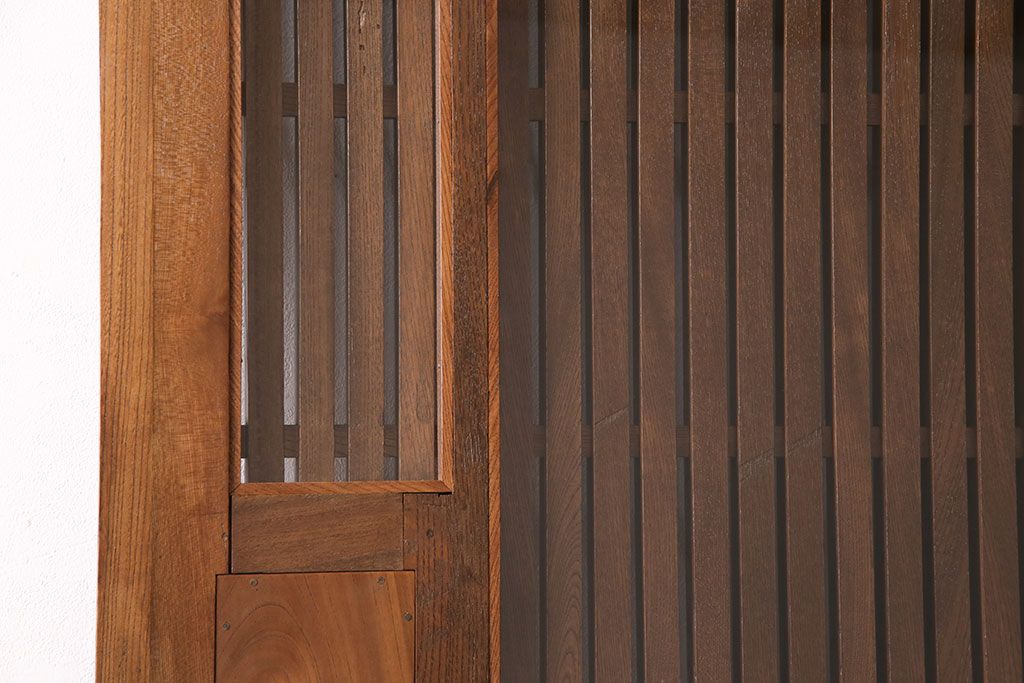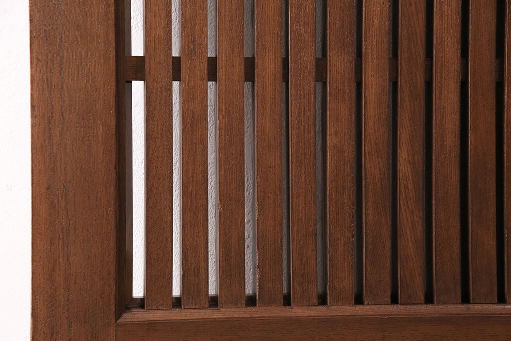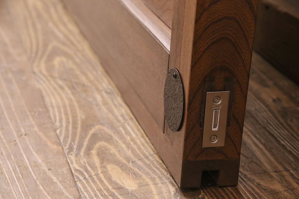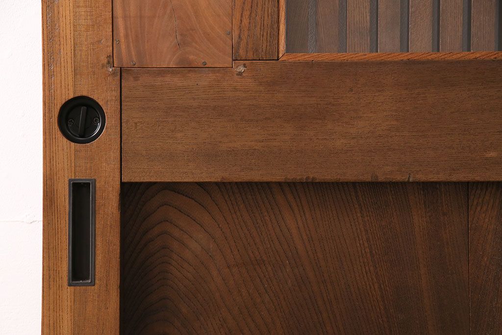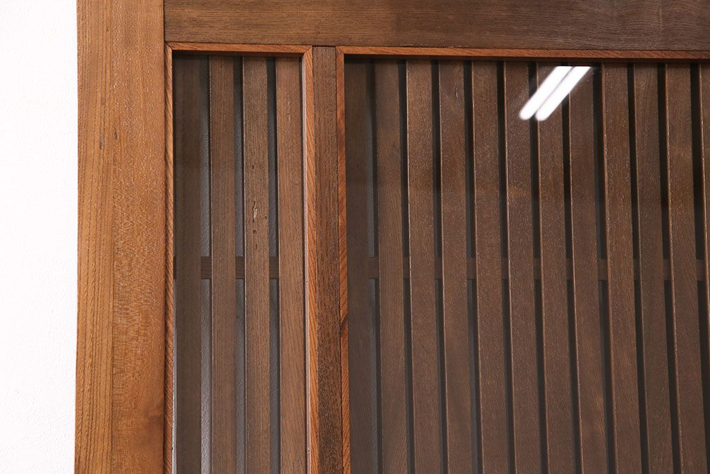 セミオーダー家具実績 > 昭和初期の蔵戸をリペア&カスタム!設置場所に合わせてリサイズ。格子裏にクリアガラスを組み入れ。濃い茶色で着色し仕上げ。(玄関戸、建具)