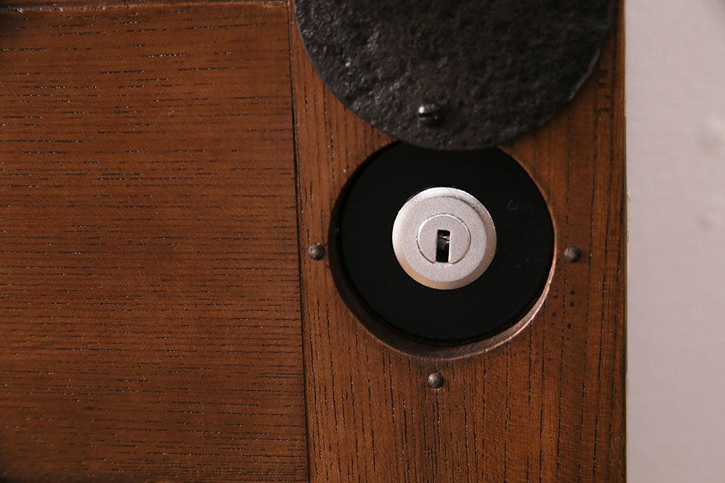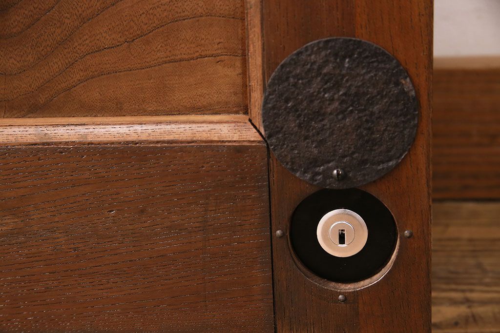 ドア・建具> 玄関ドア・玄関戸 > 昭和初期の蔵戸をリペア&カスタム!設置場所に合わせてリサイズ。格子裏にクリアガラスを組み入れ。濃い茶色で着色し仕上げ。(玄関戸、建具)