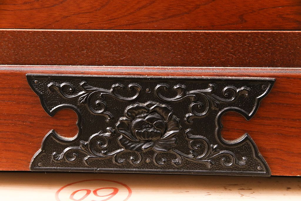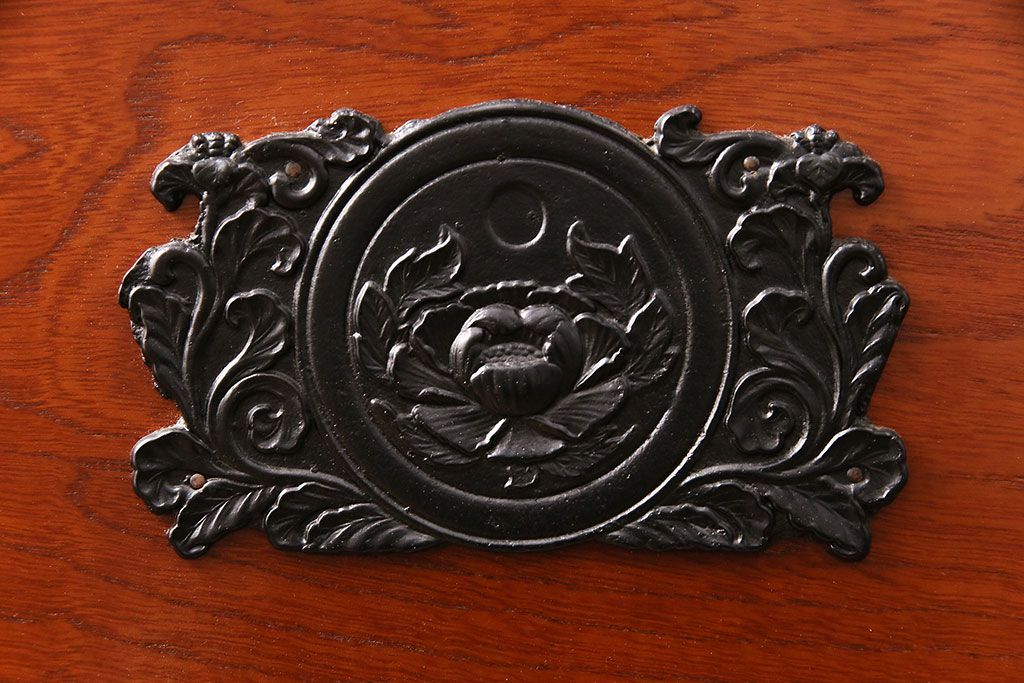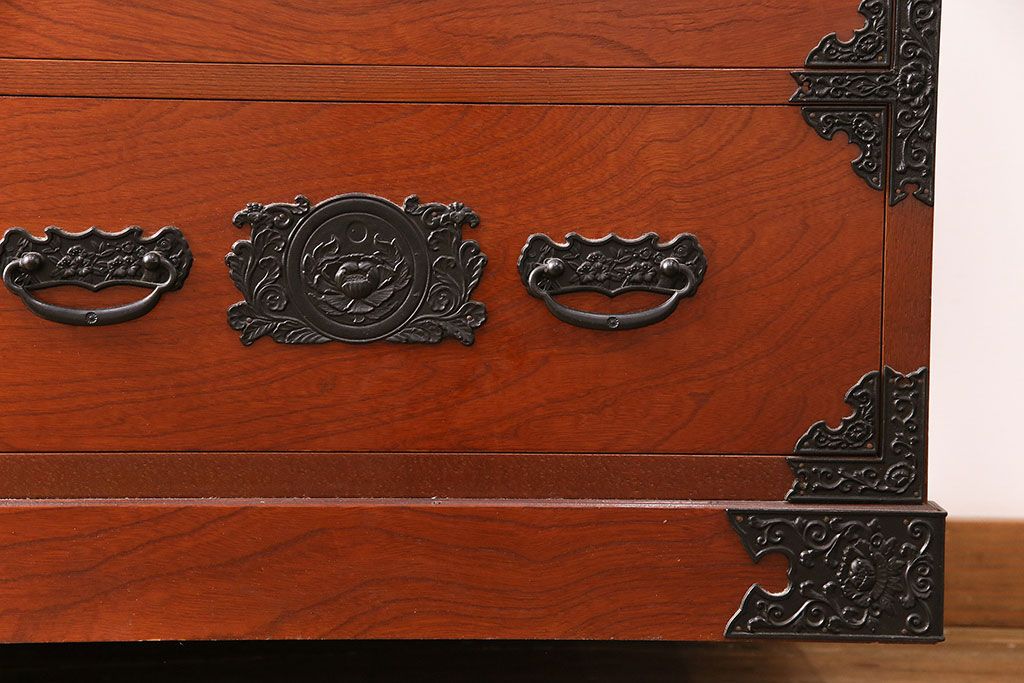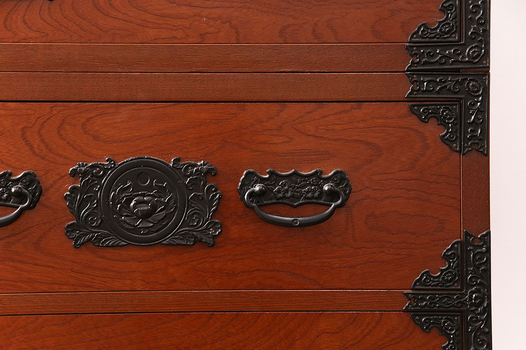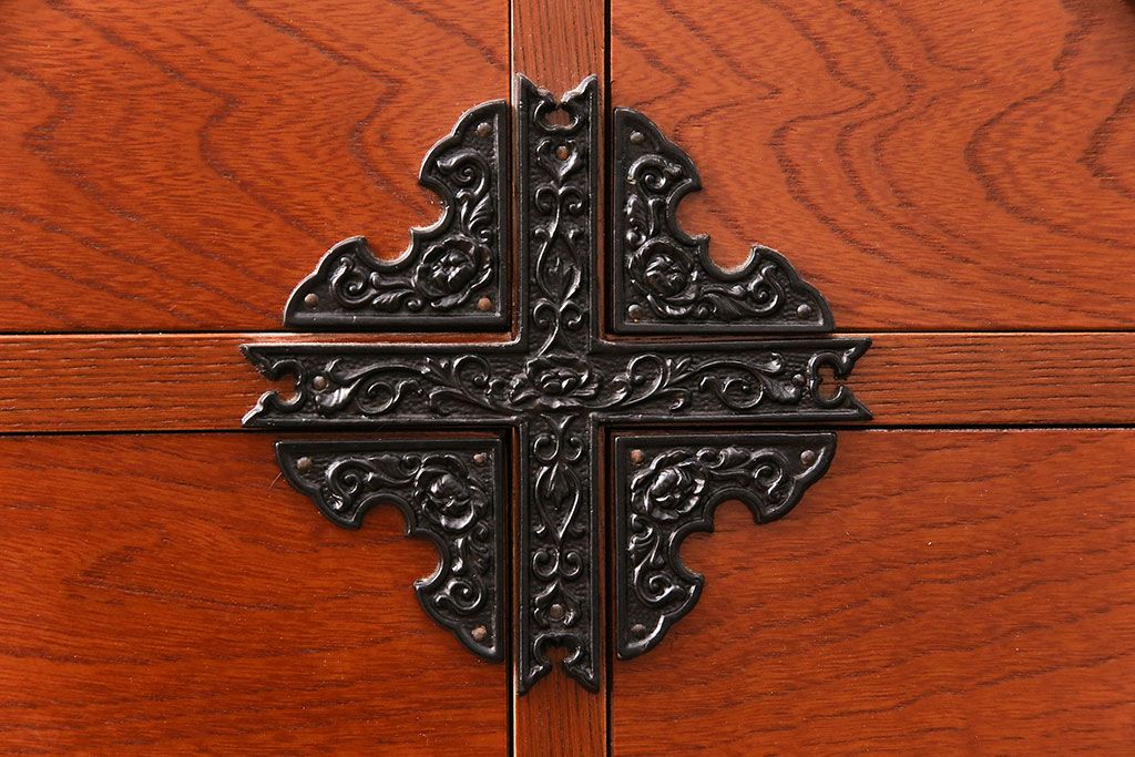 赤みのある木肌に黒い飾り金具が映え、