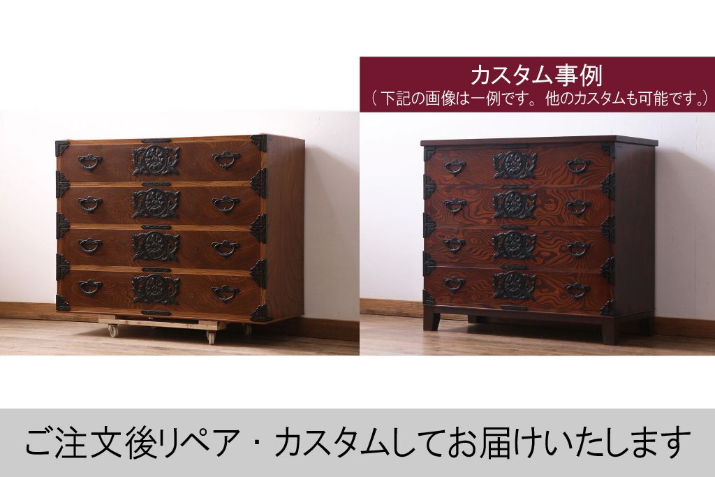 キャビネット・戸棚> サイドボード > 和製ヴィンテージ 岩谷堂箪笥 天板と脚を付けてリメイク!迫力ある杢目が魅力のチェスト(箪笥、引き出し、和タンス、サイドボード、ビンテージ)(R-047332)