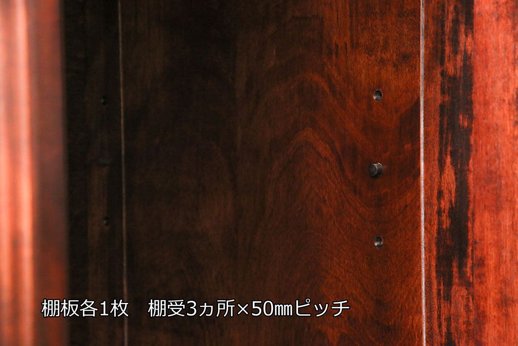 棚板は取り外しできます。棚板は左右各1枚、中央1枚あります。棚受けは各3ヶ所、50mmピッチで調整できます。棚幅サイズのものが1枚の作りです。