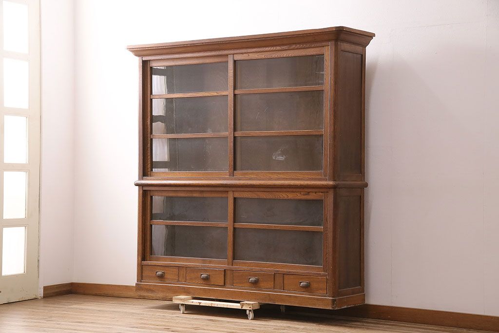 アンティーク家具 栓材 味わい深い木肌とレトロな引手が魅力の重ね戸棚(キャビネット、ガラスケース、ガラス戸棚、収納棚、食器棚、引き出し)(R-048544)です。