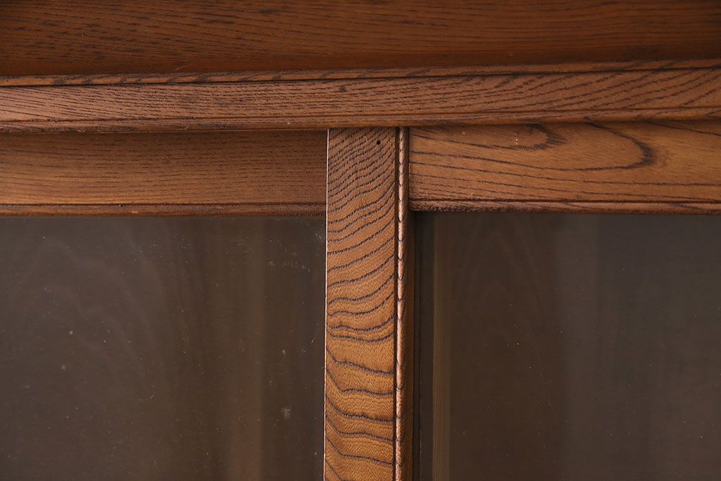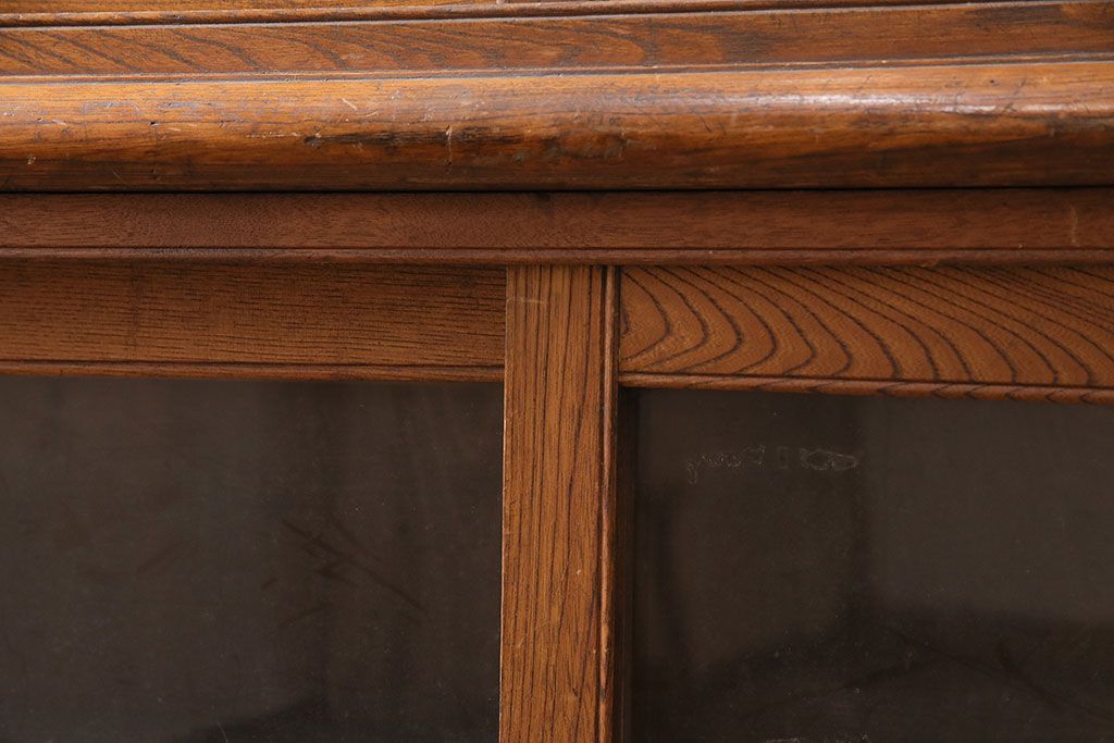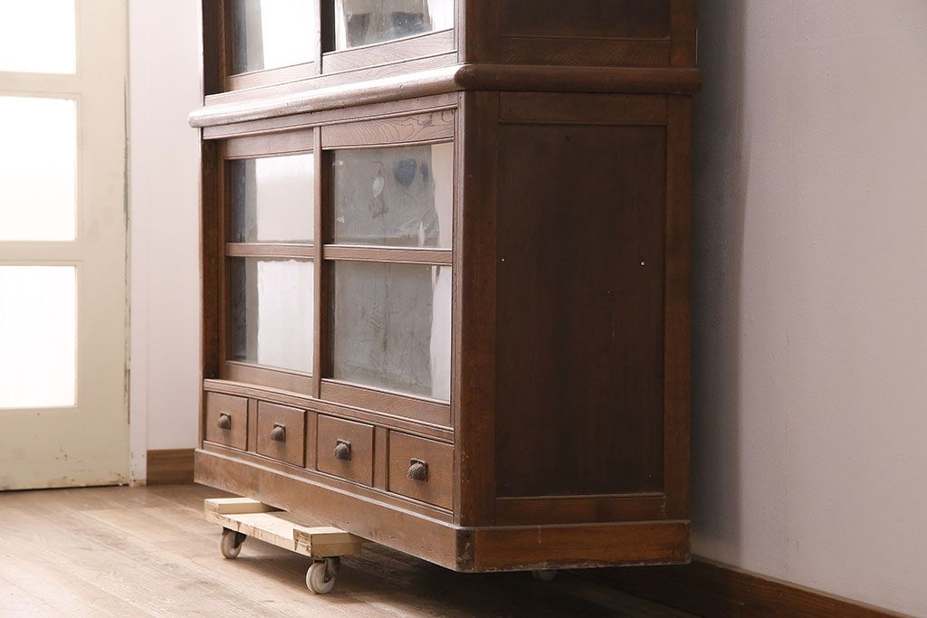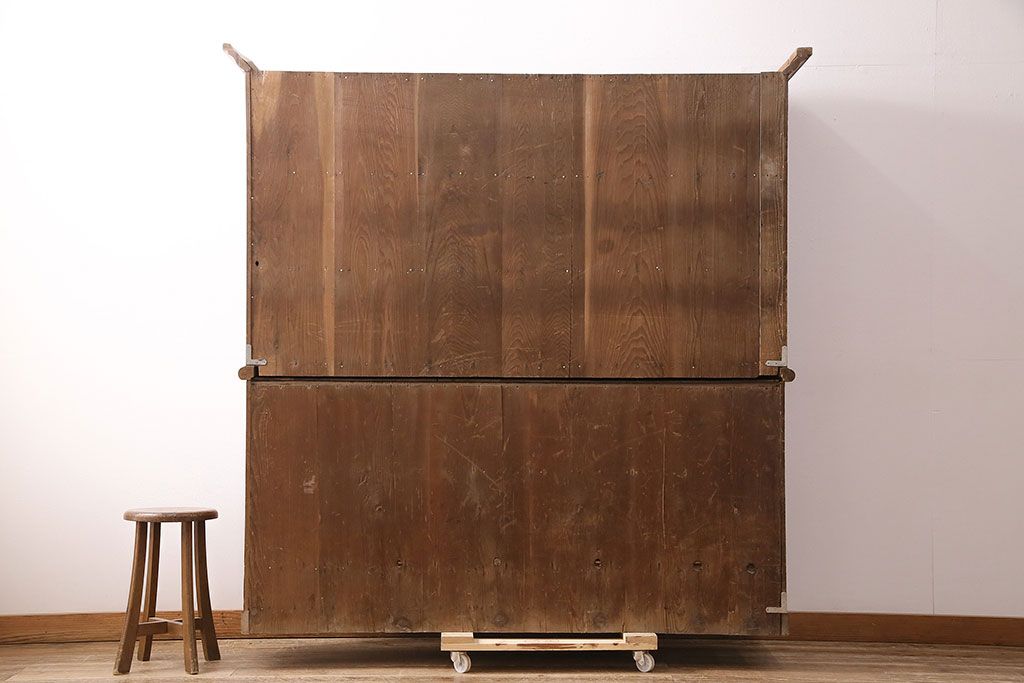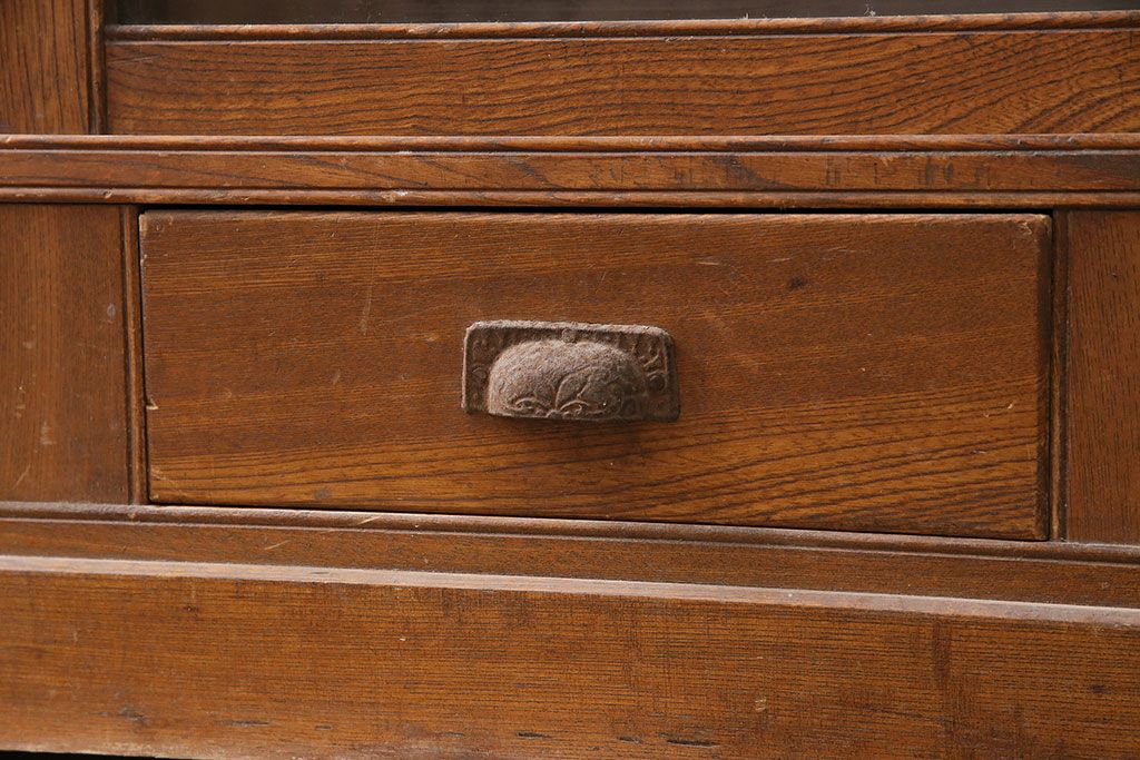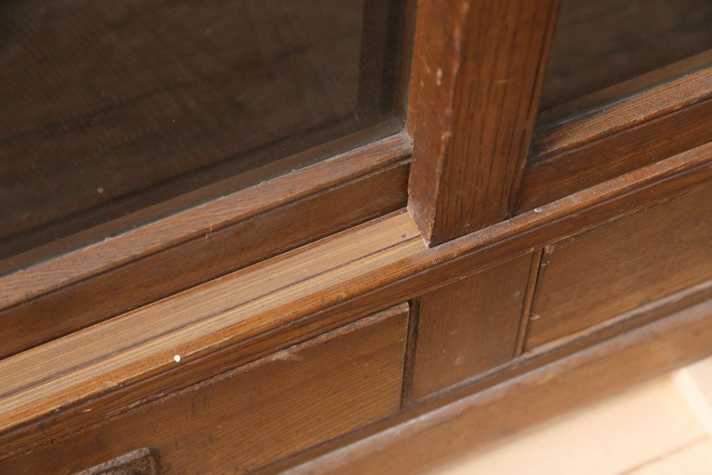 アンティーク家具 栓材 味わい深い木肌とレトロな引手が魅力の重ね戸棚(キャビネット、ガラスケース、ガラス戸棚、収納棚、食器棚、引き出し)(R-048544)