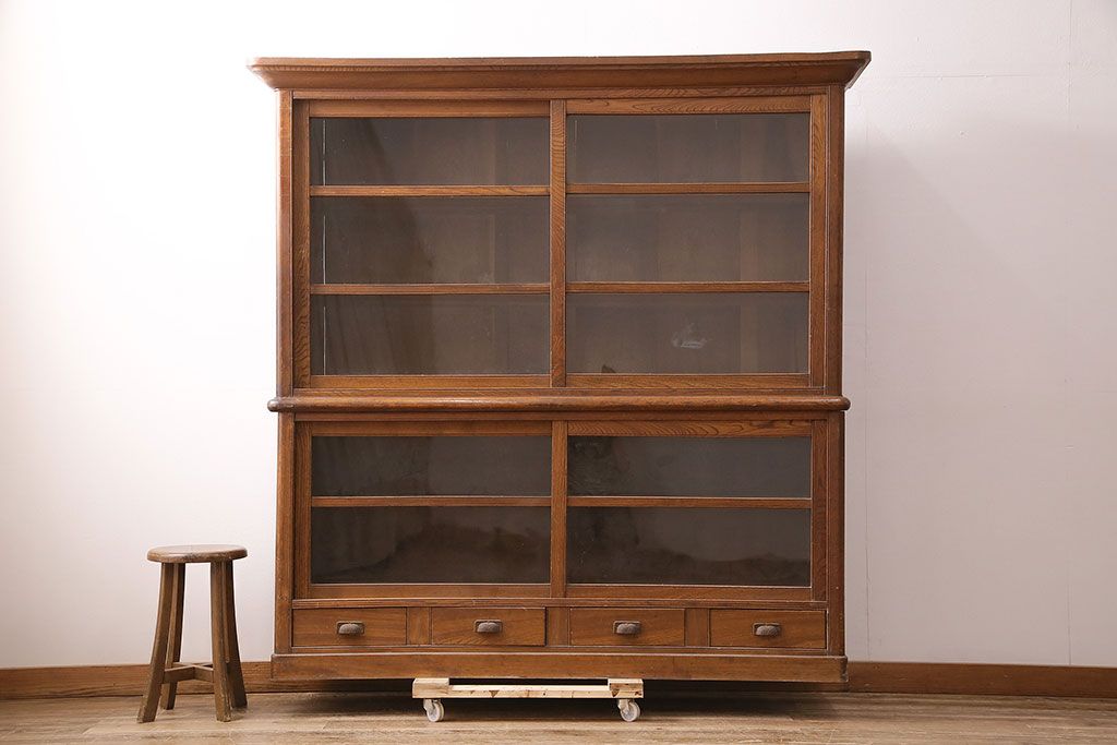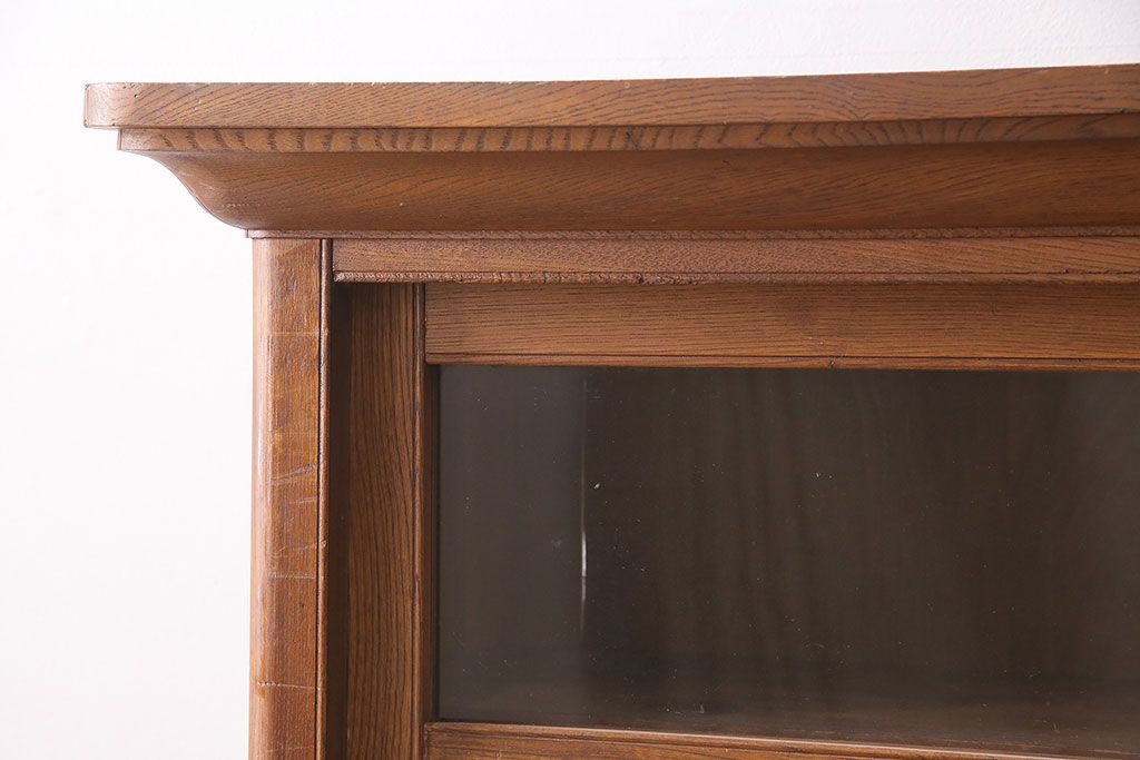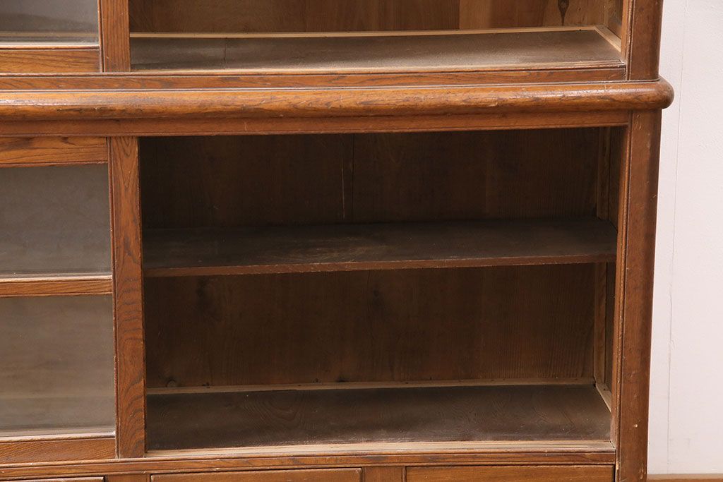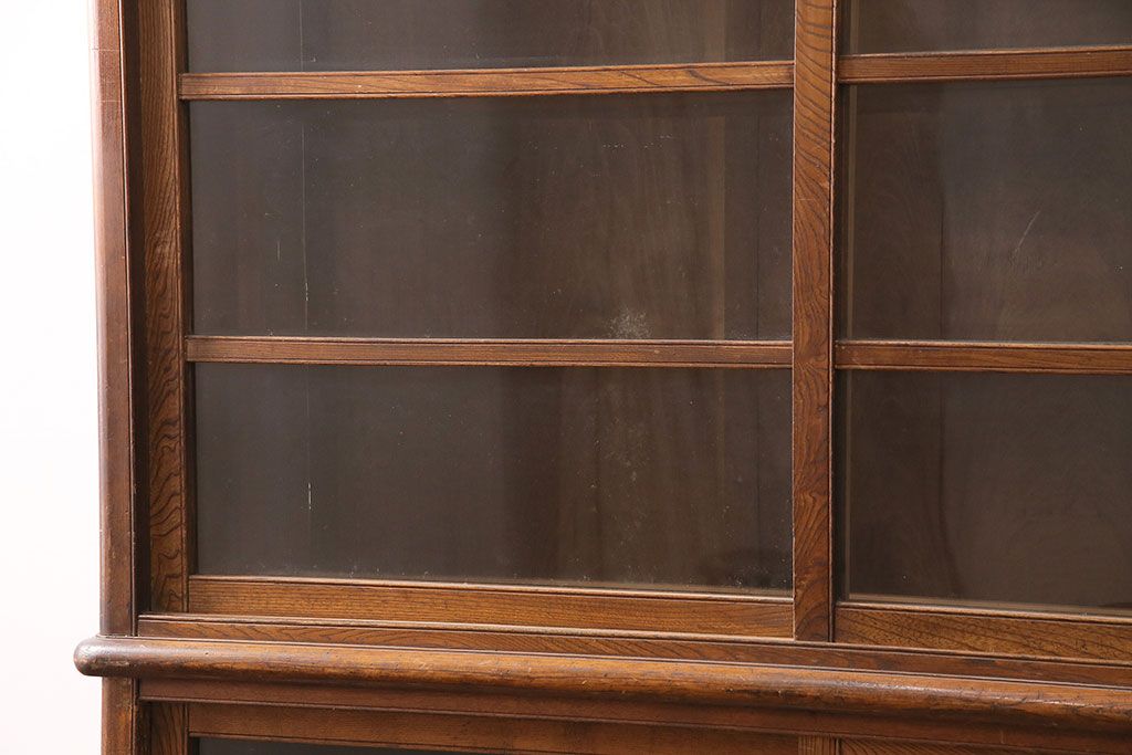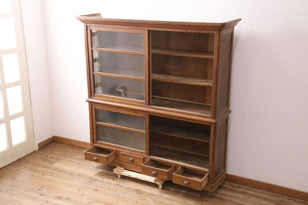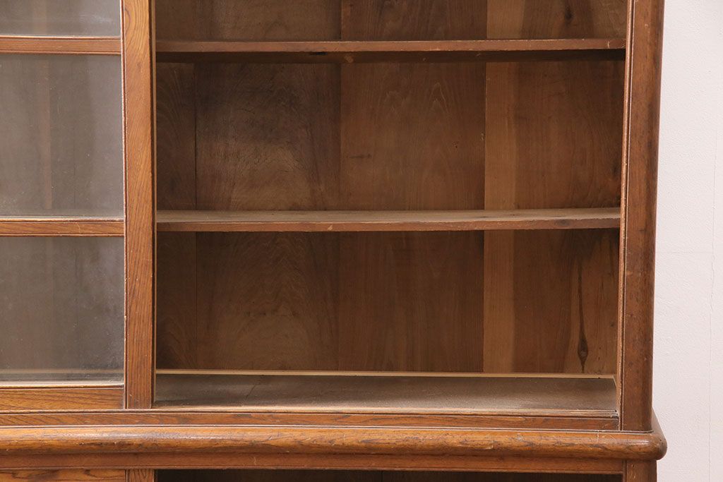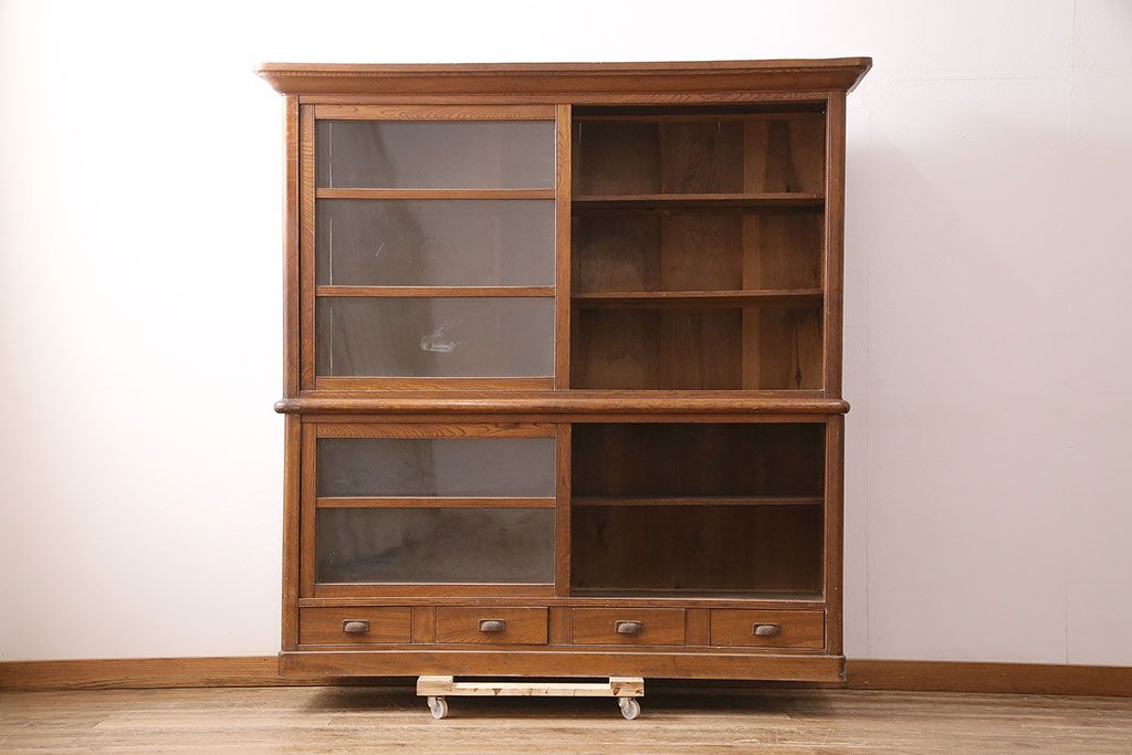 アンティーク家具 栓材 味わい深い木肌とレトロな引手が魅力の重ね戸棚(キャビネット、ガラスケース、ガラス戸棚、収納棚、食器棚、引き出し)(R-048544)