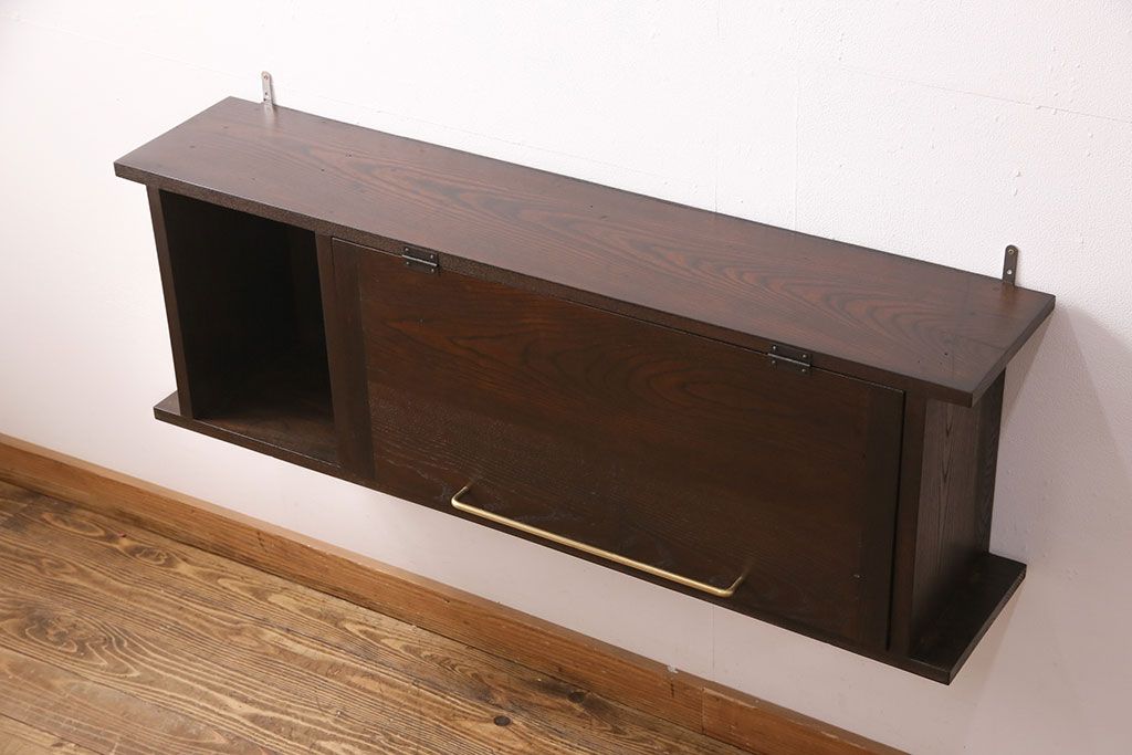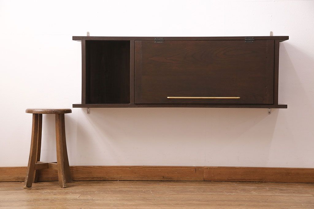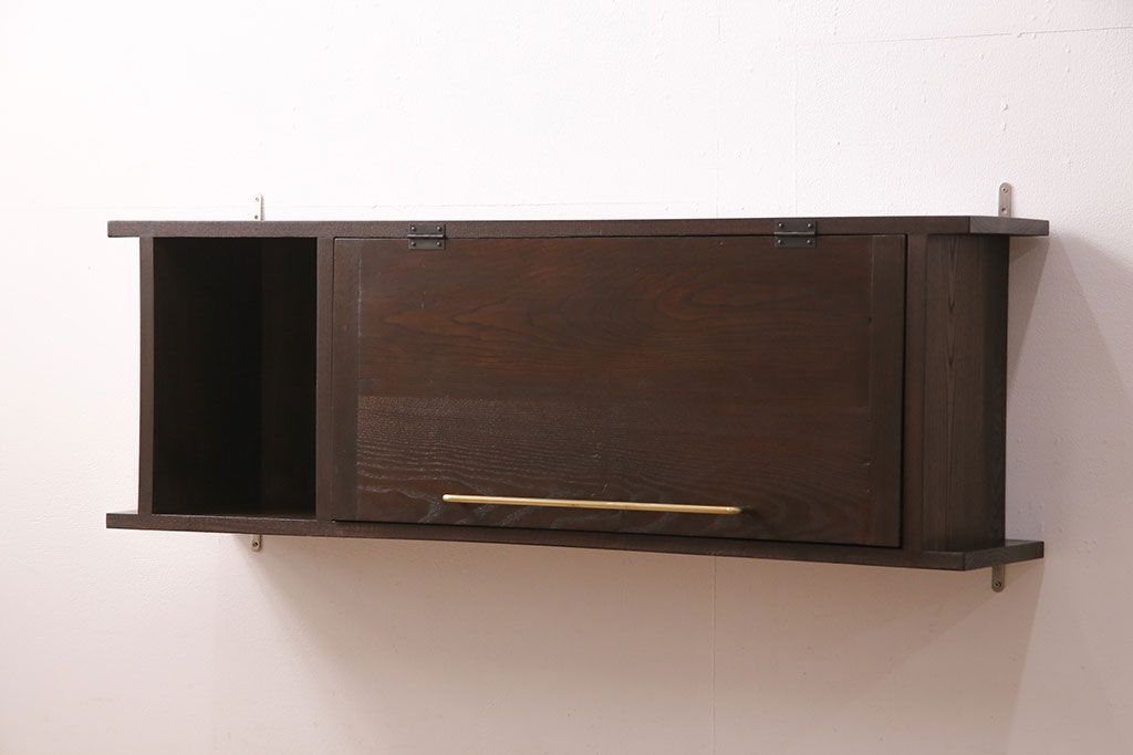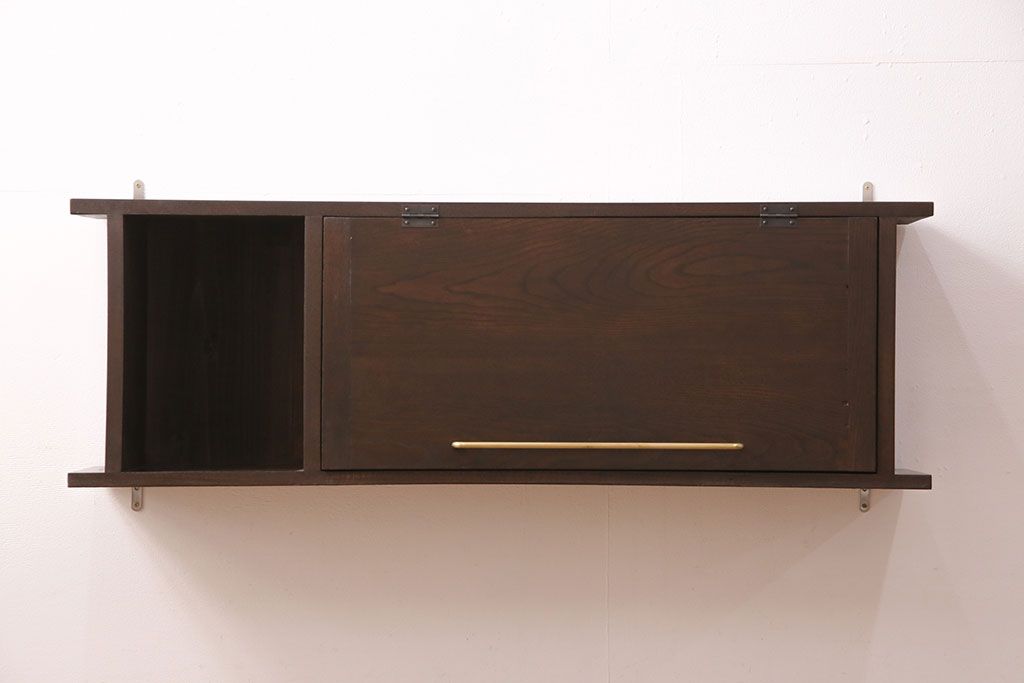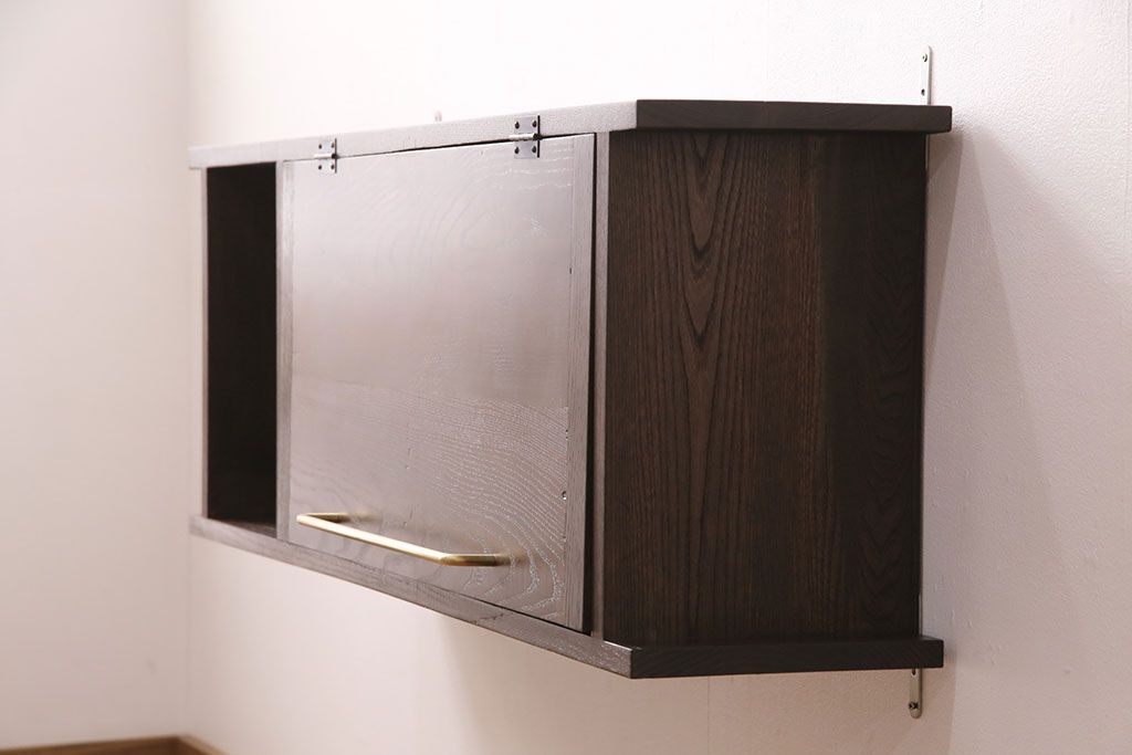ウォールシェルフを新規製作!右側のみパタパタ扉、取っ手を取り付け。取り外し可能な棚板を設置。濃い茶色で着色し仕上げ。(吊り戸棚)
