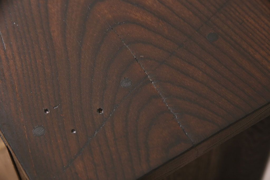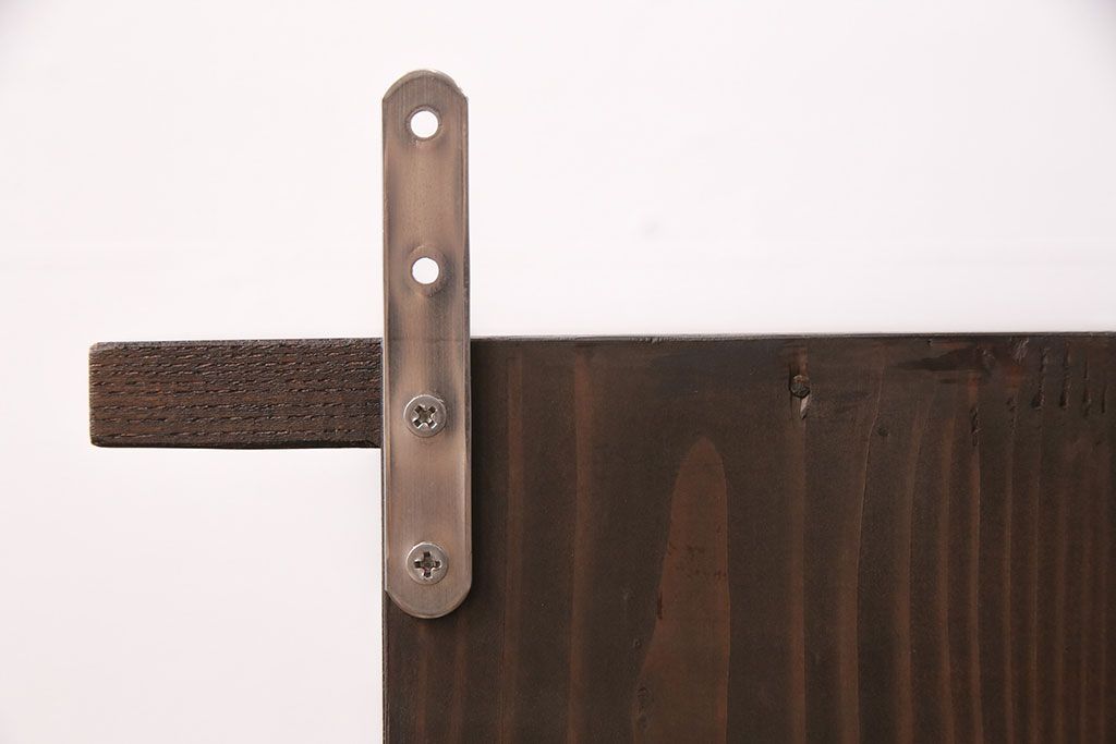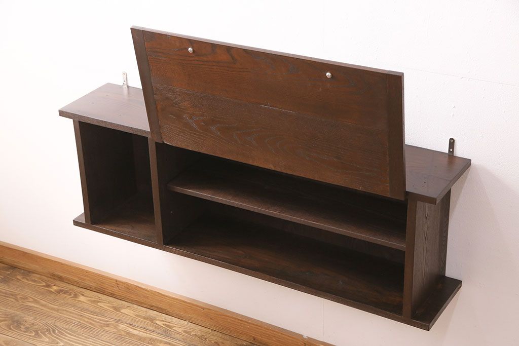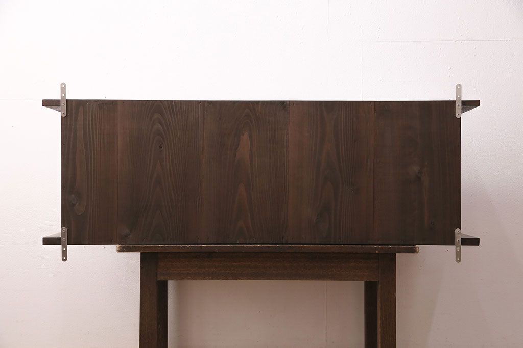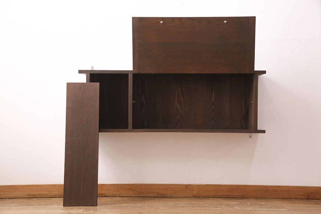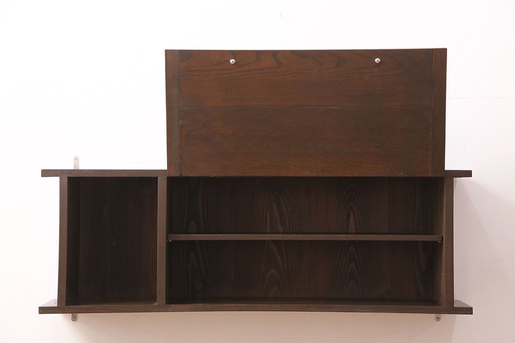 ウォールシェルフを新規製作!右側のみパタパタ扉、取っ手を取り付け。取り外し可能な棚板を設置。濃い茶色で着色し仕上げ。(吊り戸棚)