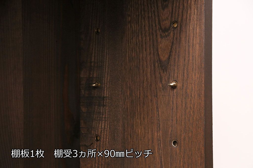 棚板は取り外しできます。棚板は1枚あります。棚受けは3ヶ所、90mmピッチで調整できます。棚幅サイズのものが1枚の作りです。